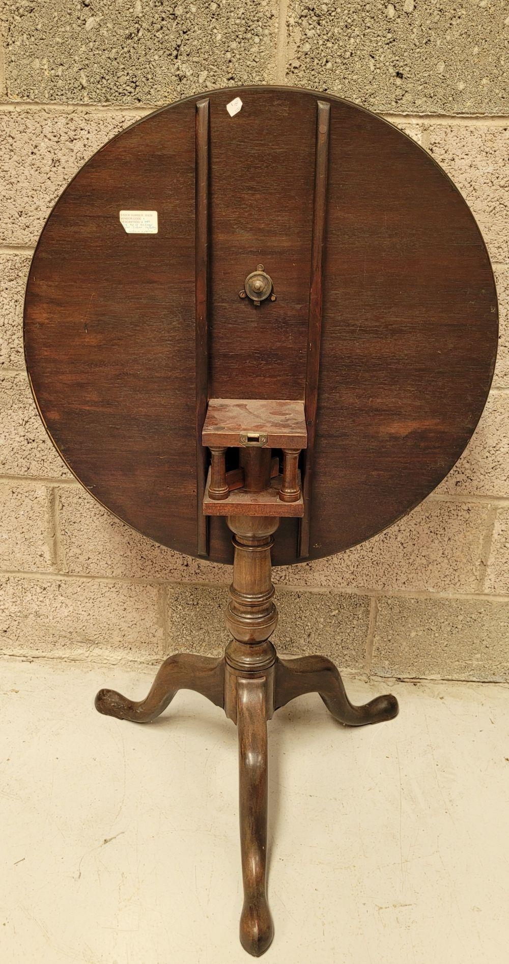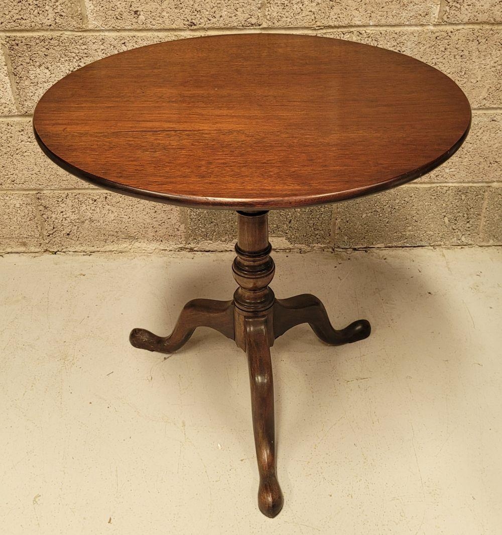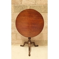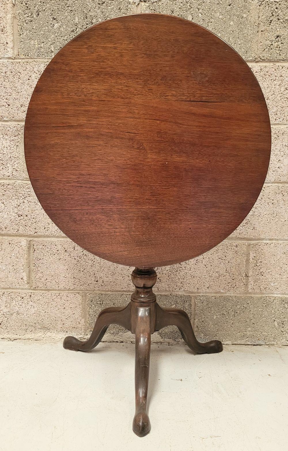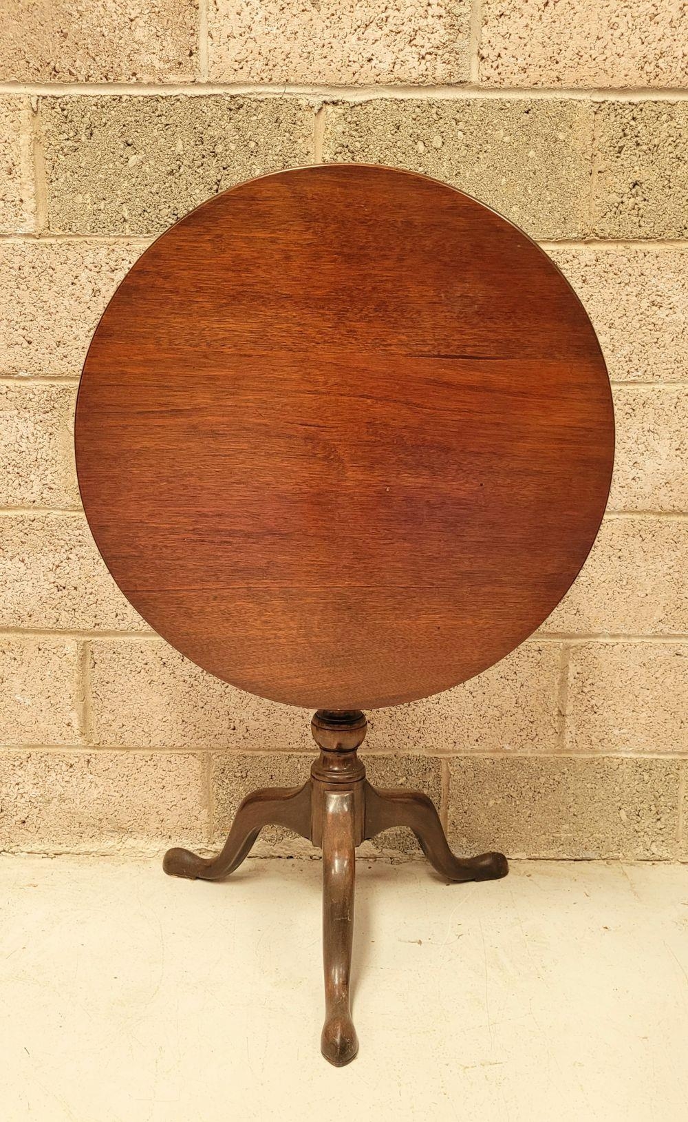 A VERY GOOD QUALITY IRISH MAHOGANY LATE 18TH CENTURY / EARLY 19TH CENTURY TIP UP TABLE, the circular top sits upon a bird-cage support with a hinged edge which allows the top to tip for ease of storage. All raised on turned column support and resting on a tripod leg with pad foot. A great antique piece of furniture that can be used for multiple functions. Condition: excellent over all, there is a minor crack on the bird-cage support to the back – which can be easily mended – sold as photographed. Dimensions: 116.5cm tall when tipped up. Table down: 73cm tall x 77cm wide at the top.