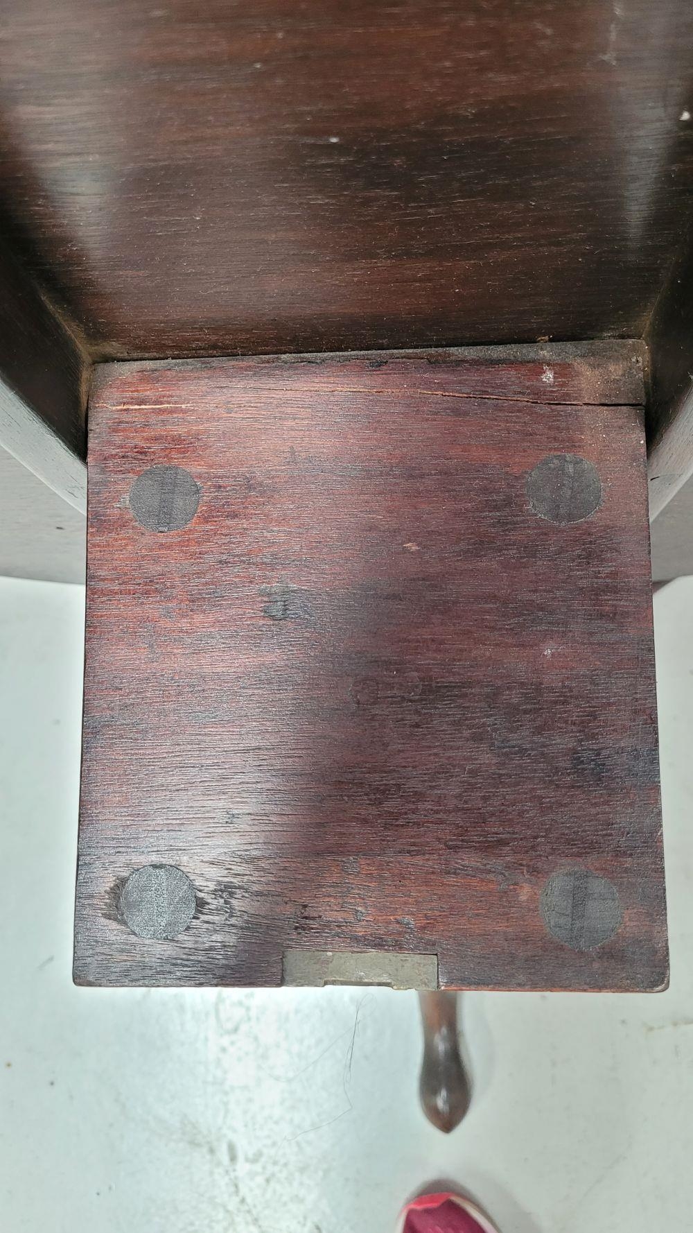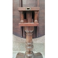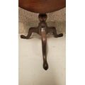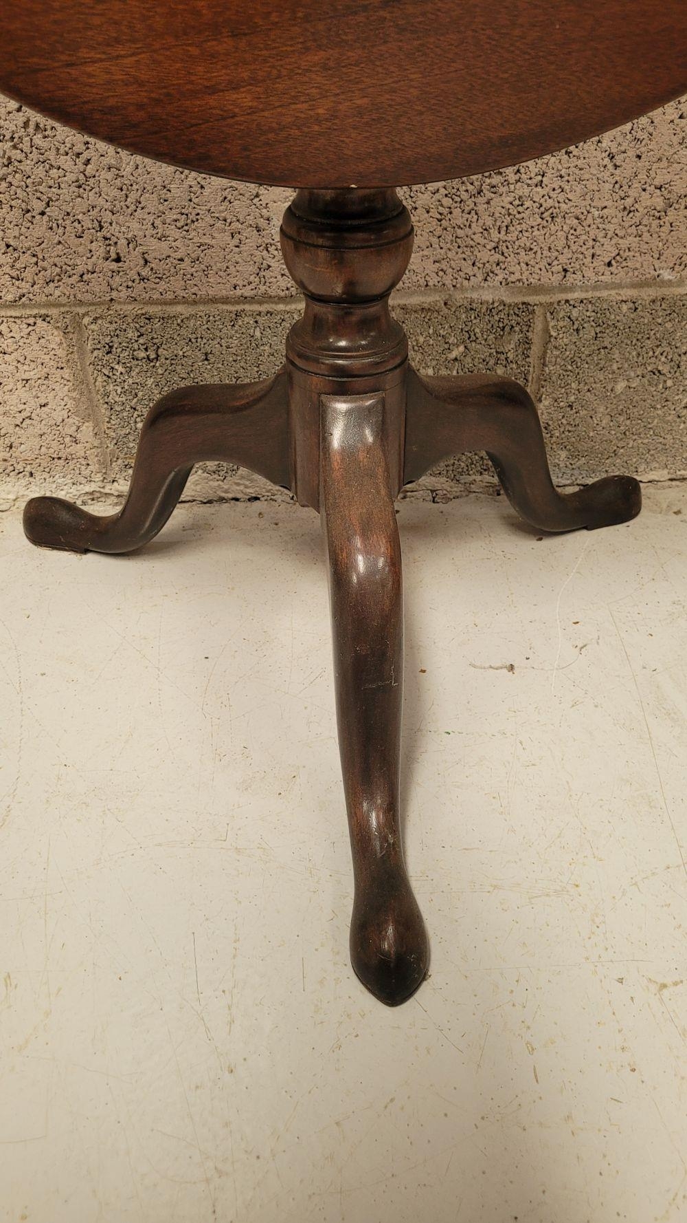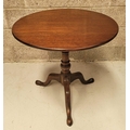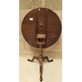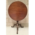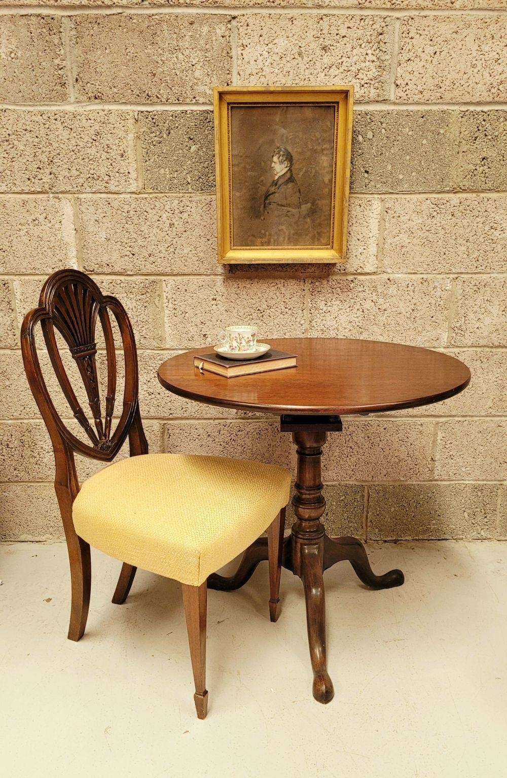 A VERY GOOD QUALITY IRISH MAHOGANY LATE 18TH CENTURY / EARLY 19TH CENTURY TIP UP TABLE, the circular top sits upon a bird-cage support with a hinged edge which allows the top to tip for ease of storage. All raised on turned column support and resting on a tripod leg with pad foot. A great antique piece of furniture that can be used for multiple functions. Condition: excellent over all, there is a minor crack on the bird-cage support to the back – which can be easily mended – sold as photographed. Dimensions: 116.5cm tall when tipped up. Table down: 73cm tall x 77cm wide at the top.