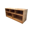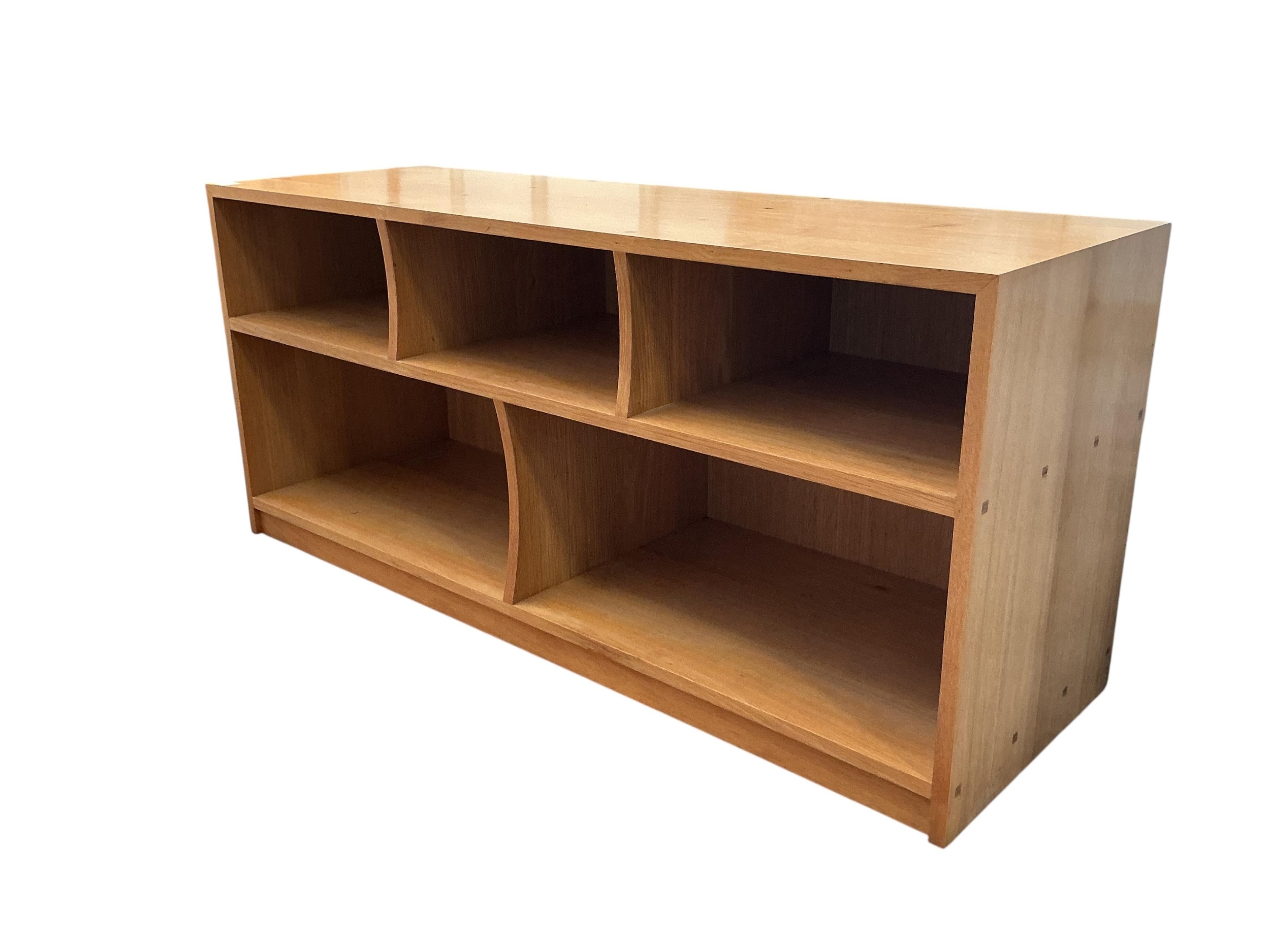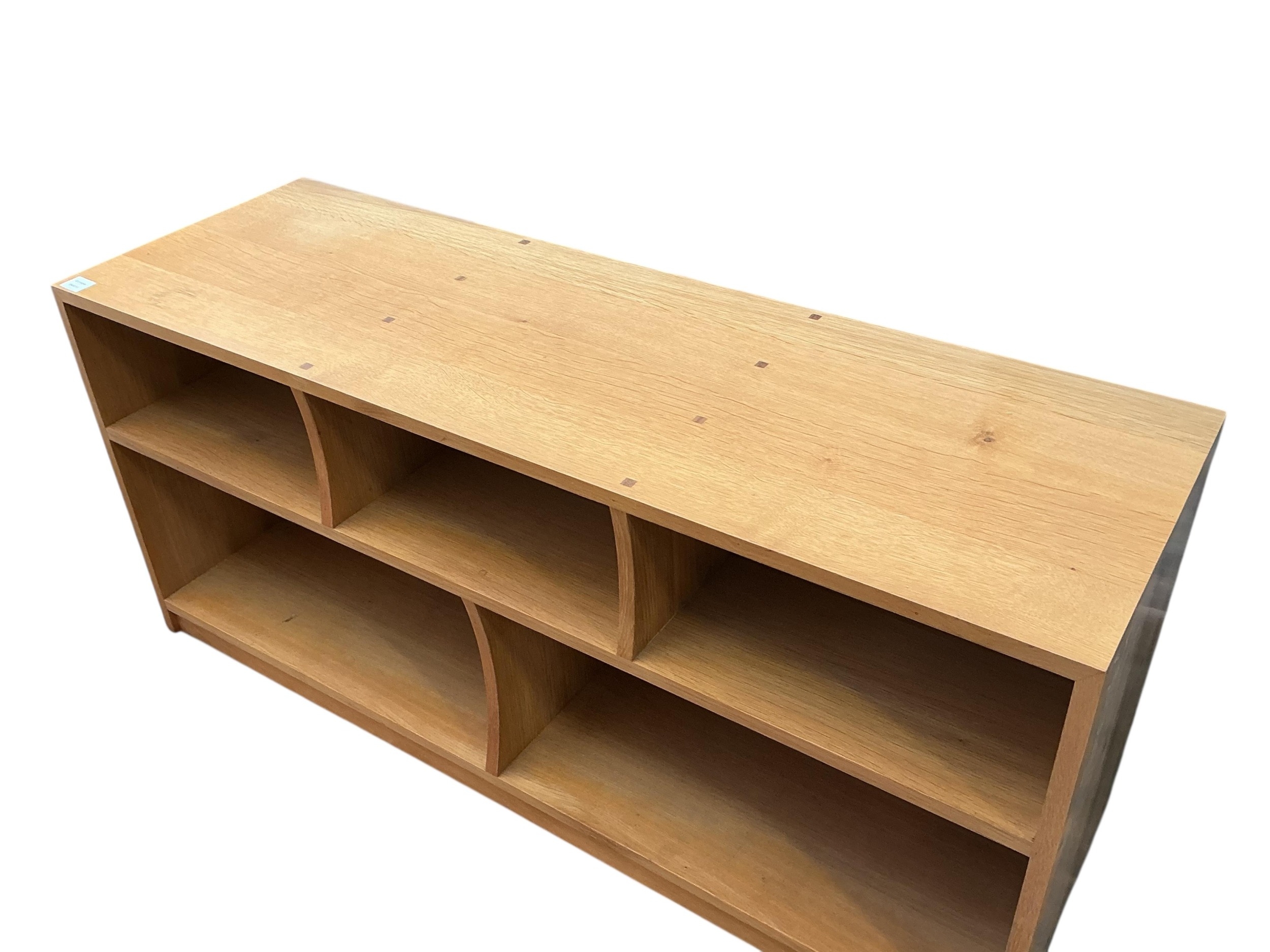 A Contemporary bespoke oak low open bookshelf, width 141cm, depth 46cm, height 63cm