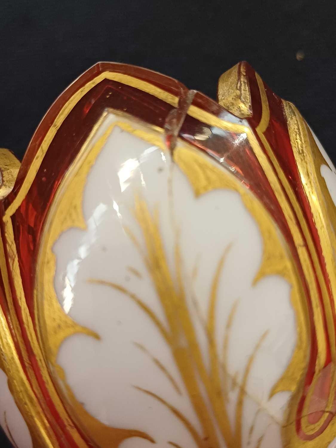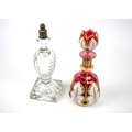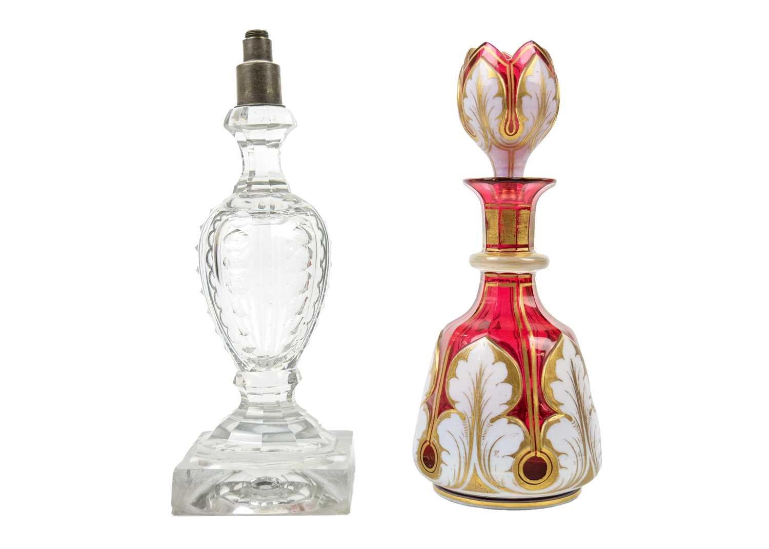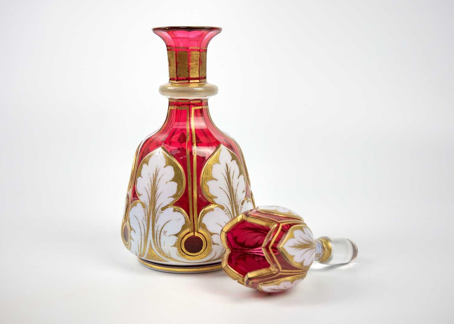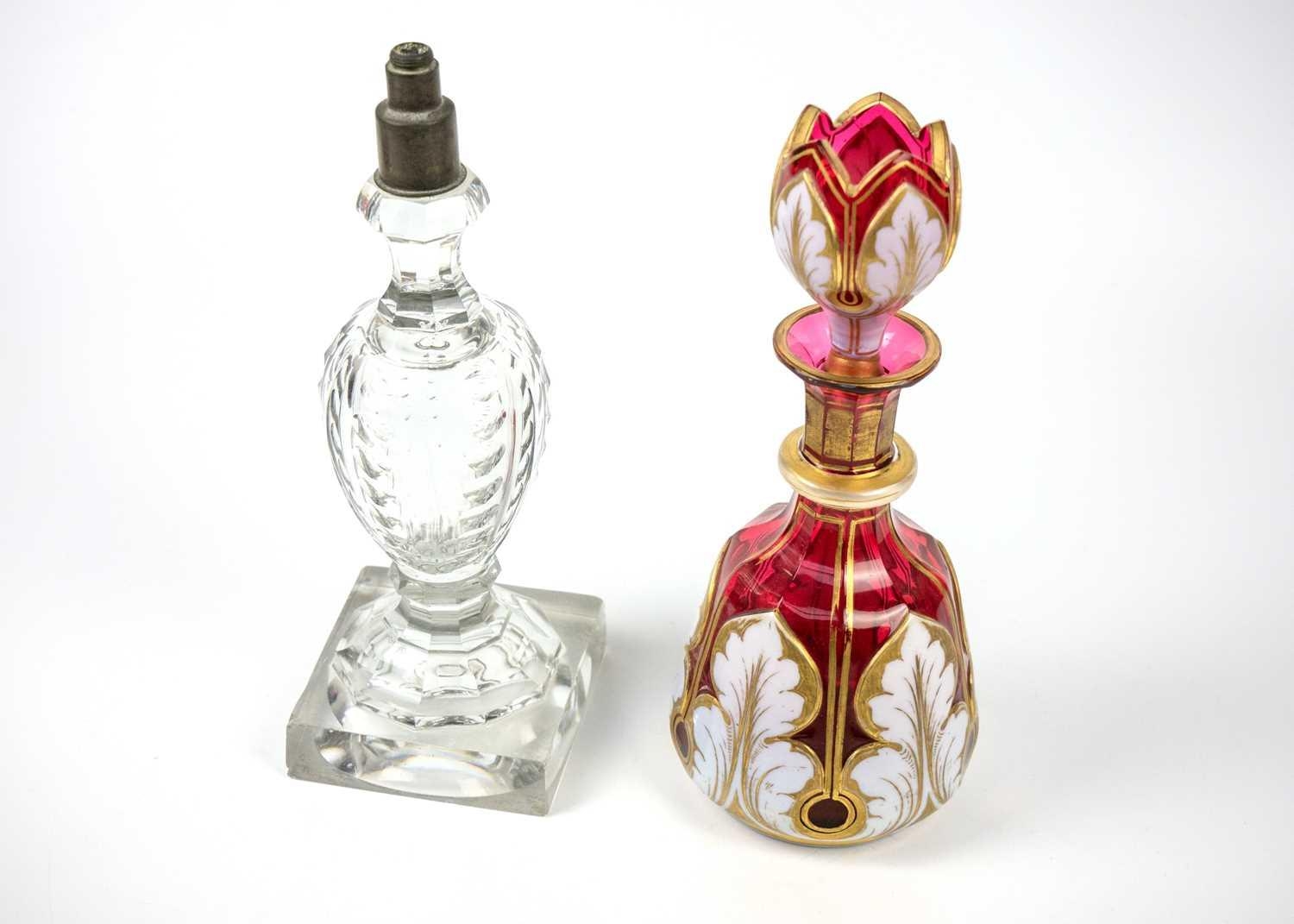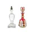 A Bohemian cranberry flash white overlay glass decanter and stopper. Height 23.5cm, together with a cut glass lamp base. (2) Decanter- The stopper has a crack near the top and there is some wear to the gilt. The lamp base has a few nibbles on the square base.