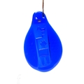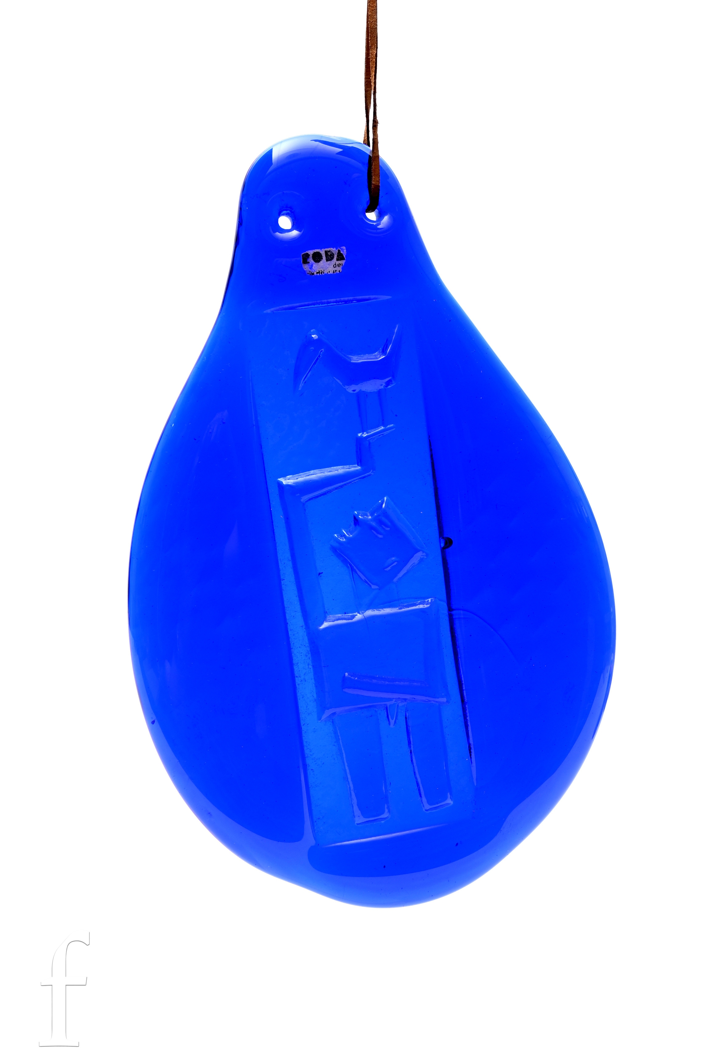 Erik Höglund for Boda, a mid Century Scandinavian blue glass suncatcher, of teardrop form, impressed with a stylised man holding a bird within rectangular textured panel, with original paper label and leather hanging cords, height 26cm.