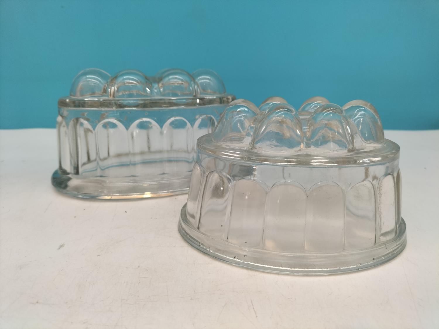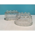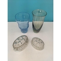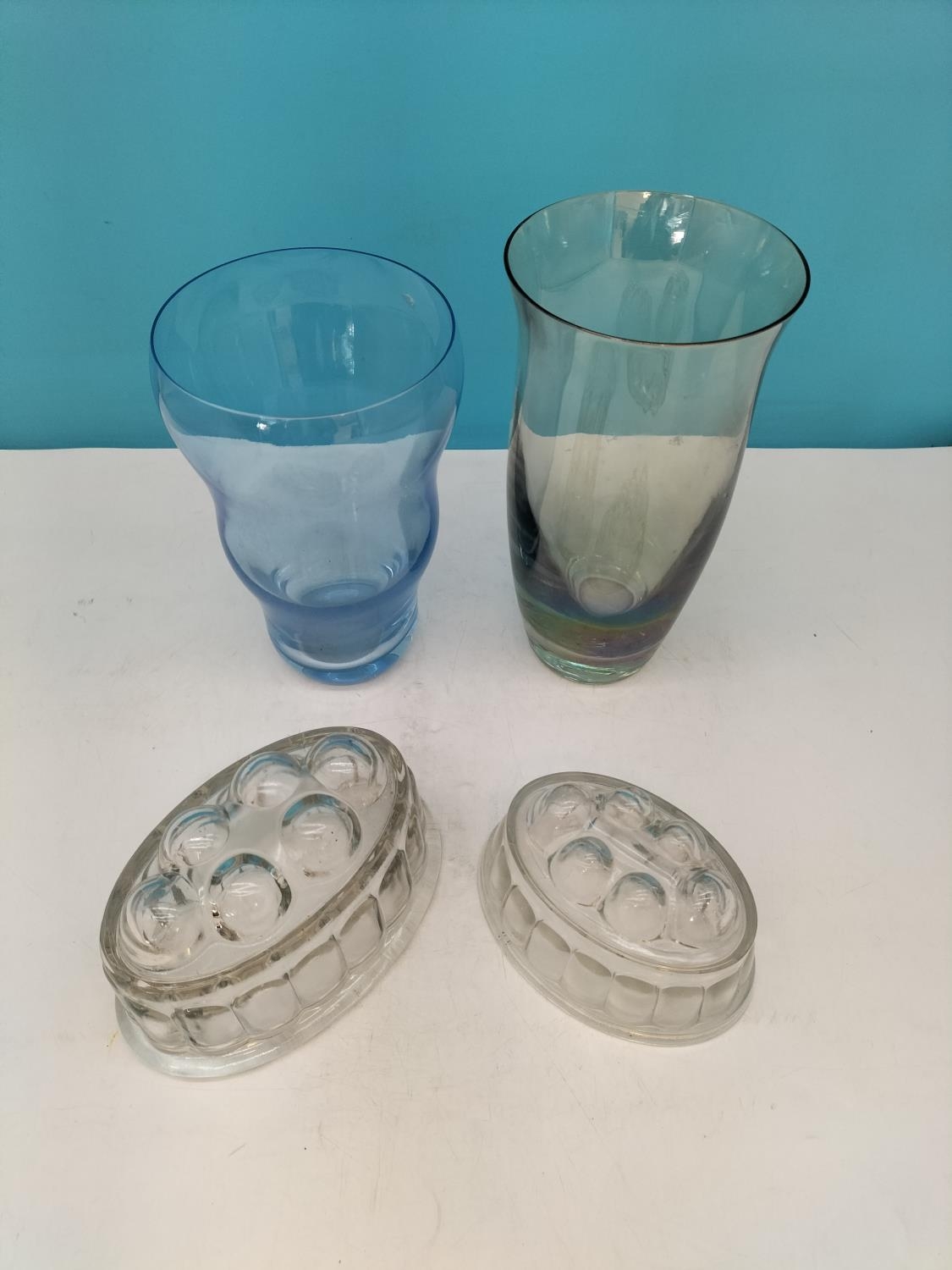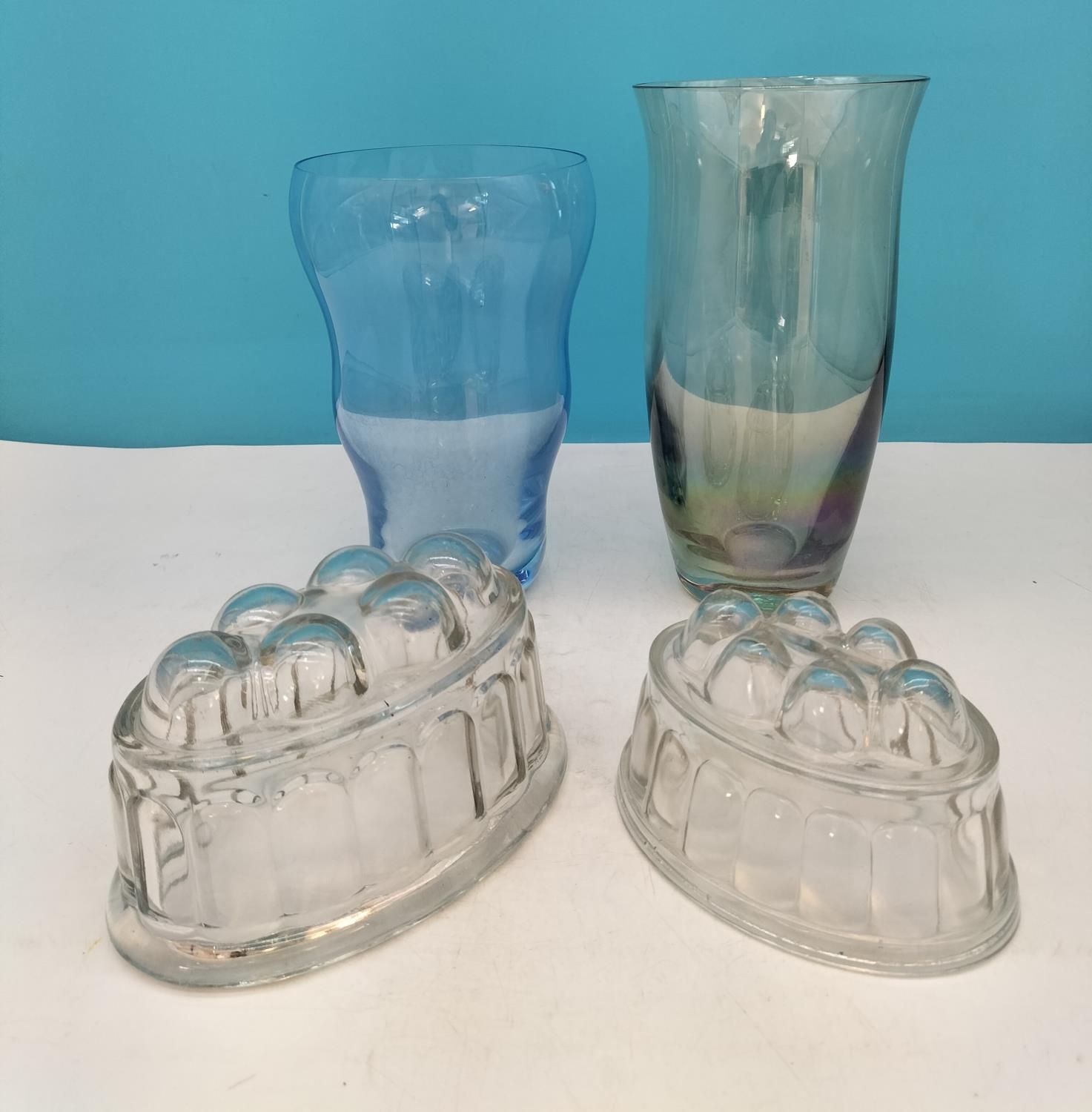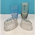 Coloured Glass Vases (2) plus Pressed Glass Jelly Moulds (2). Tallest 23cm.
