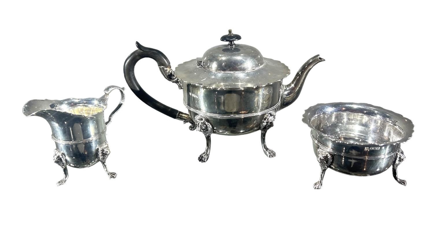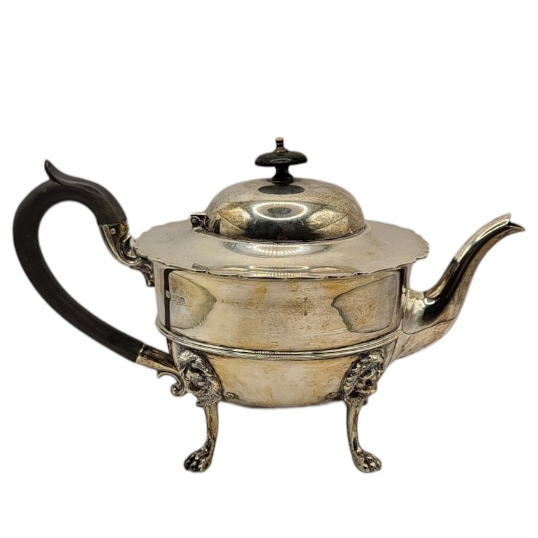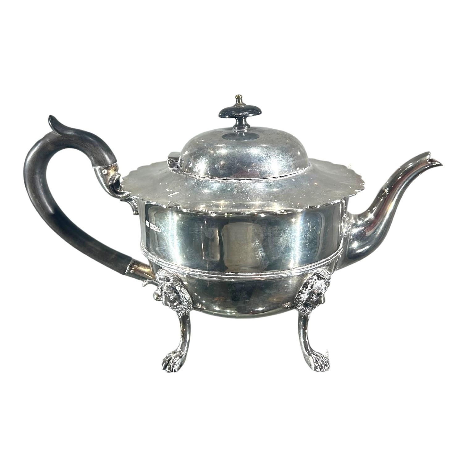 Teapot having reeded band decoration, stylised lion mask and paw feet, carved wood thumb grip handle and finial. (teapot h 16.5cm x w 27.5cm x d 15.5cm, gross weight 1198.3g)