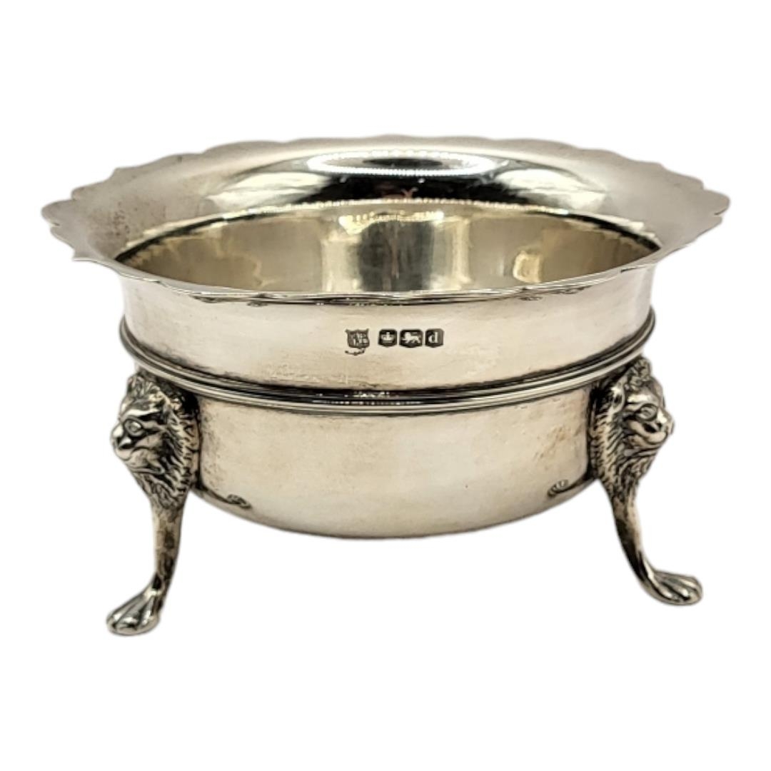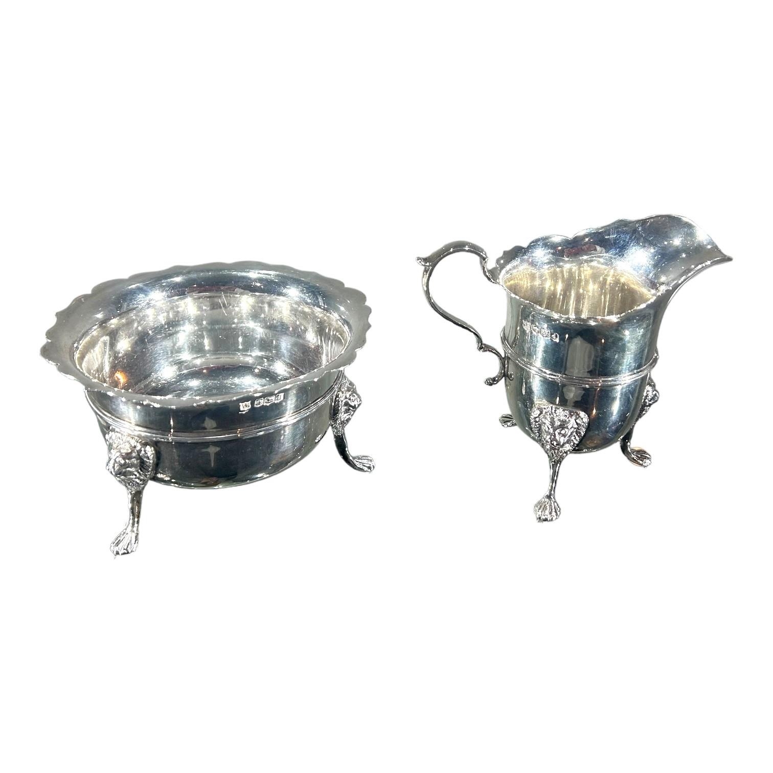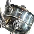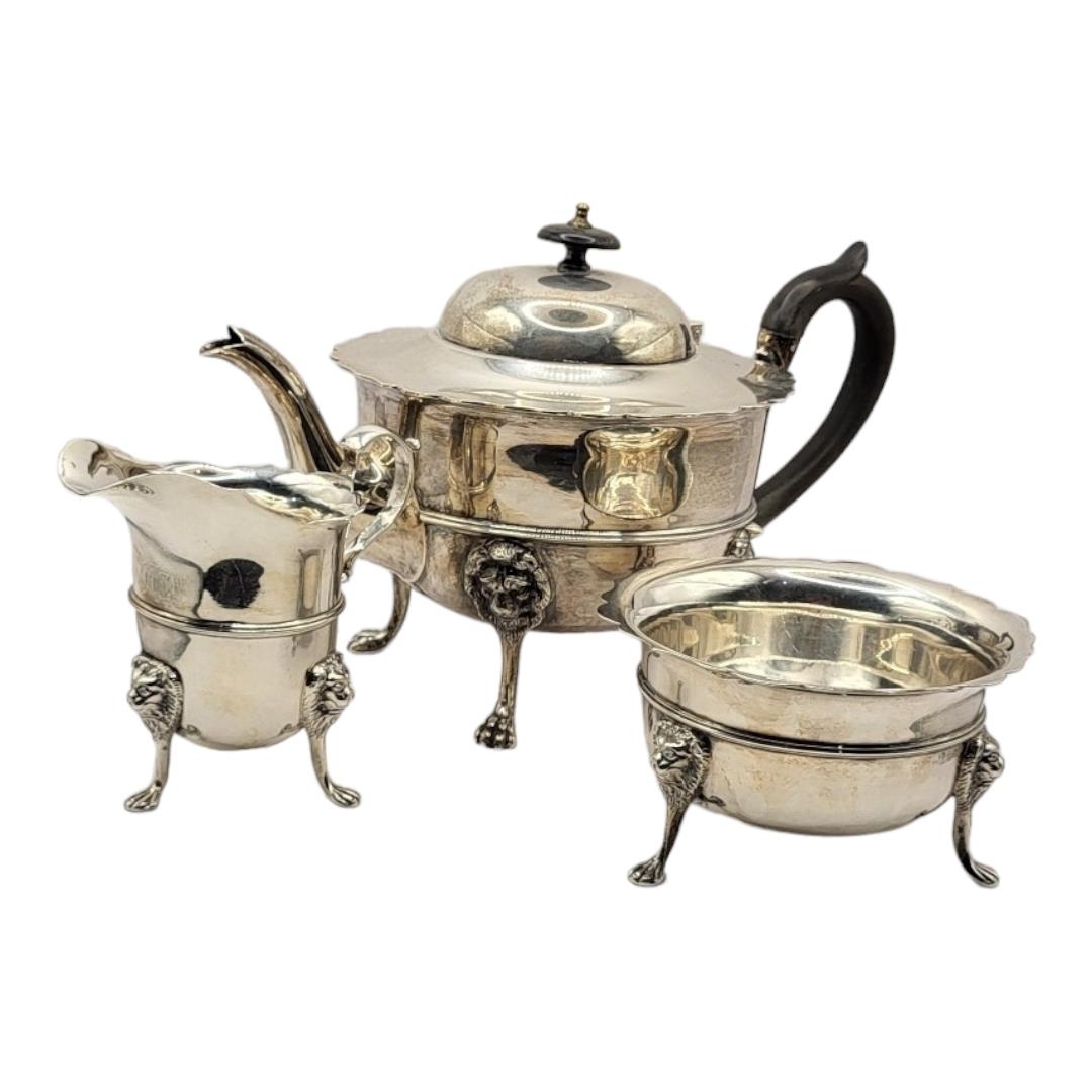 Teapot having reeded band decoration, stylised lion mask and paw feet, carved wood thumb grip handle and finial. (teapot h 16.5cm x w 27.5cm x d 15.5cm, gross weight 1198.3g)