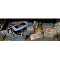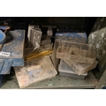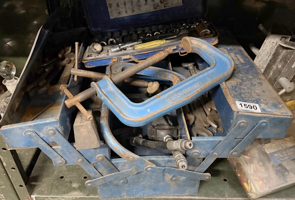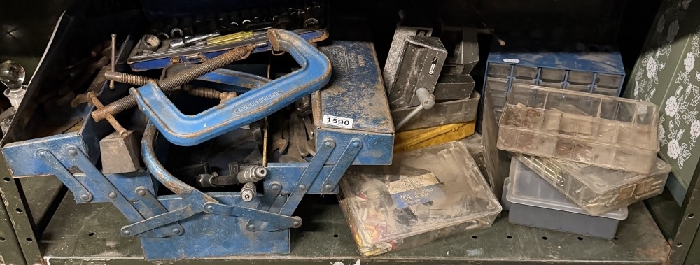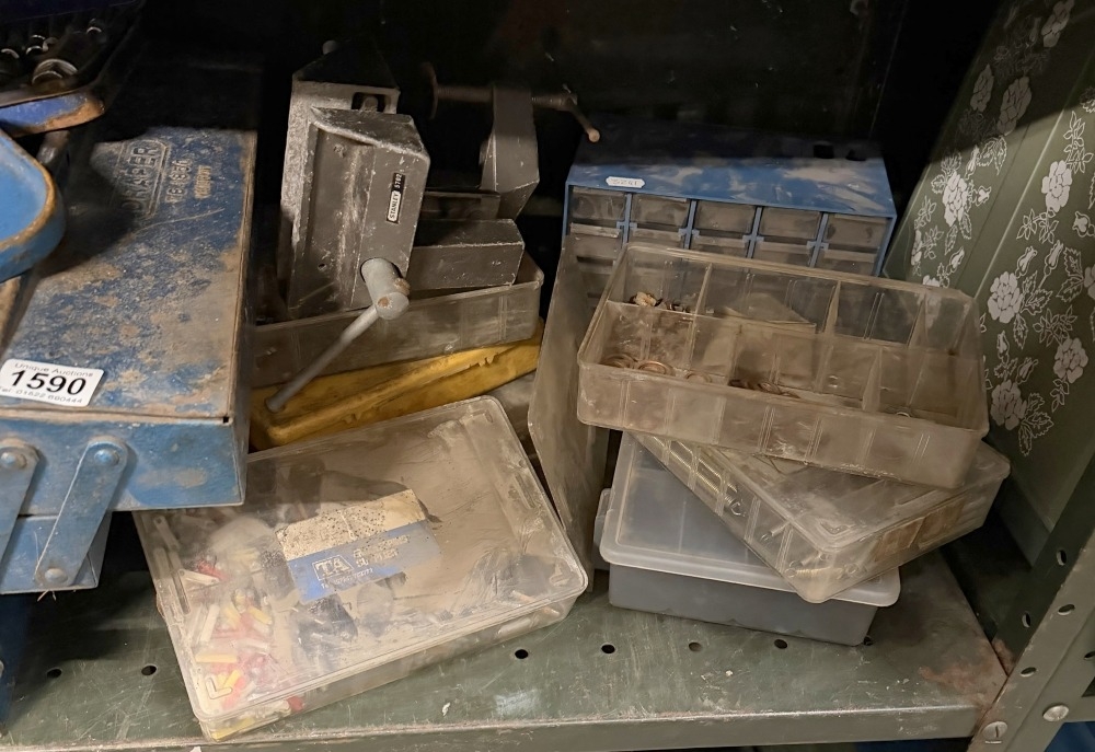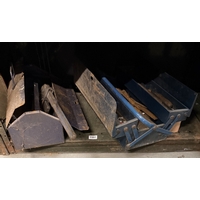 A shelf of workshop consumables, toolboxes, Stanley 5702 etc