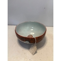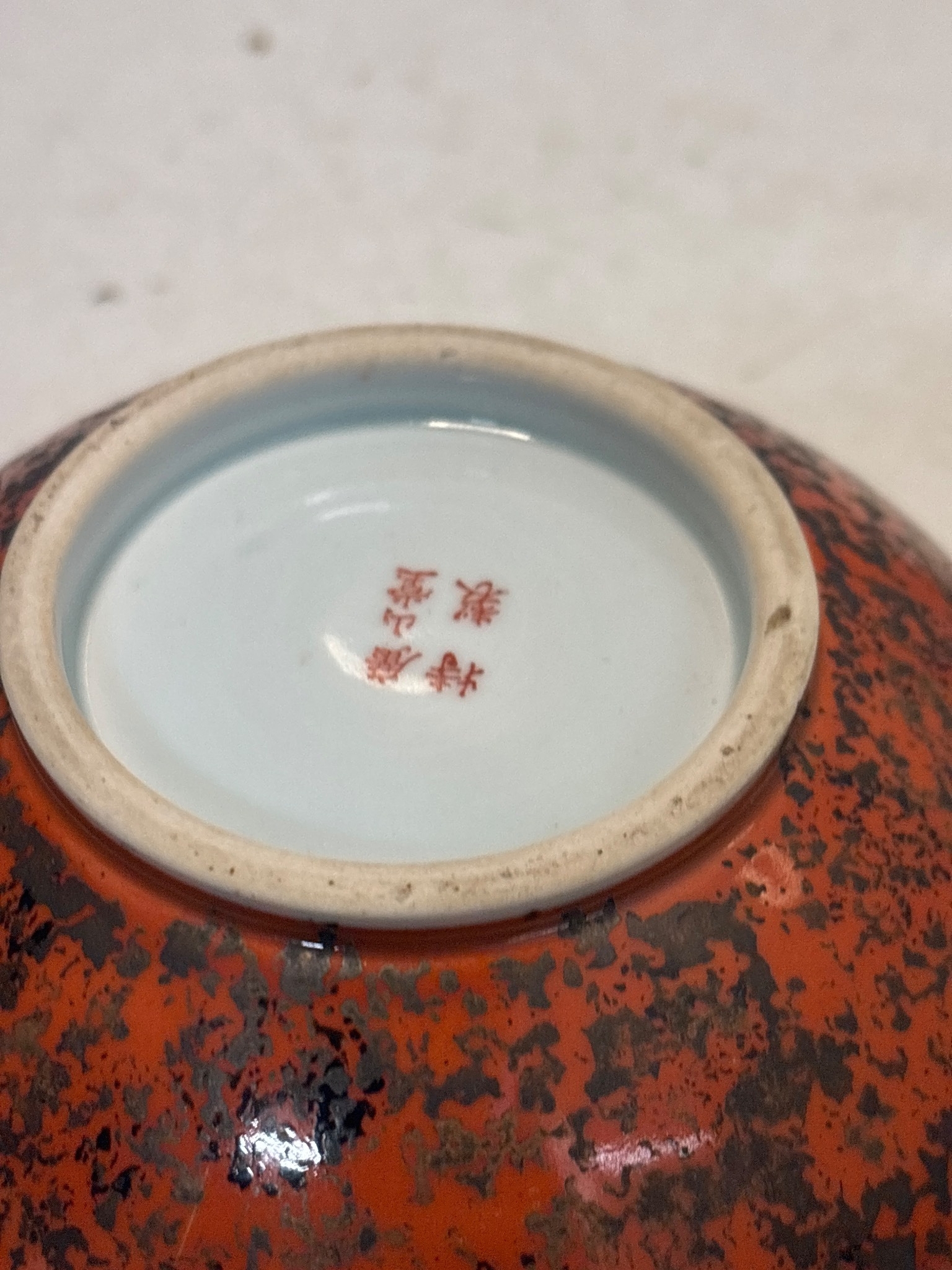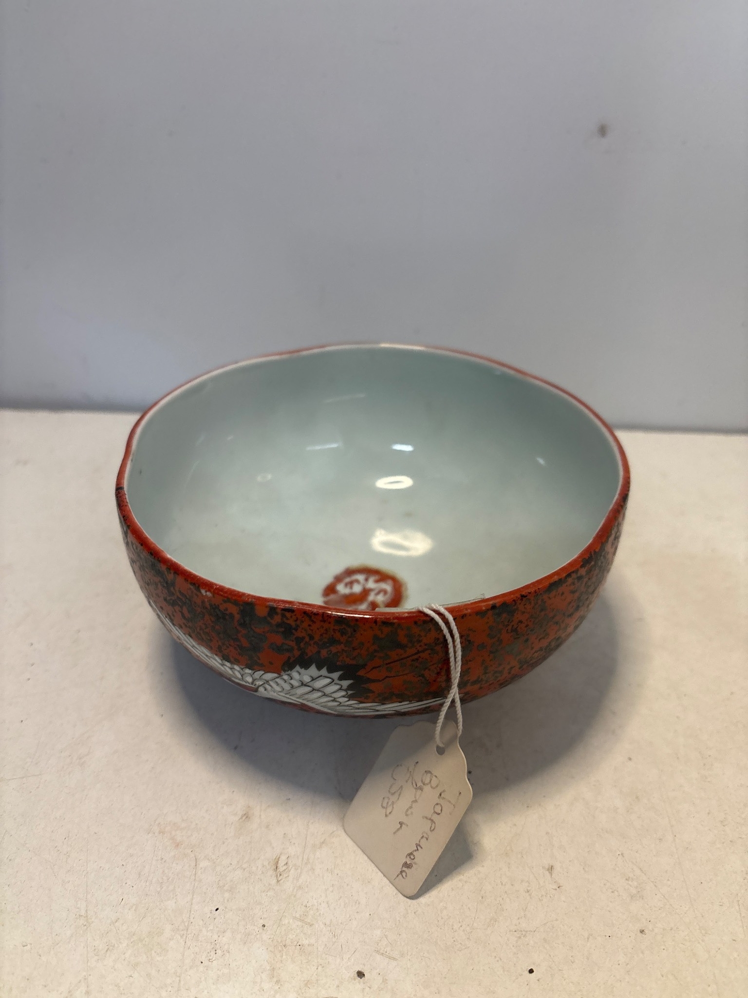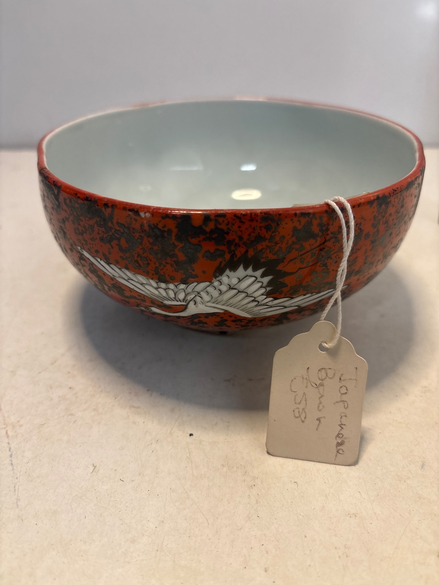 Japanese ceramic bowl with red glaze, crane motif, marked base.