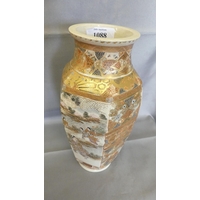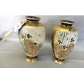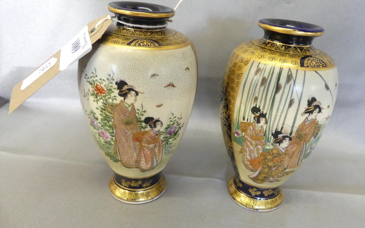 Small Pair of Japanese Meiji Period Ovoid Shaped Satsuma Pottery Vases, painted with panels of female figures on a dark blue ground, standing approx 13cm tall.