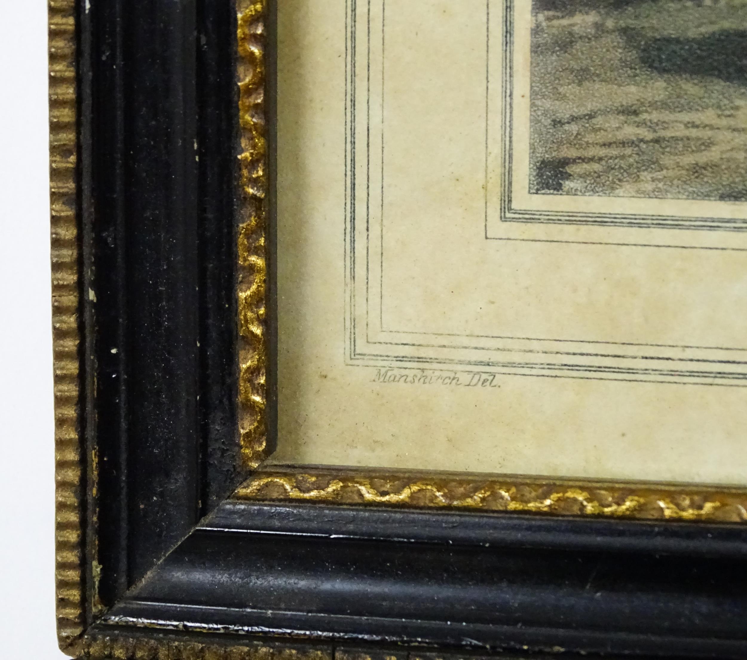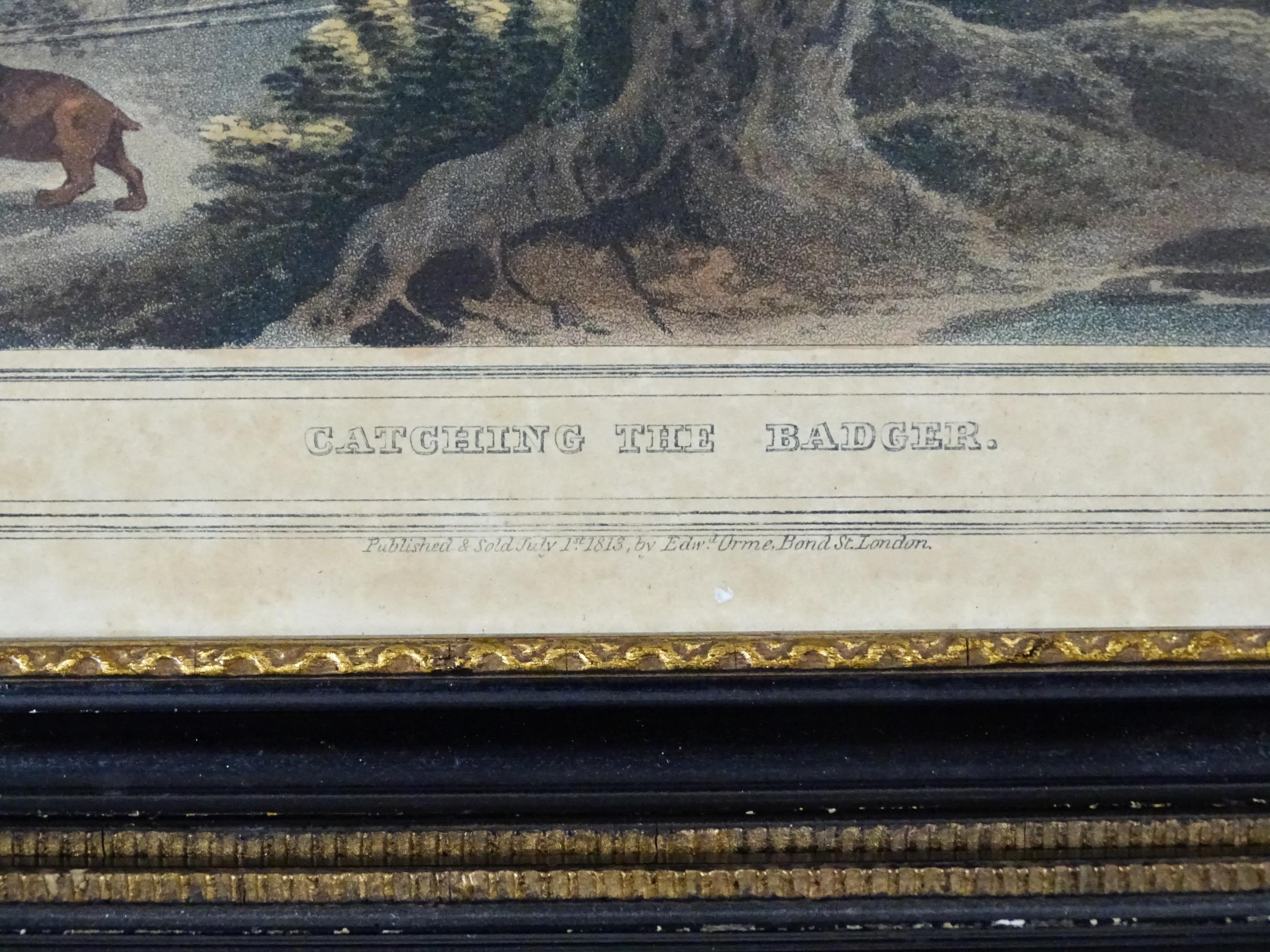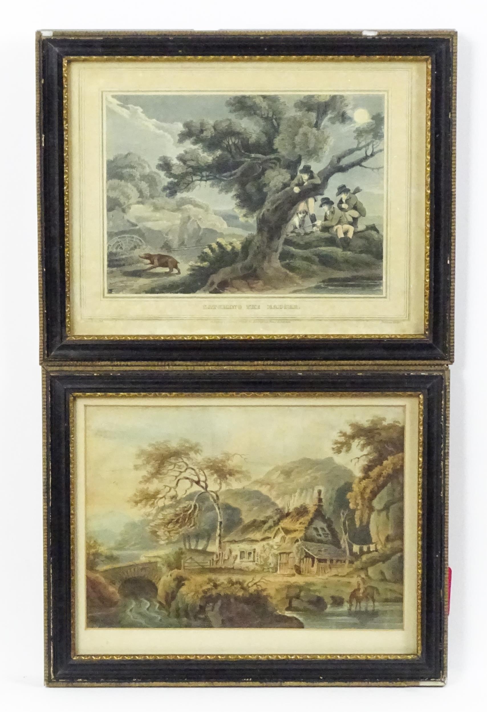 Mathew Dubourg, Ater Franz Joseph Manskirch (1768-1830), Colour aquatint, Catching the Badger, from Samuel Howitt's Foreign Field Sports. Together with another 19th century aquatint depicting a river landscape with a horse watering by a cottage. Largest approx. 6" x 8 1/4" (2)
