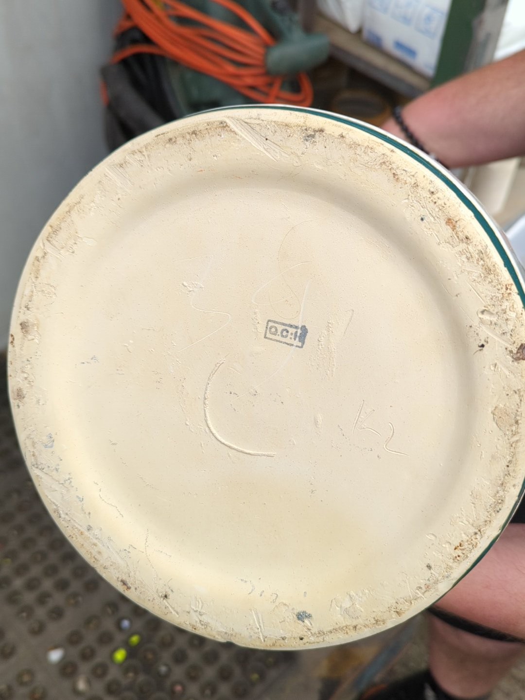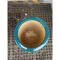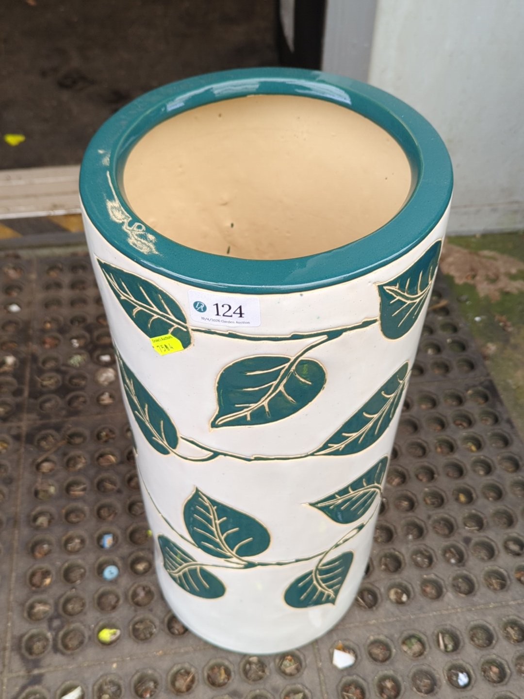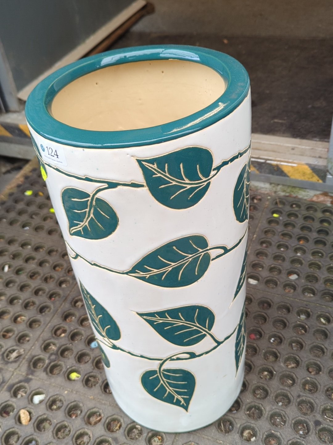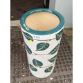 Modern glazed ceramic jardinière of tapering cylindrical form, decorated in relief with stylised foliate bands in teal on a cream ground, with matching glazed rim and interior; underside stamped with a maker’s mark.