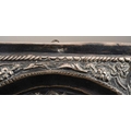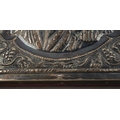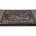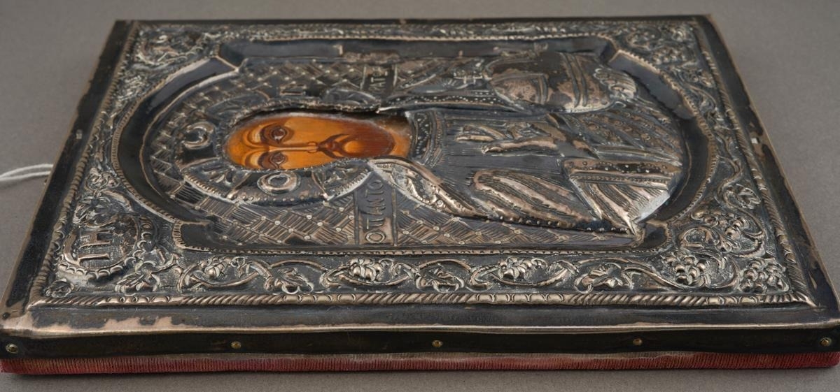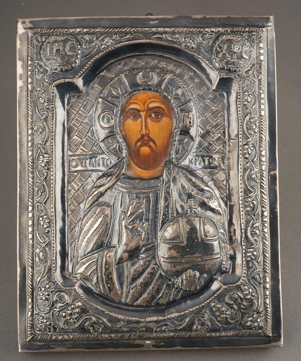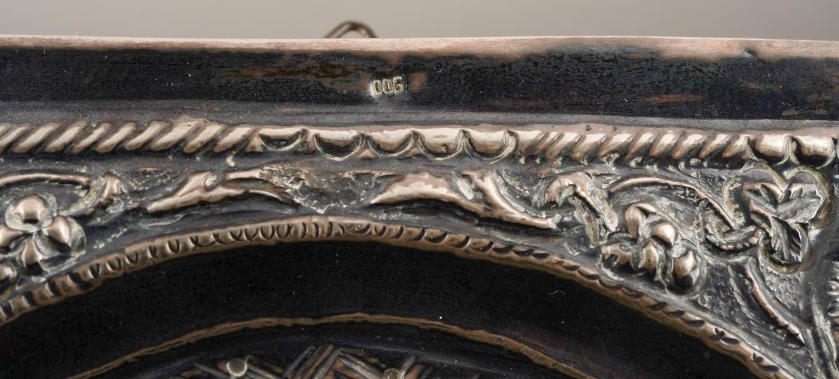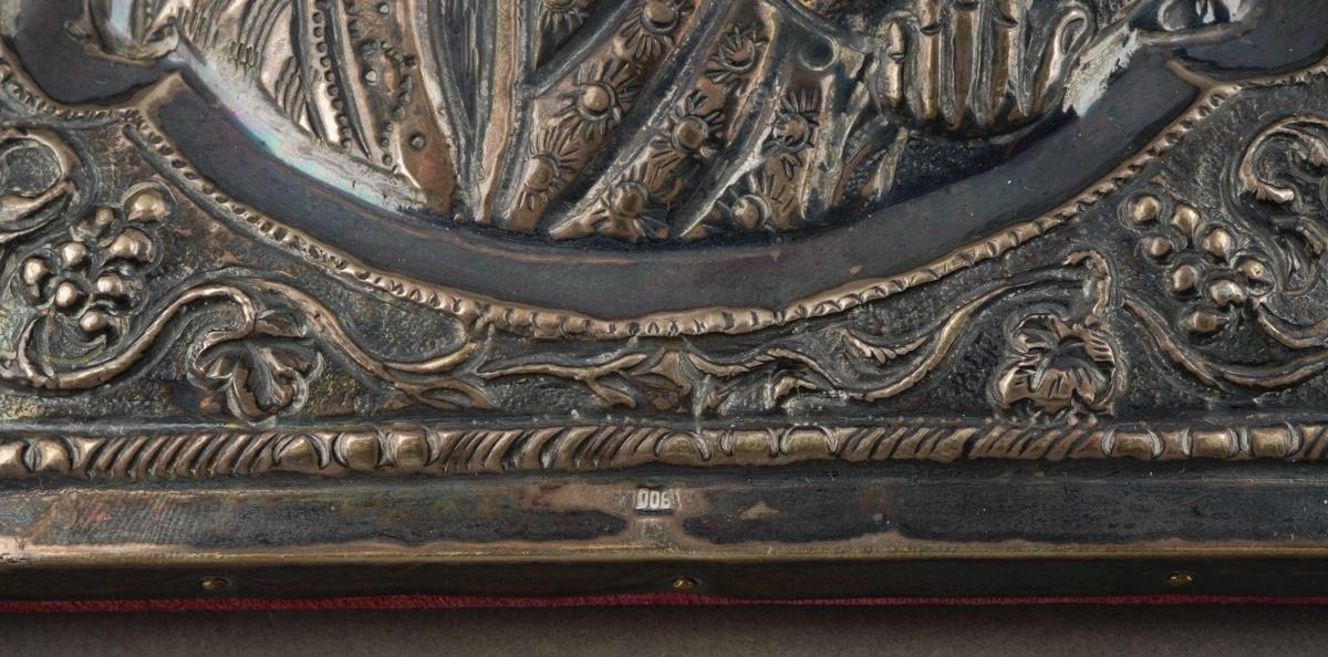 A 20th century Russian icon of rectangular form, the embossed white metal front stamped 900 to top and bottomfront edges, the face painted in oils on wood, red velvet covered back, 19cm x 15cm approx (1)
