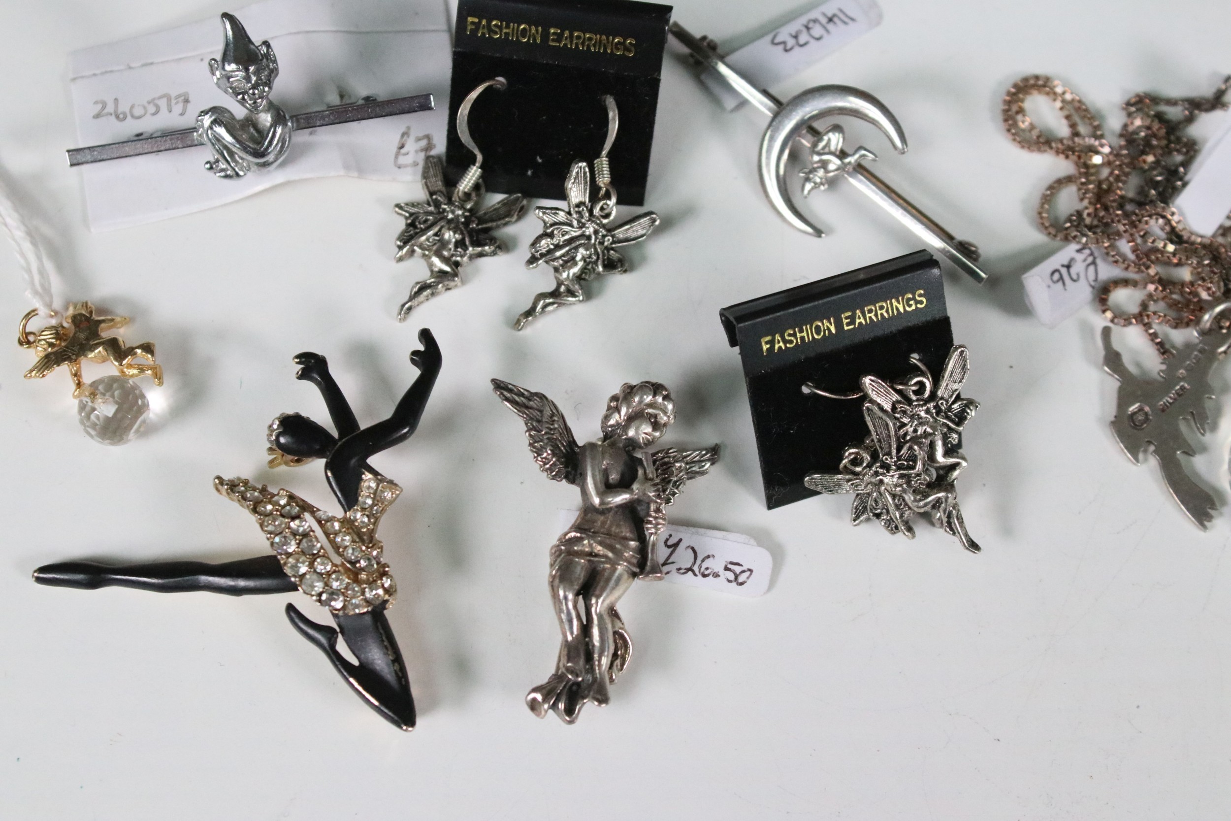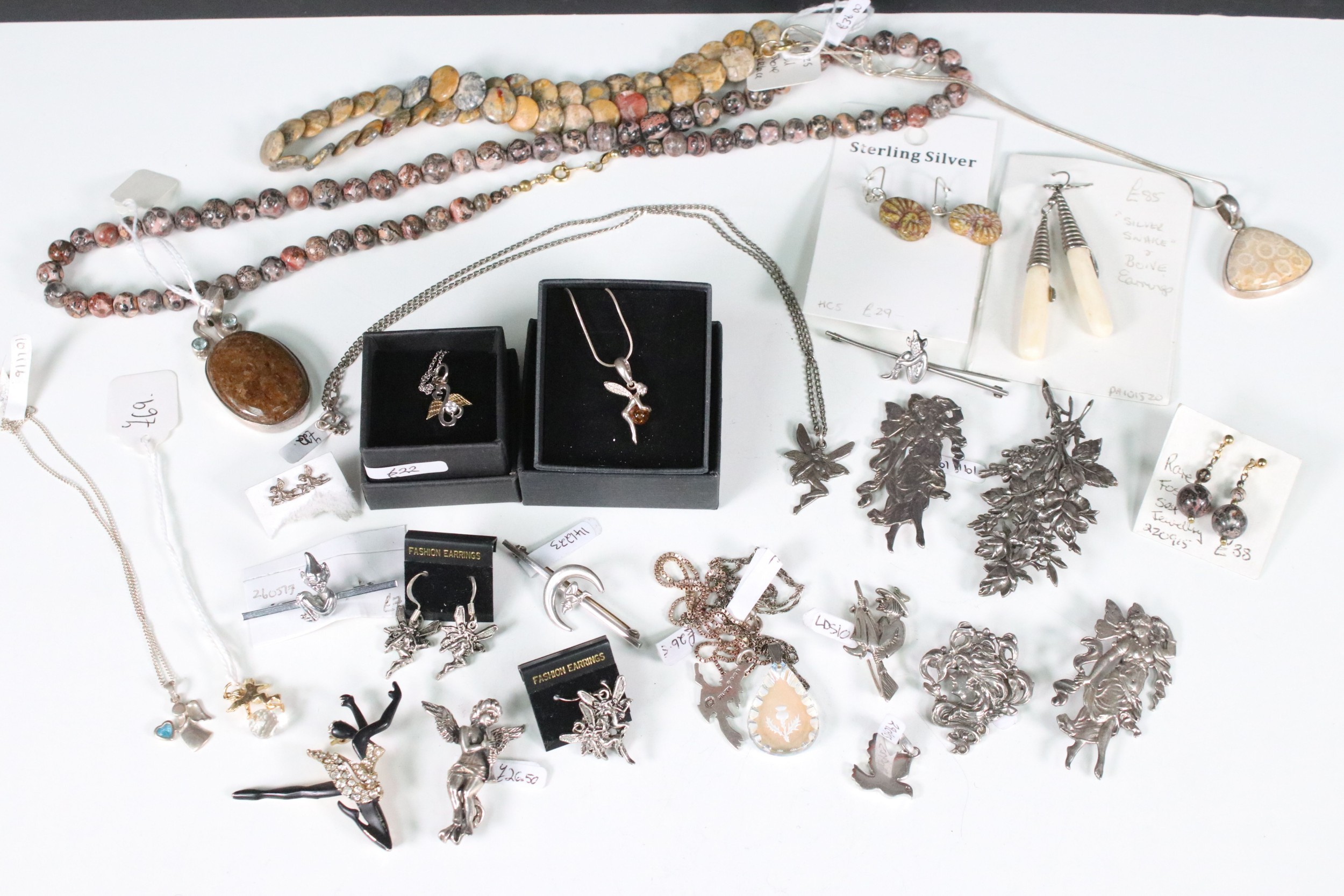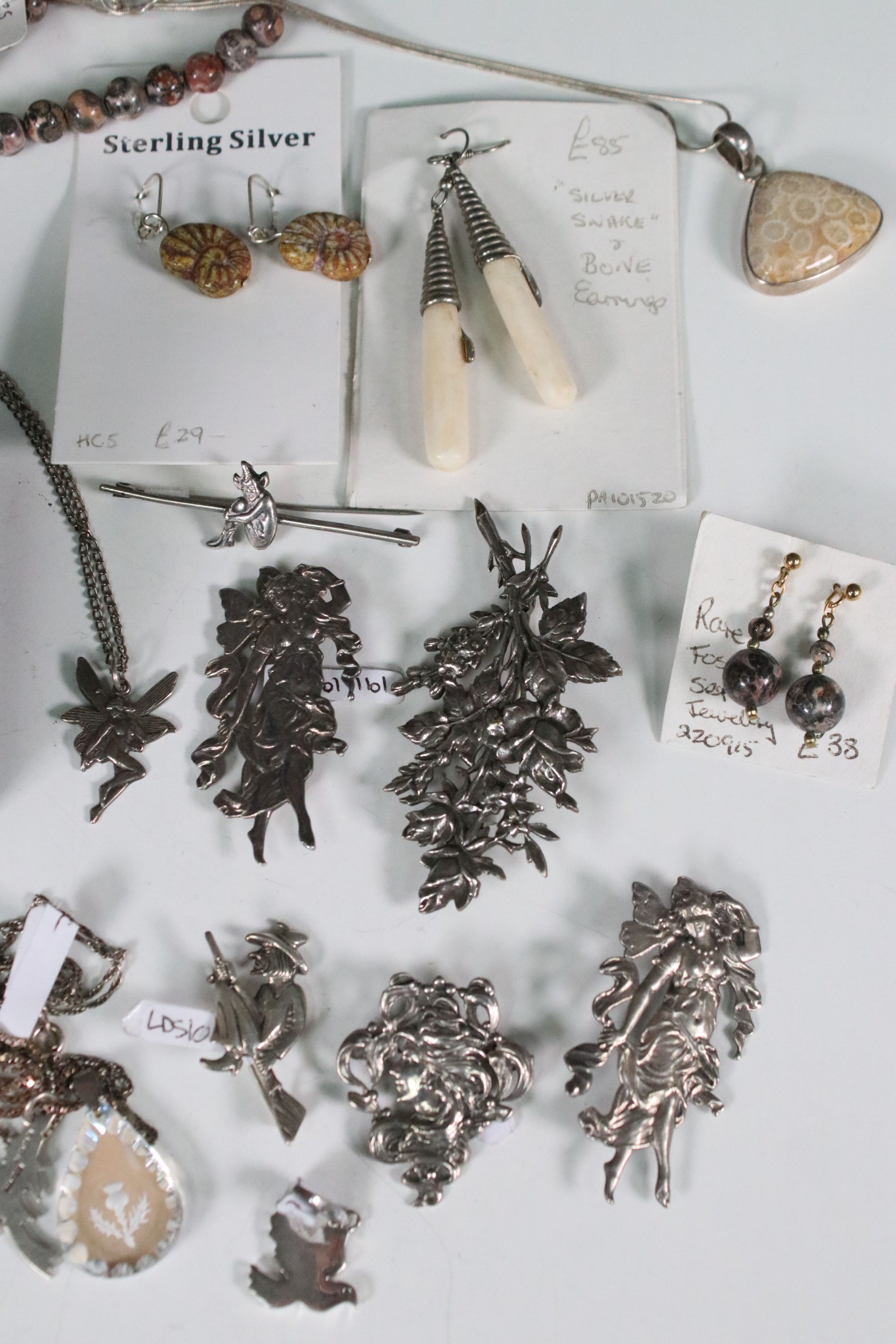 Collection of hallmarked and unmarked white metal jewellery to include mythical, fairy, imp, witch examples in the form of necklaces, earrings, brooches etc together with a selection of fossilised stone and silver items and 9ct gold cherub pendant