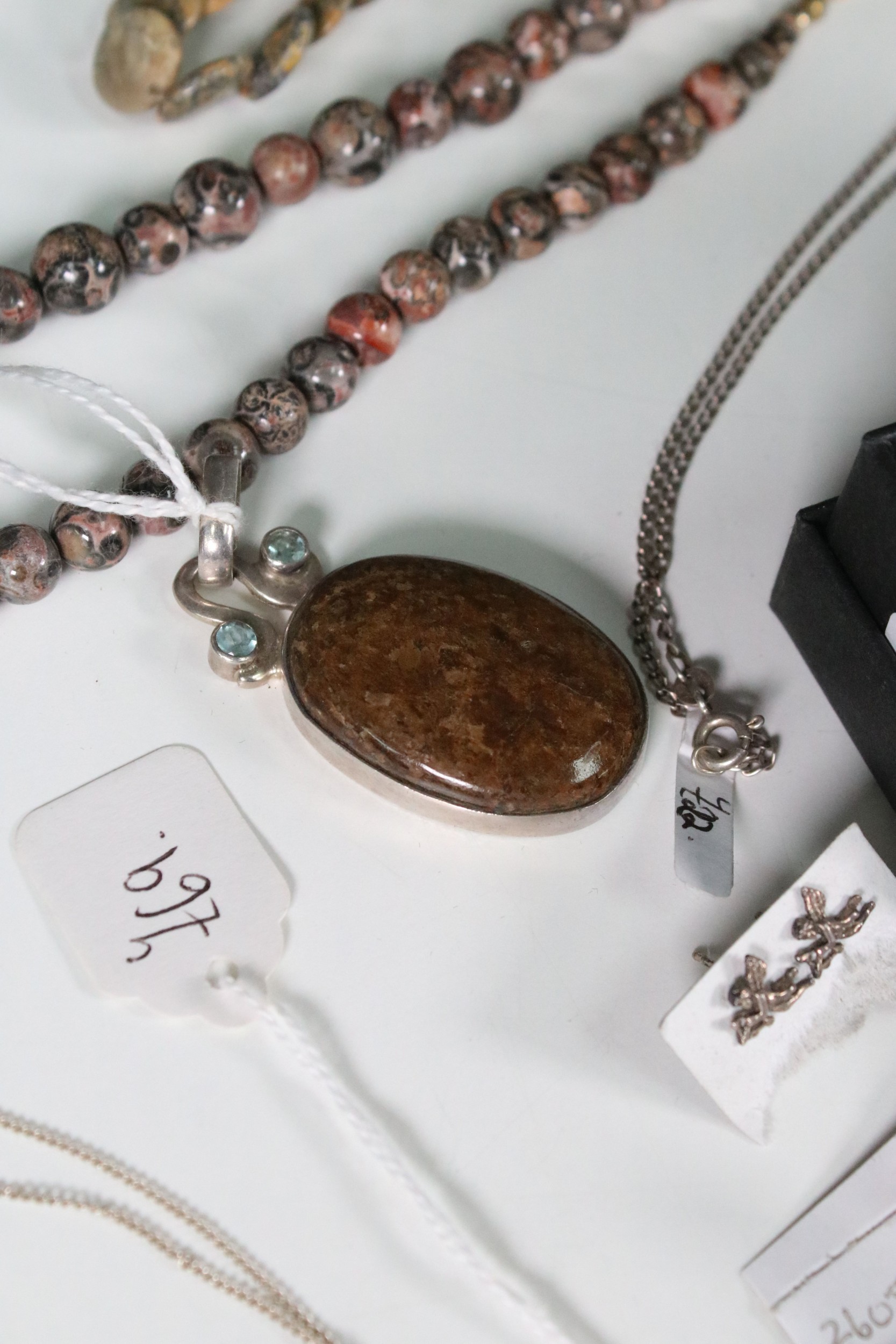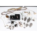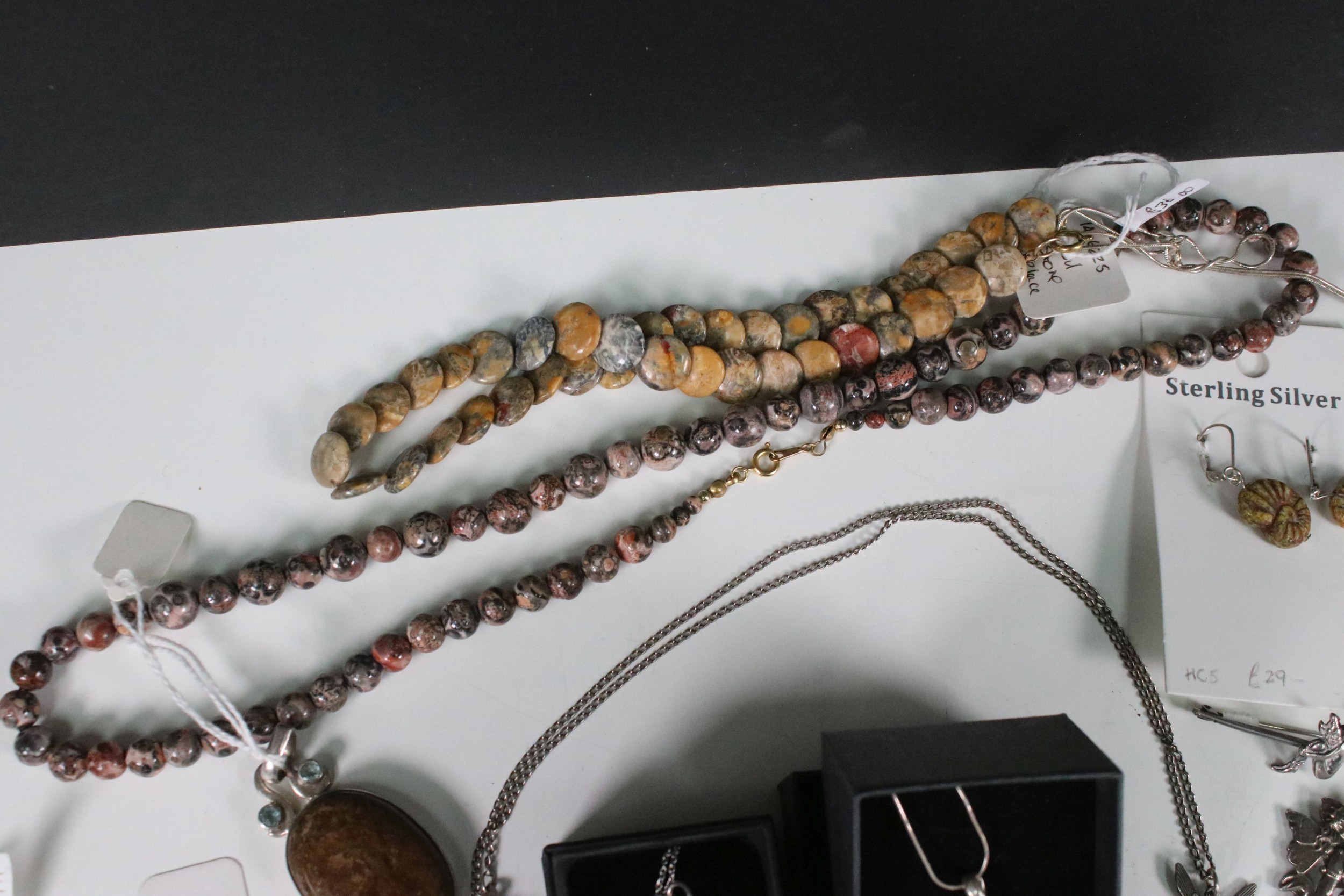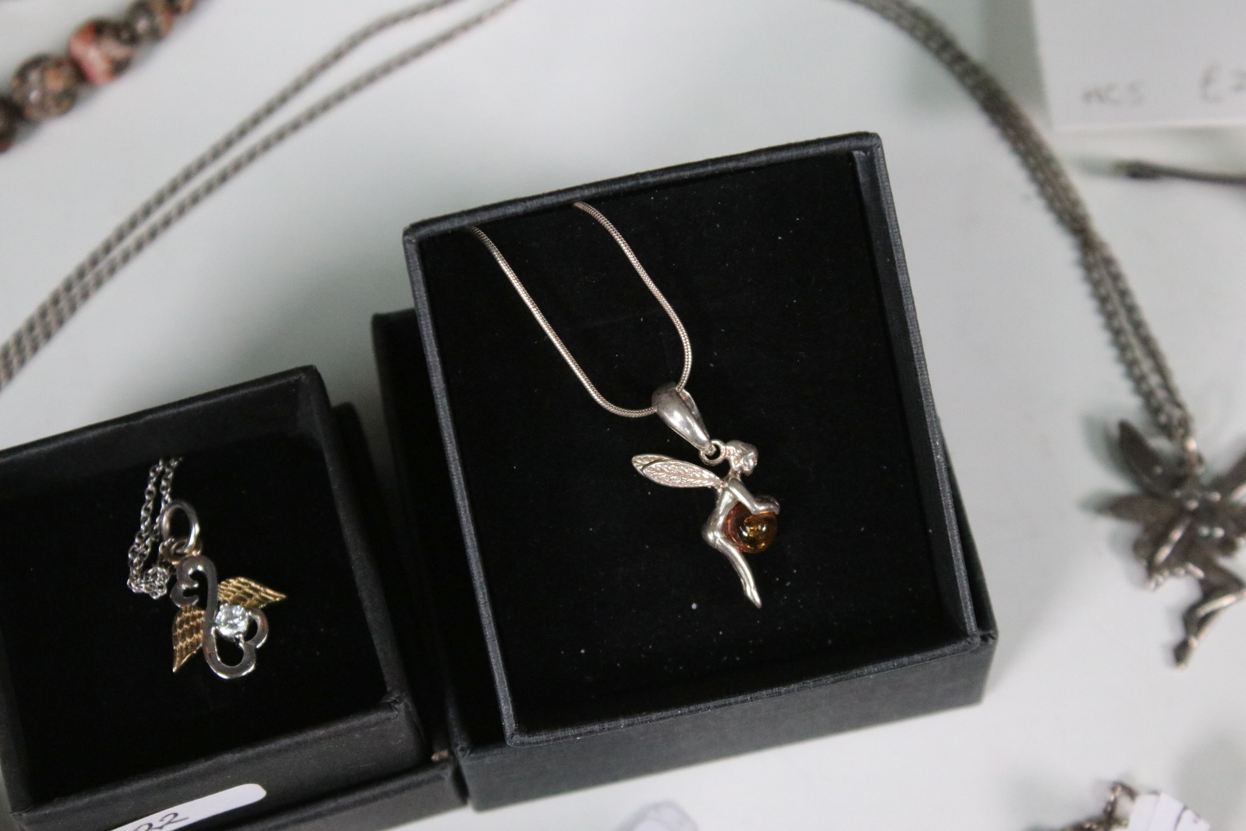 Collection of hallmarked and unmarked white metal jewellery to include mythical, fairy, imp, witch examples in the form of necklaces, earrings, brooches etc together with a selection of fossilised stone and silver items and 9ct gold cherub pendant