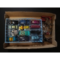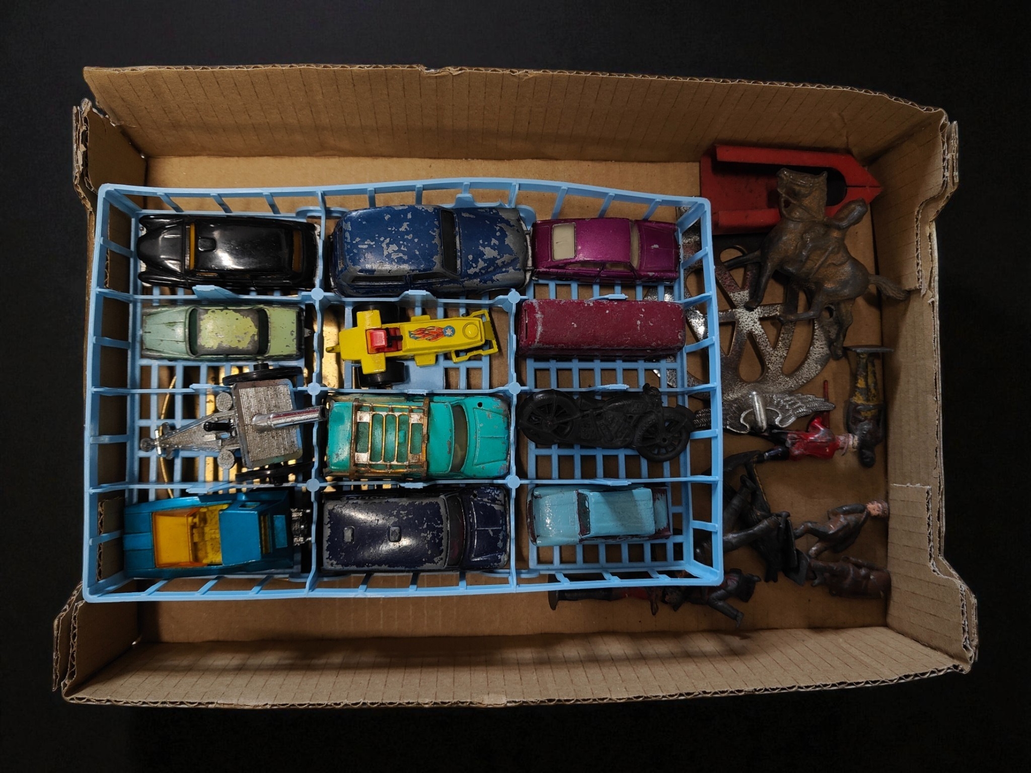 BOX LOT OF MODEL CARS, AA BADGE AND LEAD SOLDIERS