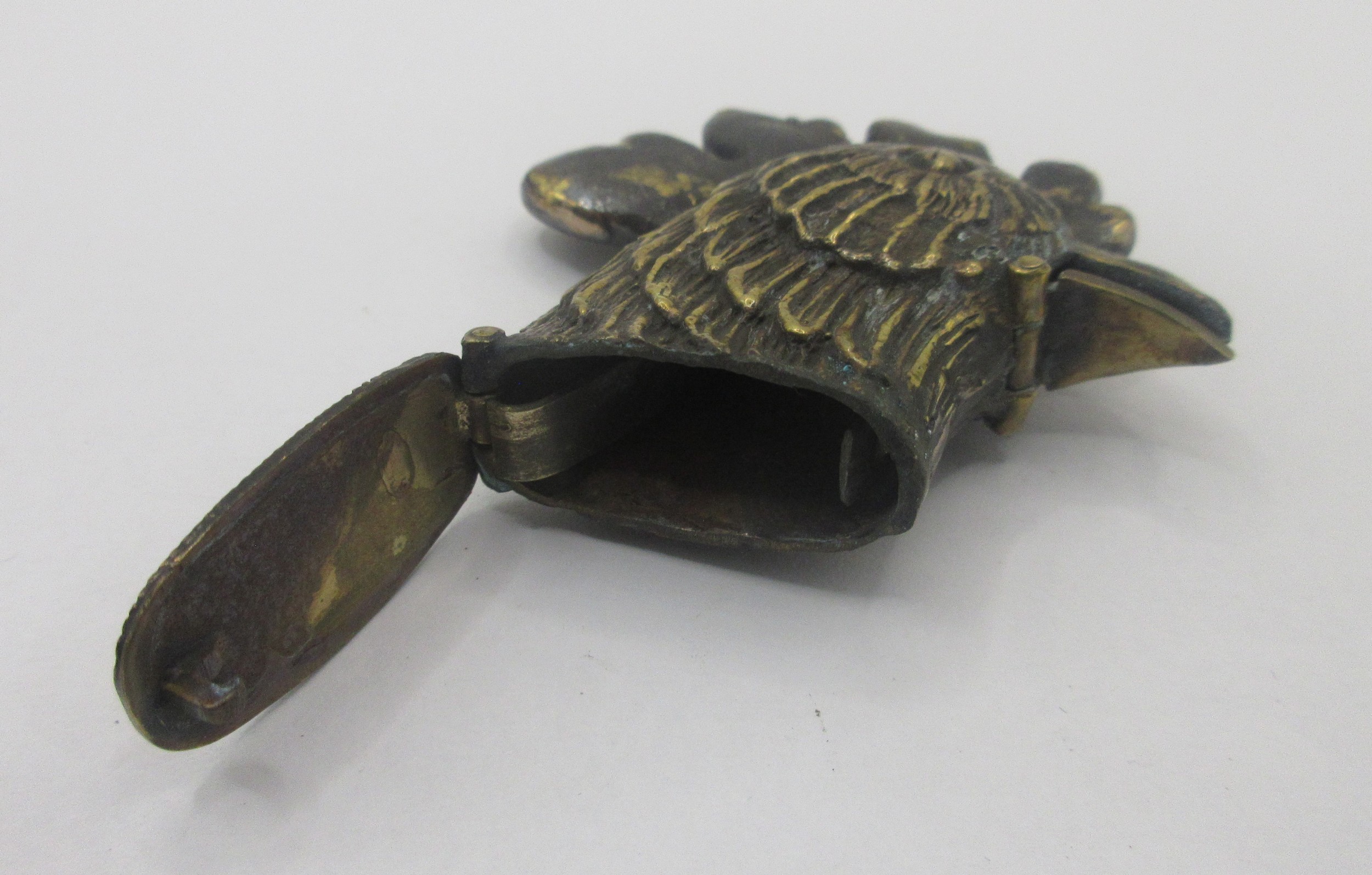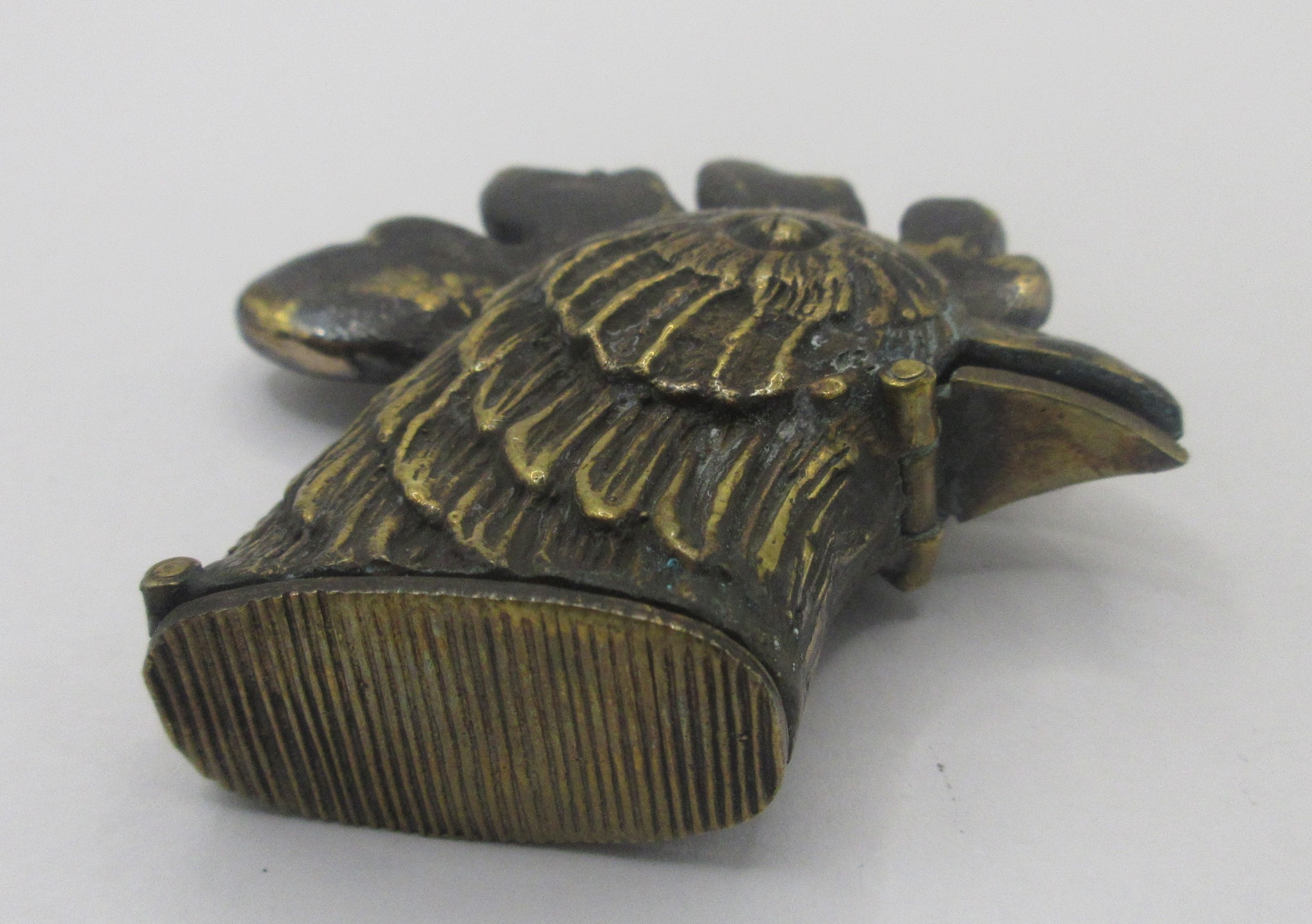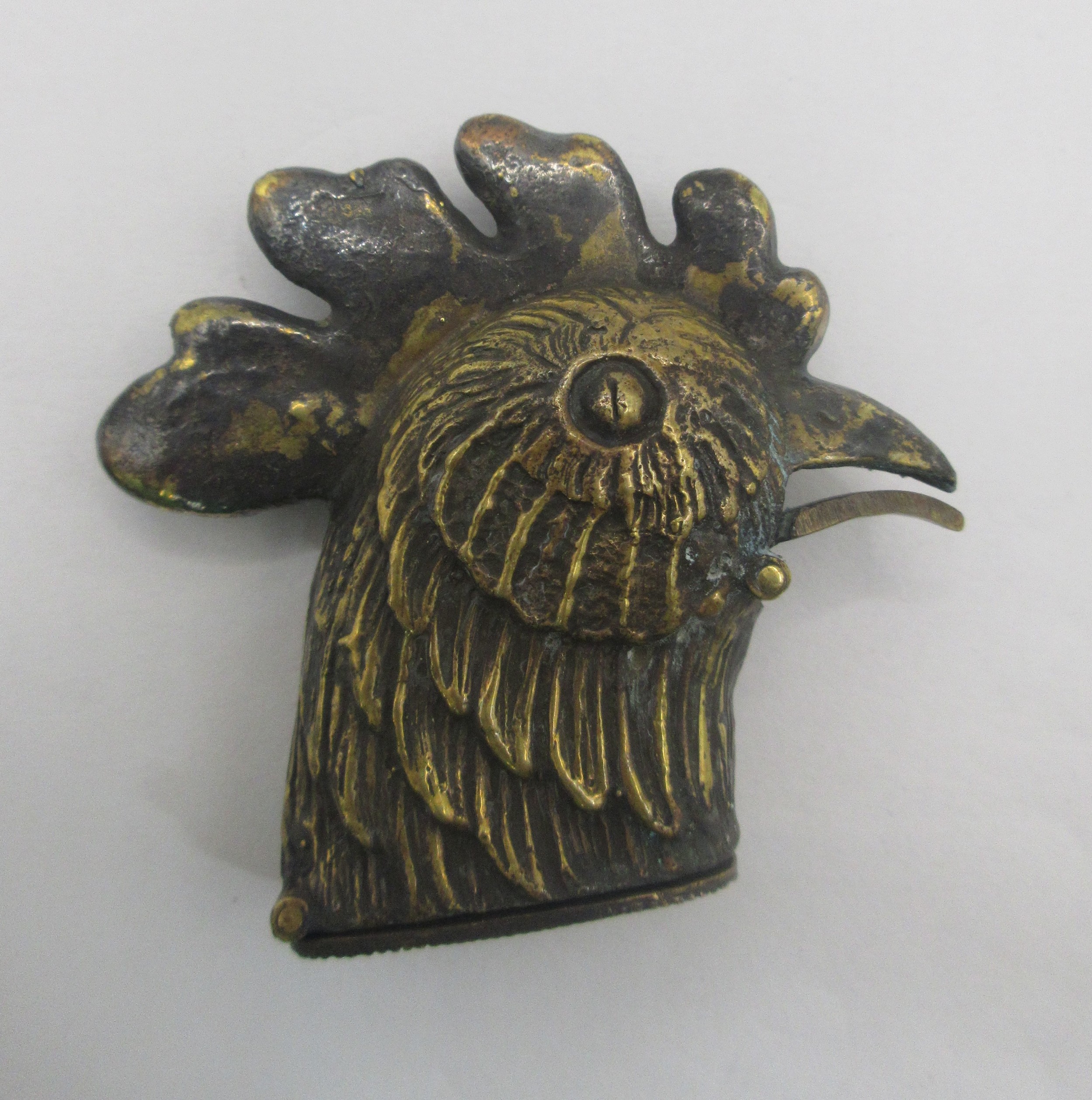 A brass vesta in the form of a large cock's head, the spring-loaded lid released by pressing the beak