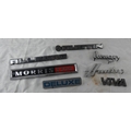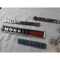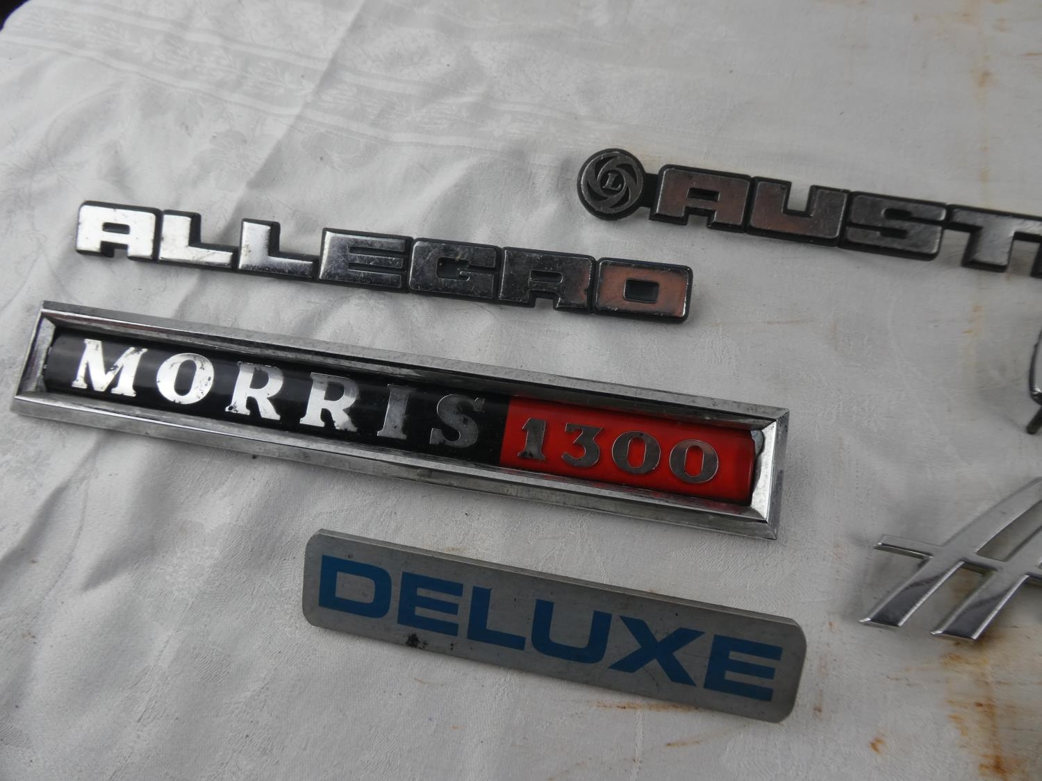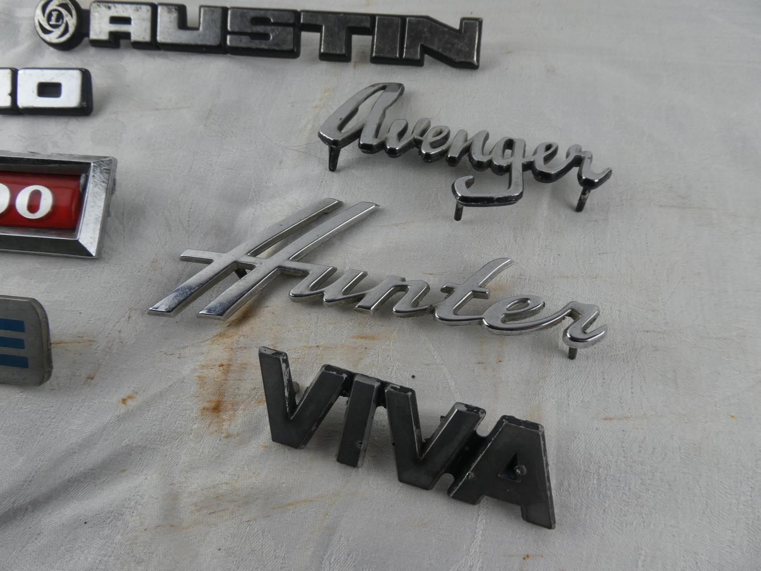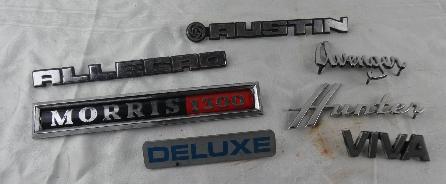 A collection of car badges to include Avenger, Morris 1300, Allegro, Viva, Deluxe, Austin, Hunter.