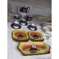 GLASSWARE, antique milk glass rolling pin novelty, slag glass candle sticks and bowl, porcelain harp and other glassware