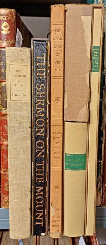 ODES AND EPODES BY Q. HORATIUS FLACCUS, LIMITED EDITIONS CLUB COPY PRINTED AT THE THISTLE PRESS IN 2 VOLUMES WITH SLIP CASE - 1961, THE GEORGICS OF VIGIL, TRANSLATED BY JOHN DRYDEN, NO 272 OF 1200 COPIES - 1931, THE SERMON ON THE MOUNT BY ROWAN A. GREEN, LIMITED EDITIONS CLUB COPY WITH SLIP CASE - 1977, AND HERE BEGINNETH THE BOOK CALLED THE IMITATION OF CHRIST, UN-NUMBERED COPY OF 100, PUBLISHED BY PHILLIP ALLAN AND CO - 1923 -5-