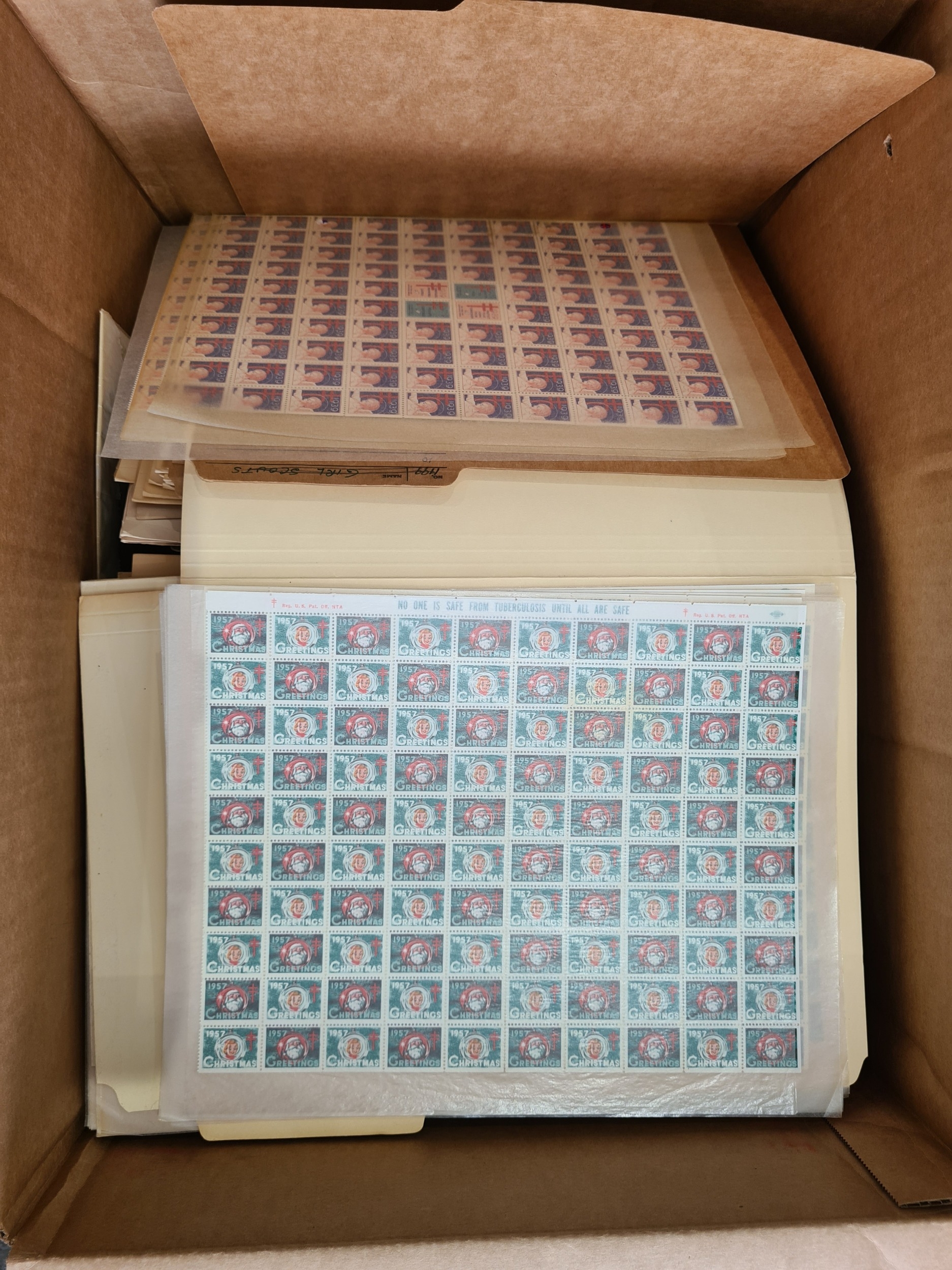 REVENUES & CINDERELLA - USA; Anti- TB Christmas Seals Comprehensive and Extensive lifetime collection of Christmas seals neatly arranged in a moving box mostly in folders, sleeves and albums with must be in excess of (40000) or (800) sheets, also has original correspondence with the Annual Christmas seal campaign. viewing is a must to appreciate this mountain of a collection.