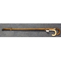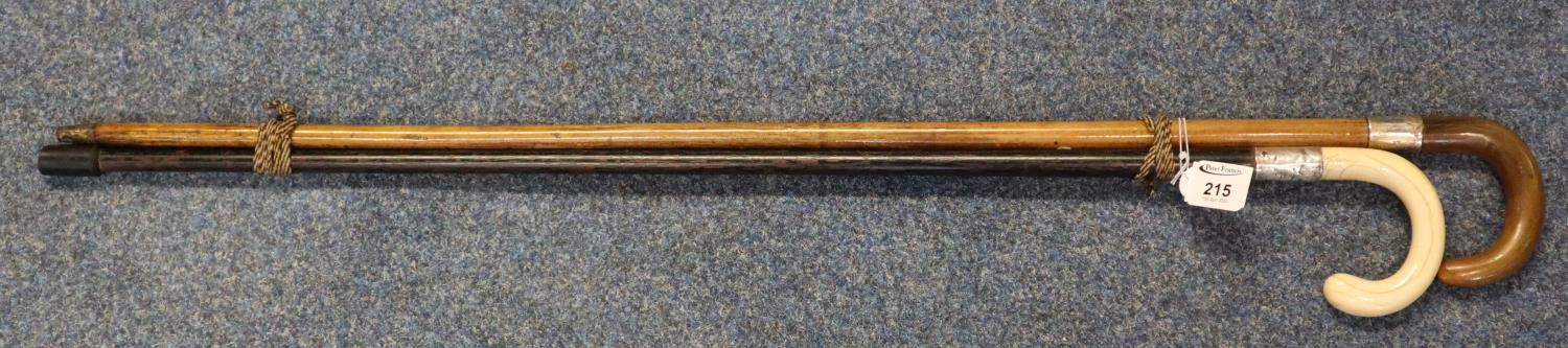 Two Victorian silver collared walking sticks with ivory and horn handles. Birmingham and Chester hallmarks. (2)