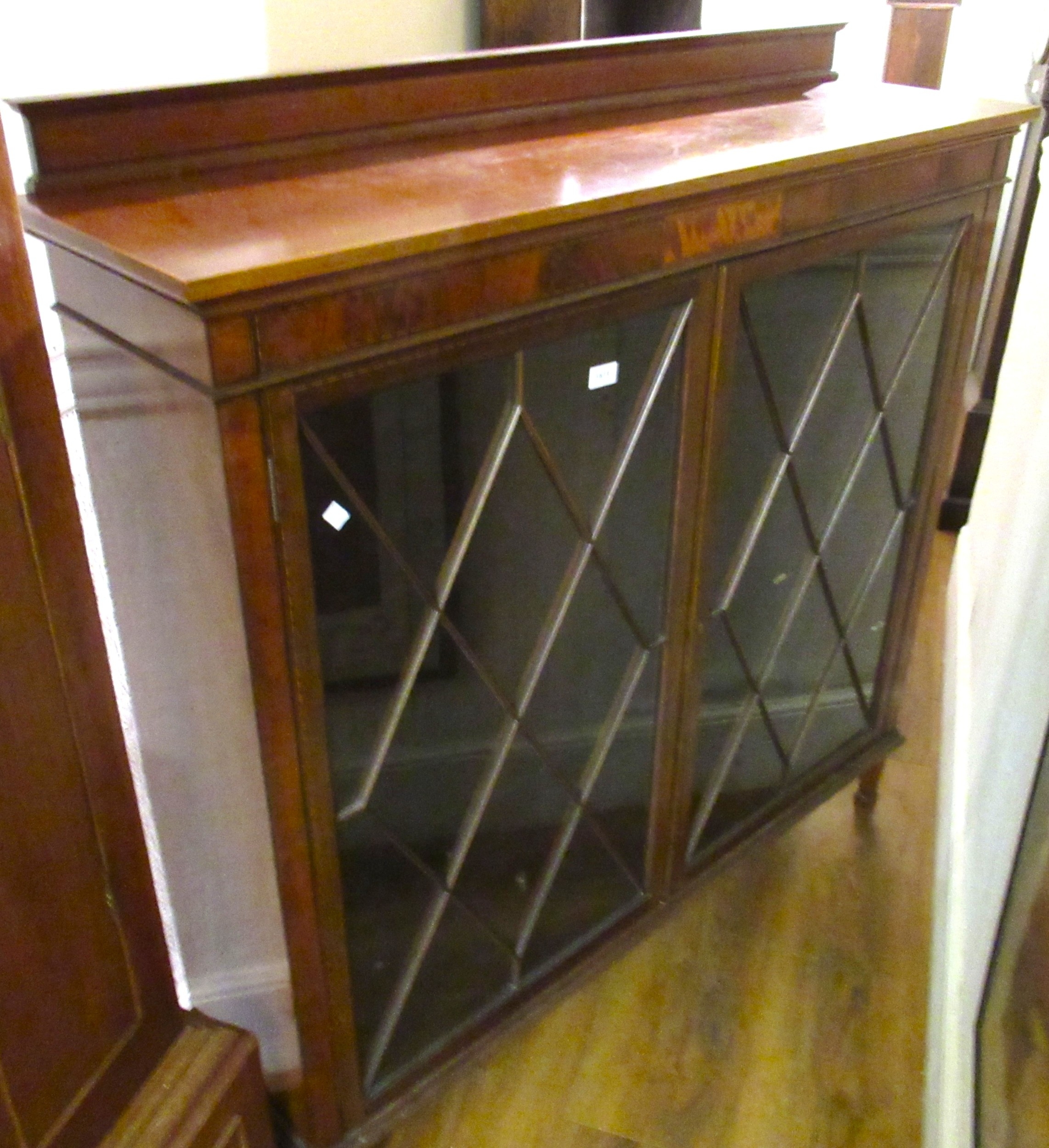 Edwardian inlaid two door bookcase having bar glazed doors with adjustable shelves on square tapering spade supports, 122 x 33 x 130cm