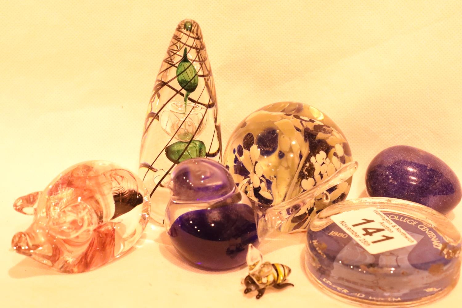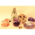 Three paperweights, bird figurine, pig figurine, glass egg and miniature bee figurine. Not available for in-house P&P