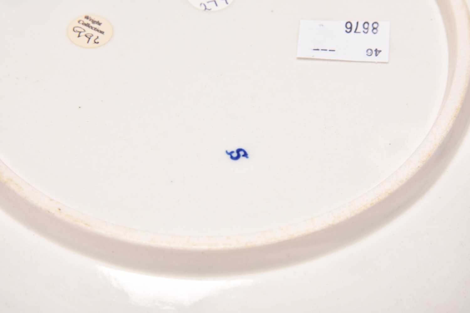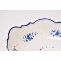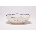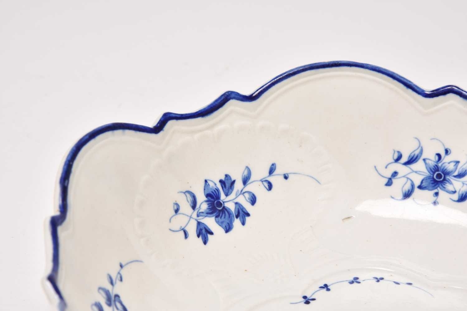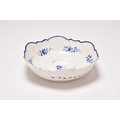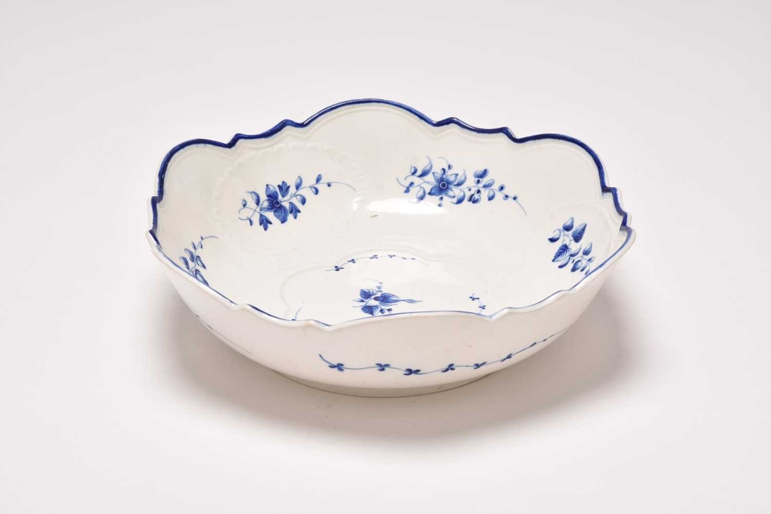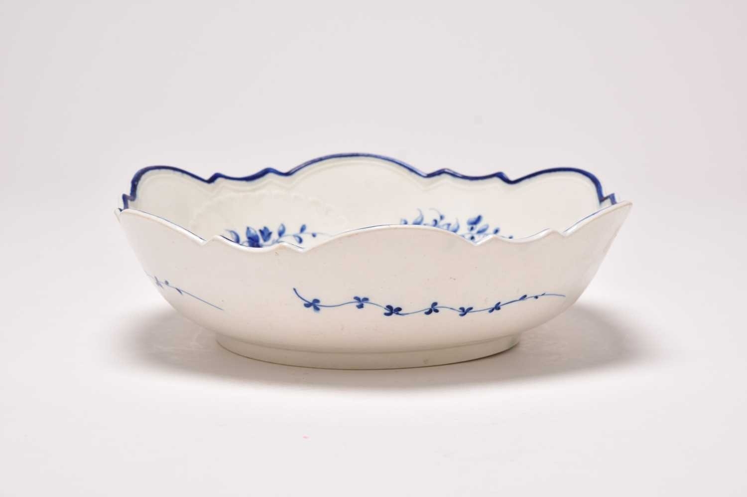 A rare Caughley 'Bright Sprigs' salad bowl or junket dish, circa 1782-92, painted in underglaze blue, nicely moulded with shells, painted S mark, 25.5cm wide Provenance: David Waterhouse Collection. DMW no. 279. Formerly Maurice Wright Collection. Whilst a common pattern, it is rare on this shape. Condition:Good condition with no damages or repairs. Scratches to the interior commensurate with age and use. Small firing blemish to interior.