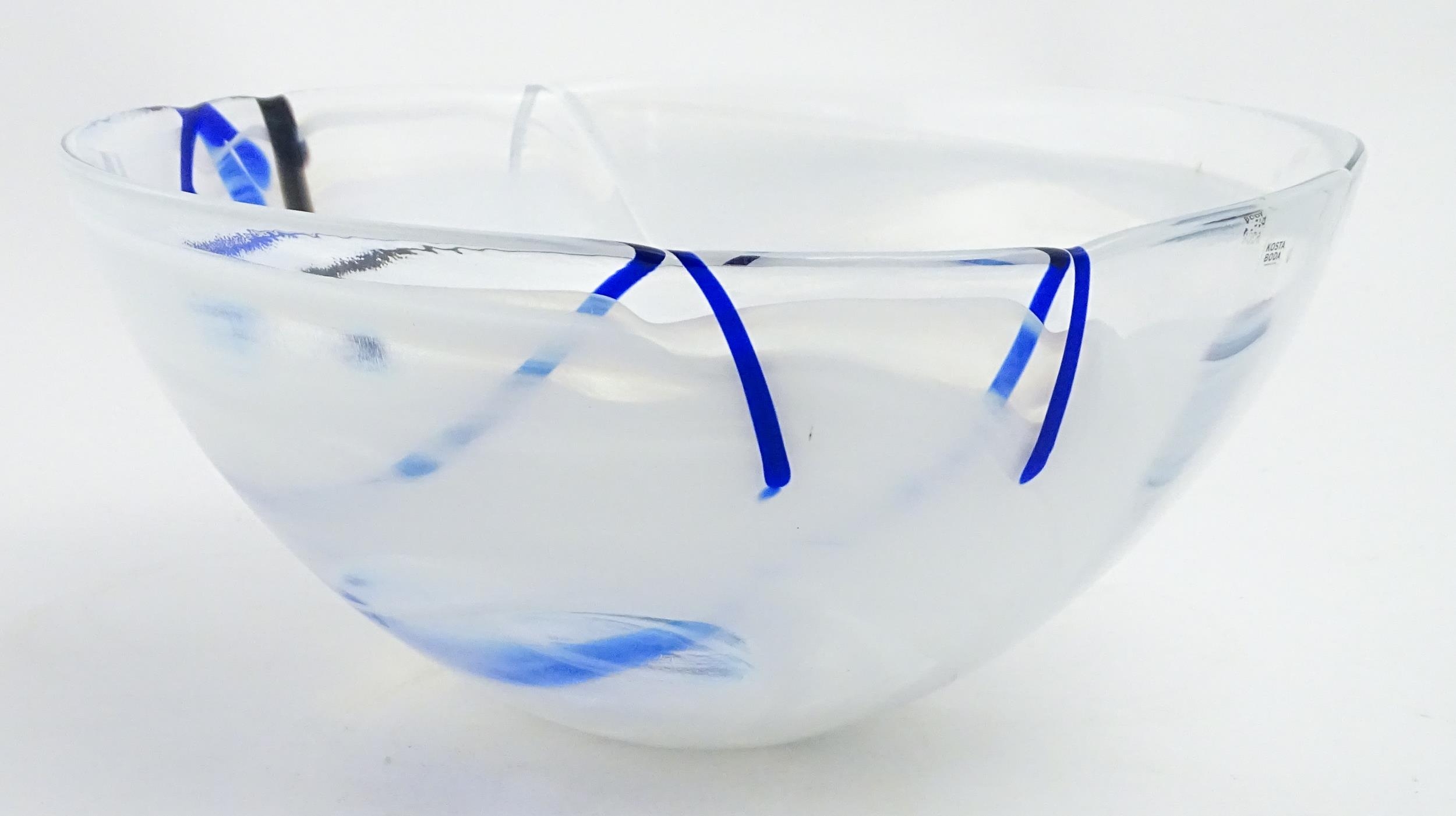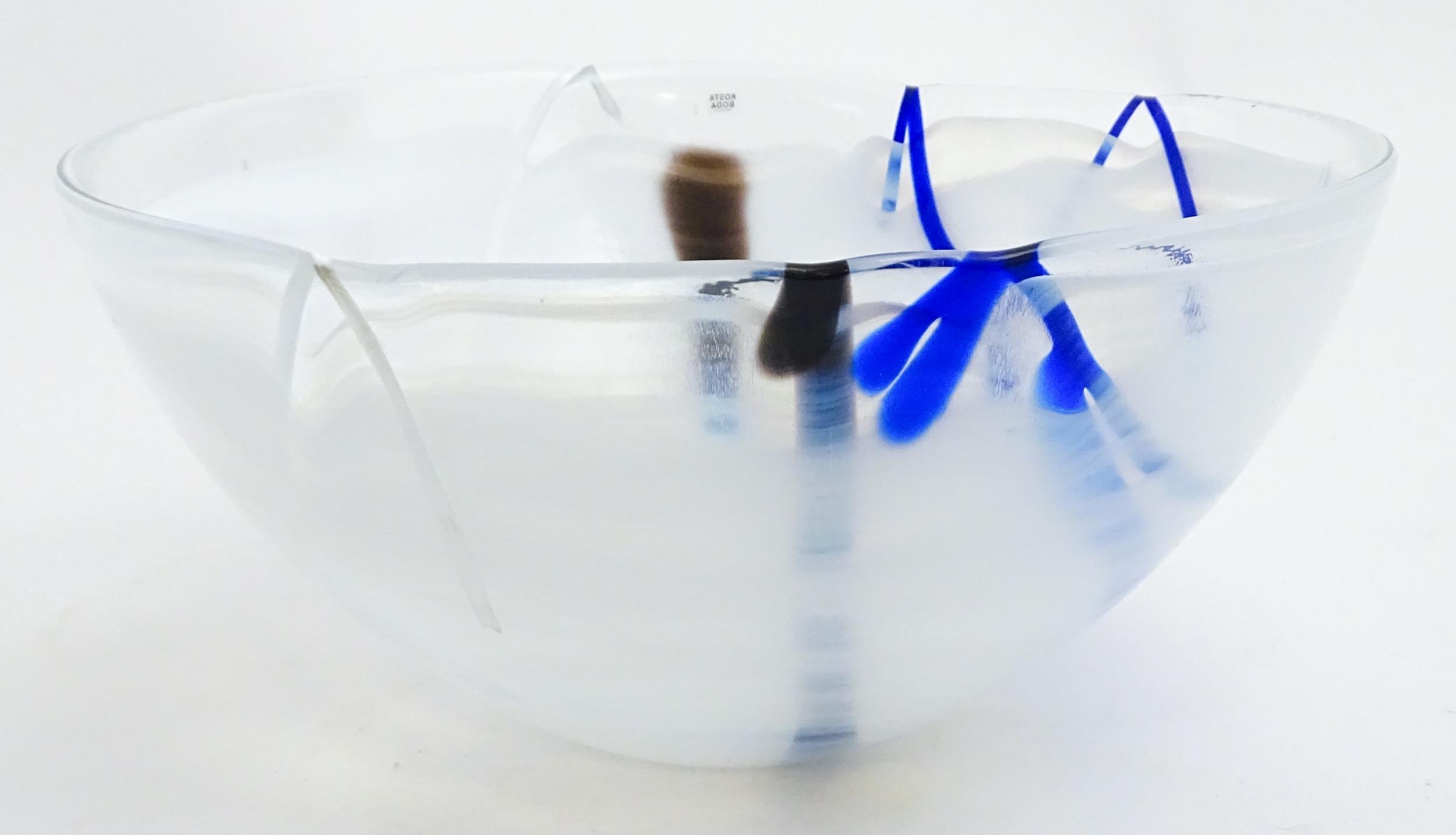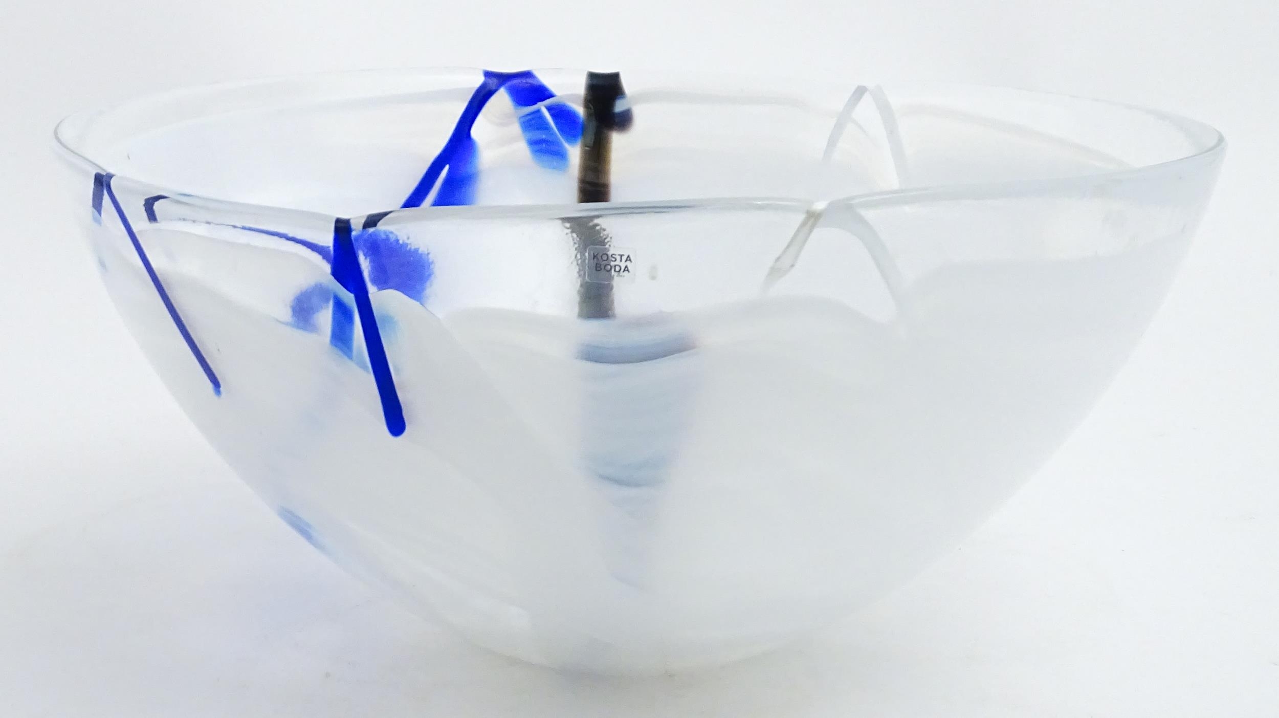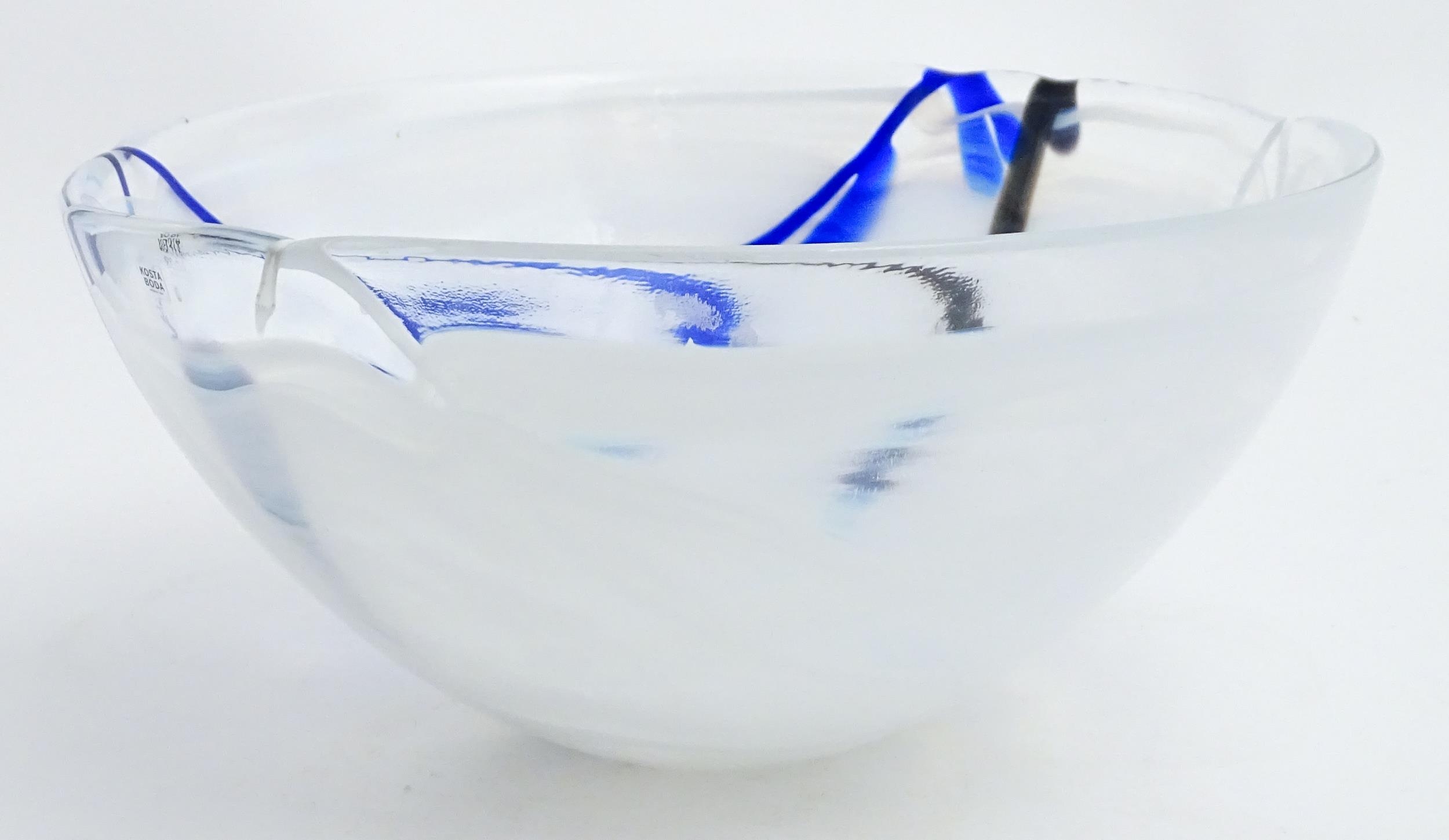 A large Kosta Boda art glass bowl with blue and black detail. Approx. 6 1/2" high x 13 3/4" wide