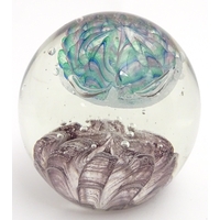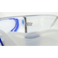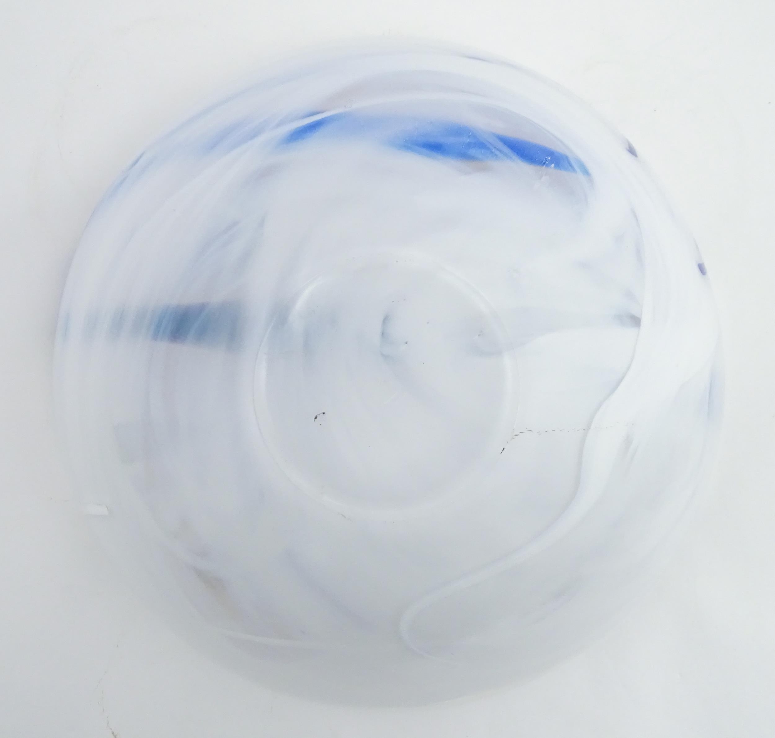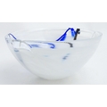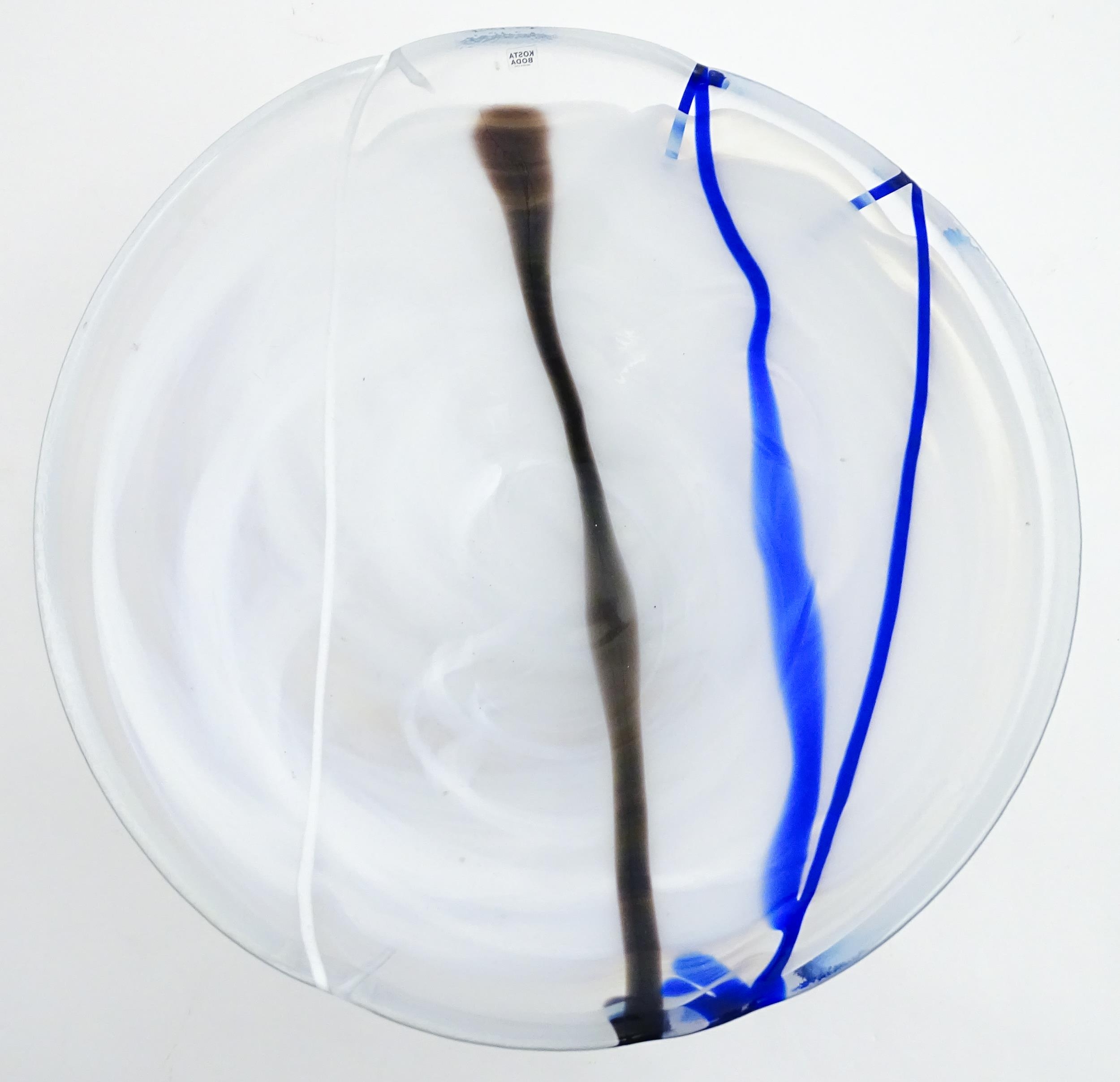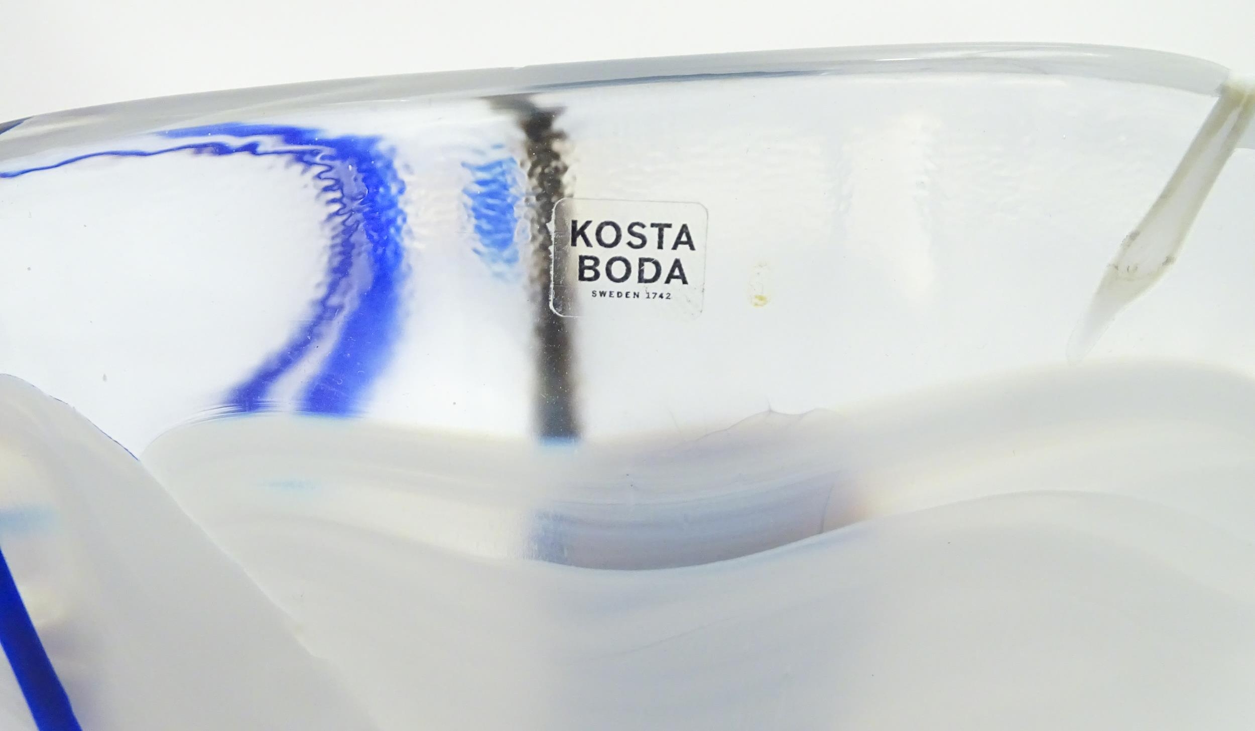 A large Kosta Boda art glass bowl with blue and black detail. Approx. 6 1/2" high x 13 3/4" wide