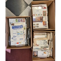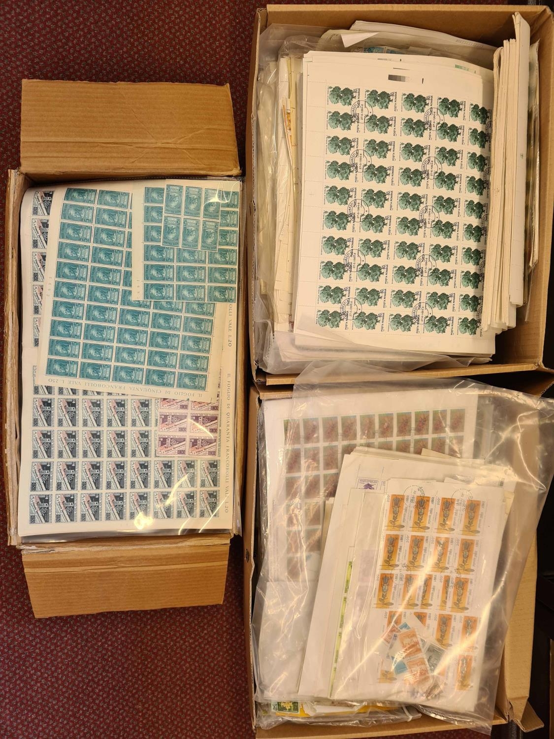 WORLDWIDE RANGE; Three cartons containing a mixture of kiloware in packets, loose stamps + entire sheets of stamps. Wide range of countries inc. Czechoslovakia, Equatorial Guinea, Hungary, Romania, etc. Mainly modern. (Large qty)