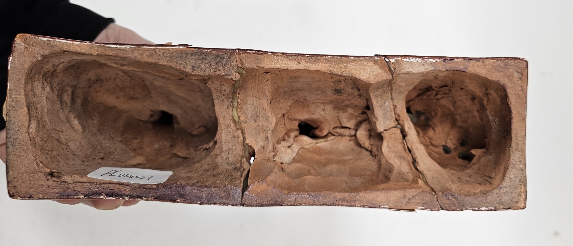 Gaston Hauchecorne (1880-1945) terracotta three Chinese busts in conservation, on rectangular plinth, the front with traces of incised signature (cracked and repaired), 24.5cm high