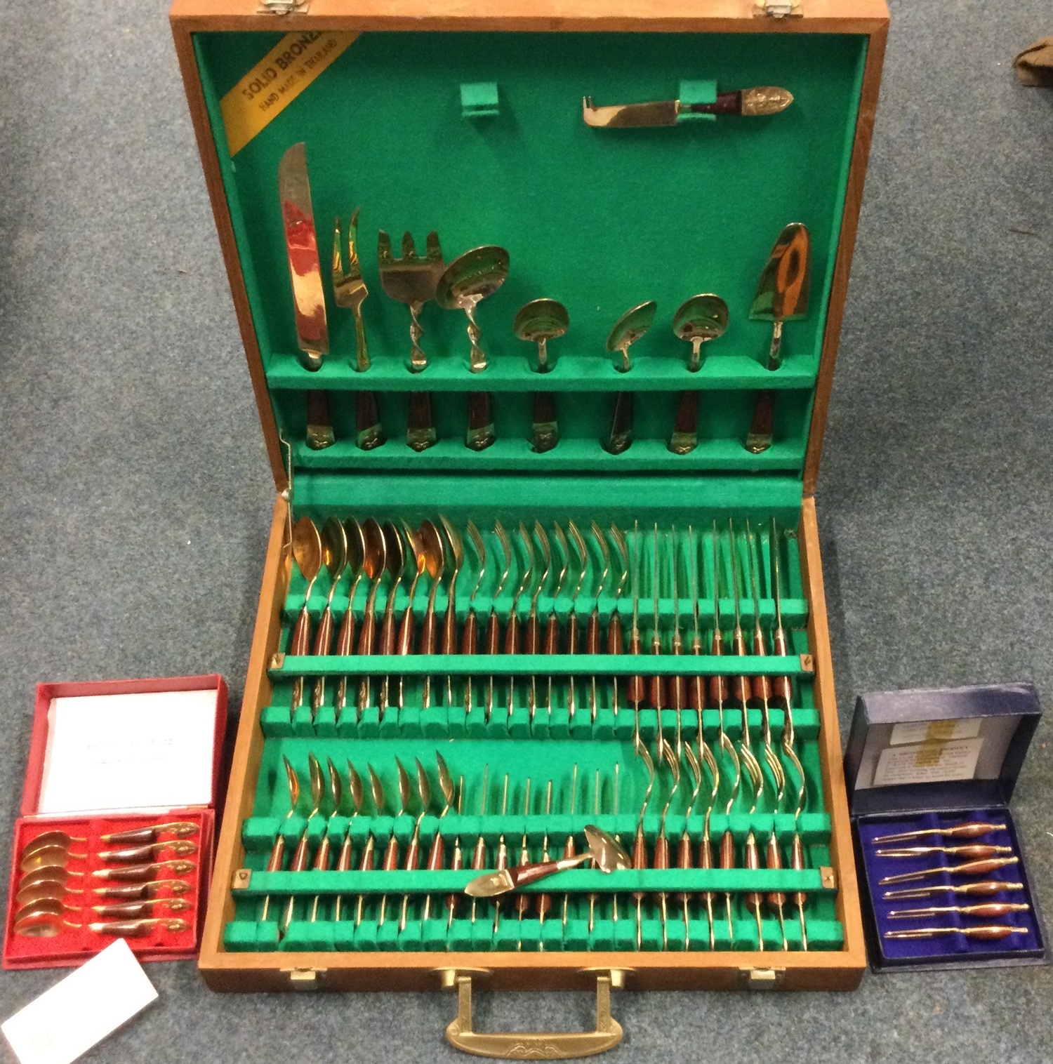 A large brass mounted cutlery service contained within a fitted box. Est. £20 - £30.