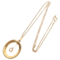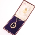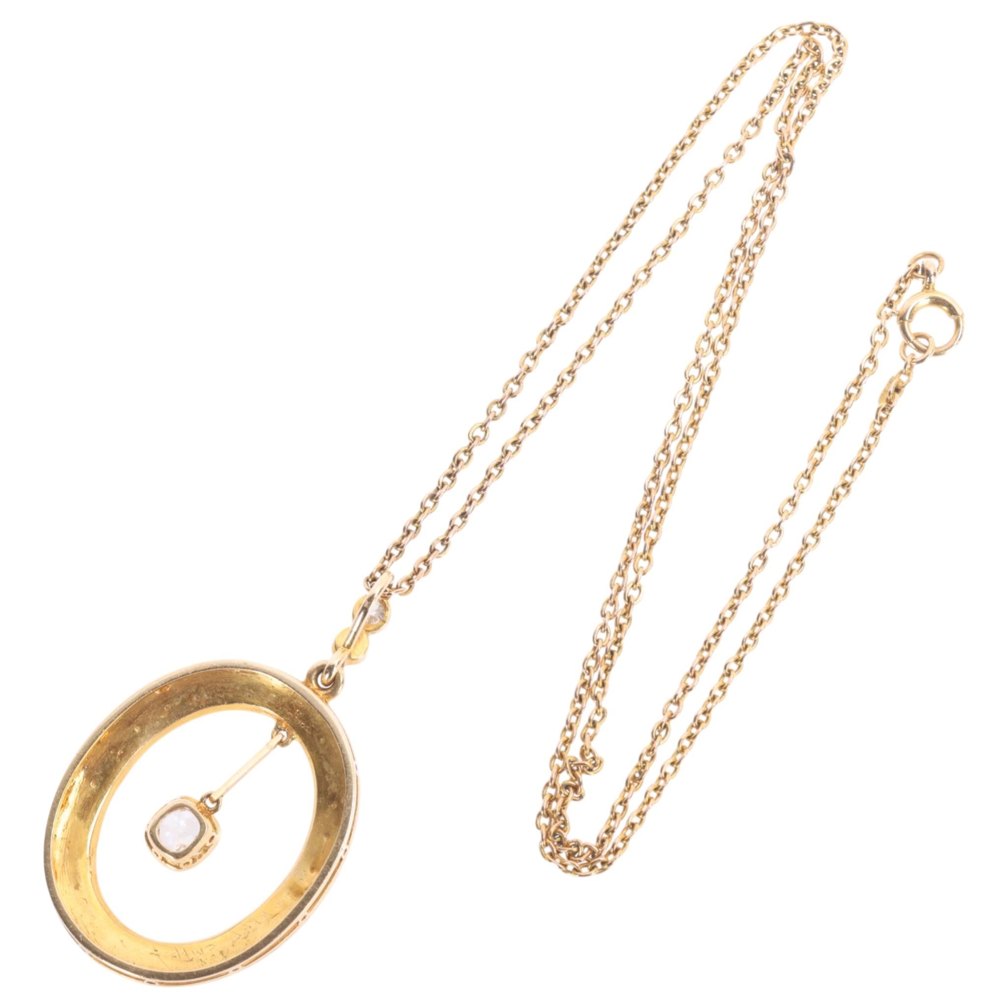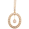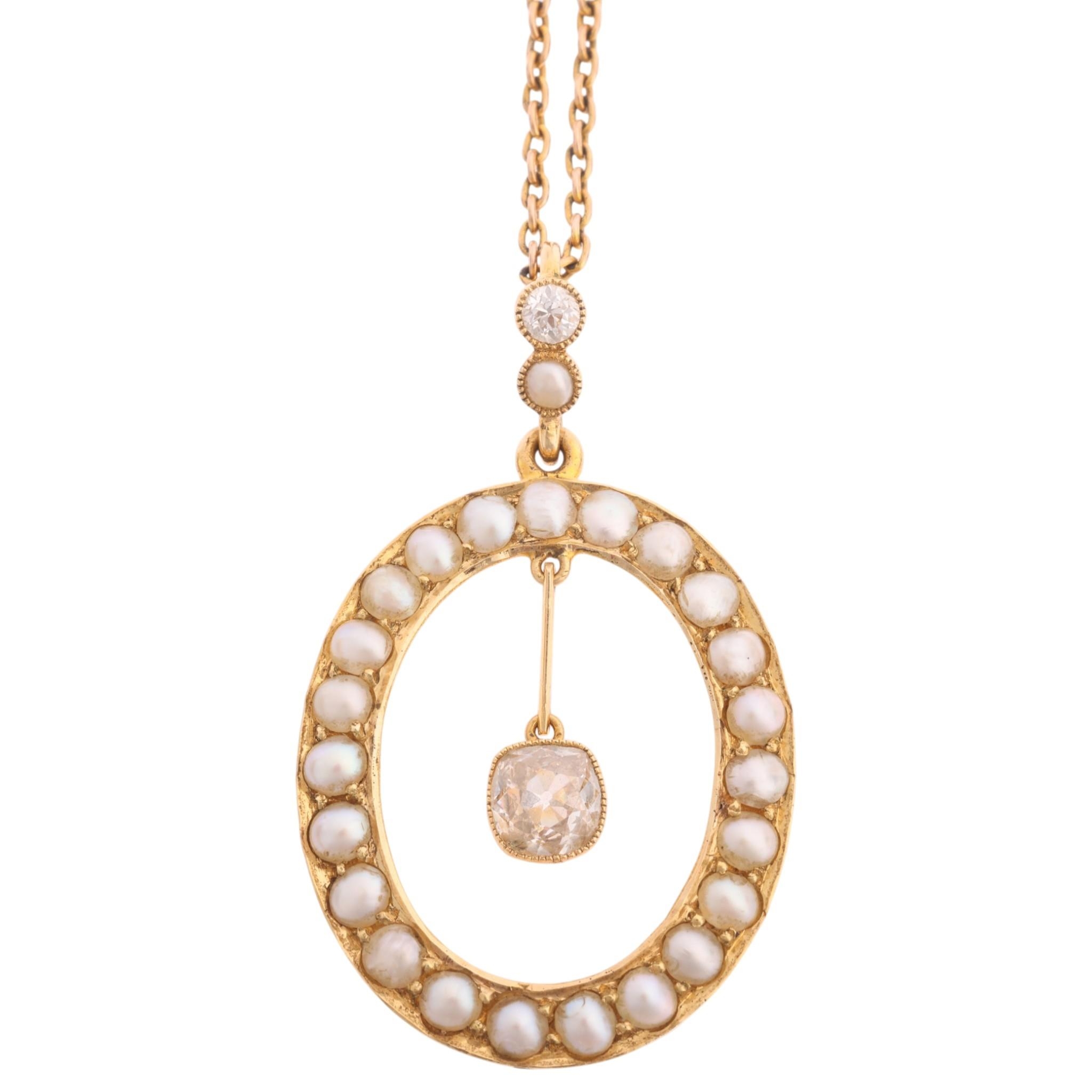 An Antique Edwardian pearl and diamond openwork pendant necklace, the oval frame set with split pearls, suspending a central millegrain set 0.50ct old mine-cut diamond and similarly set bale, unmarked but tests as 15ct on unmarked 9ct cable link chain, pendant 40.2mm, chain 42cm, 7.4g, in original Wartski Ltd fitted tooled purple leather case