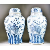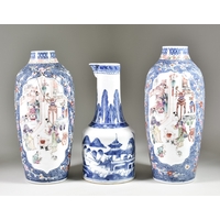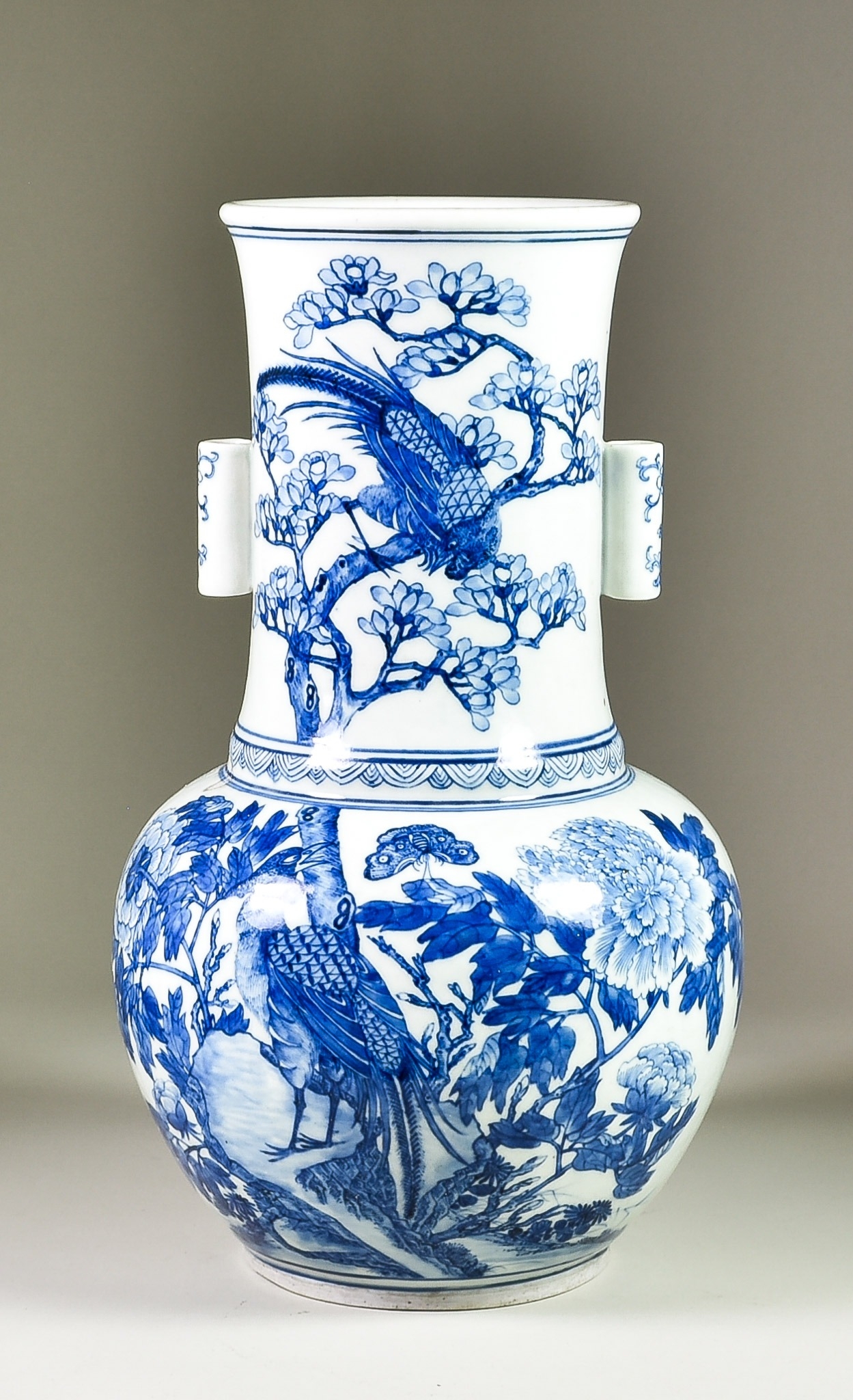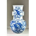 A Chinese Blue and White Porcelain Two-Handled Vase, Late 19th / Early 20th Century, the front painted with exotic birds on flowering branches, the back with two bats, the cylindrical handles with scrolls, 15ins (38.1cm) high