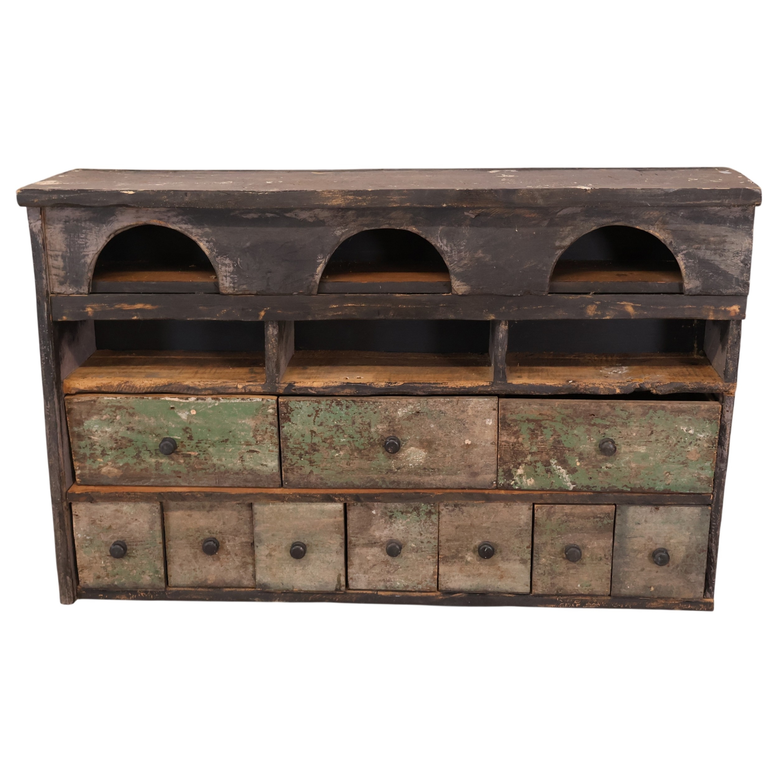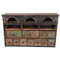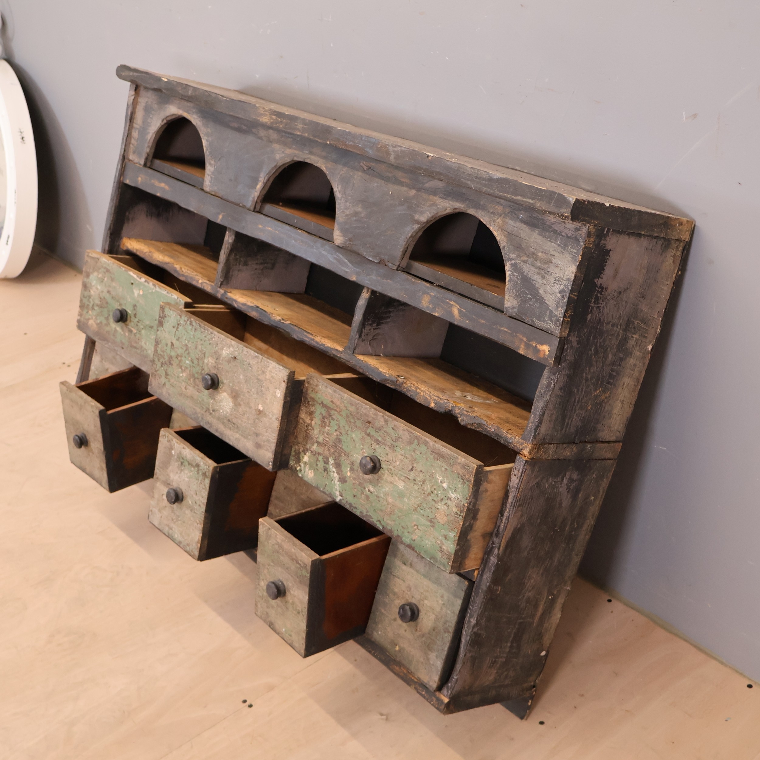 A vintage pine hanging cabinet, fitted with three long and seven short apothecary style drawers. Width 107cm, height 74cm, depth 24cm,