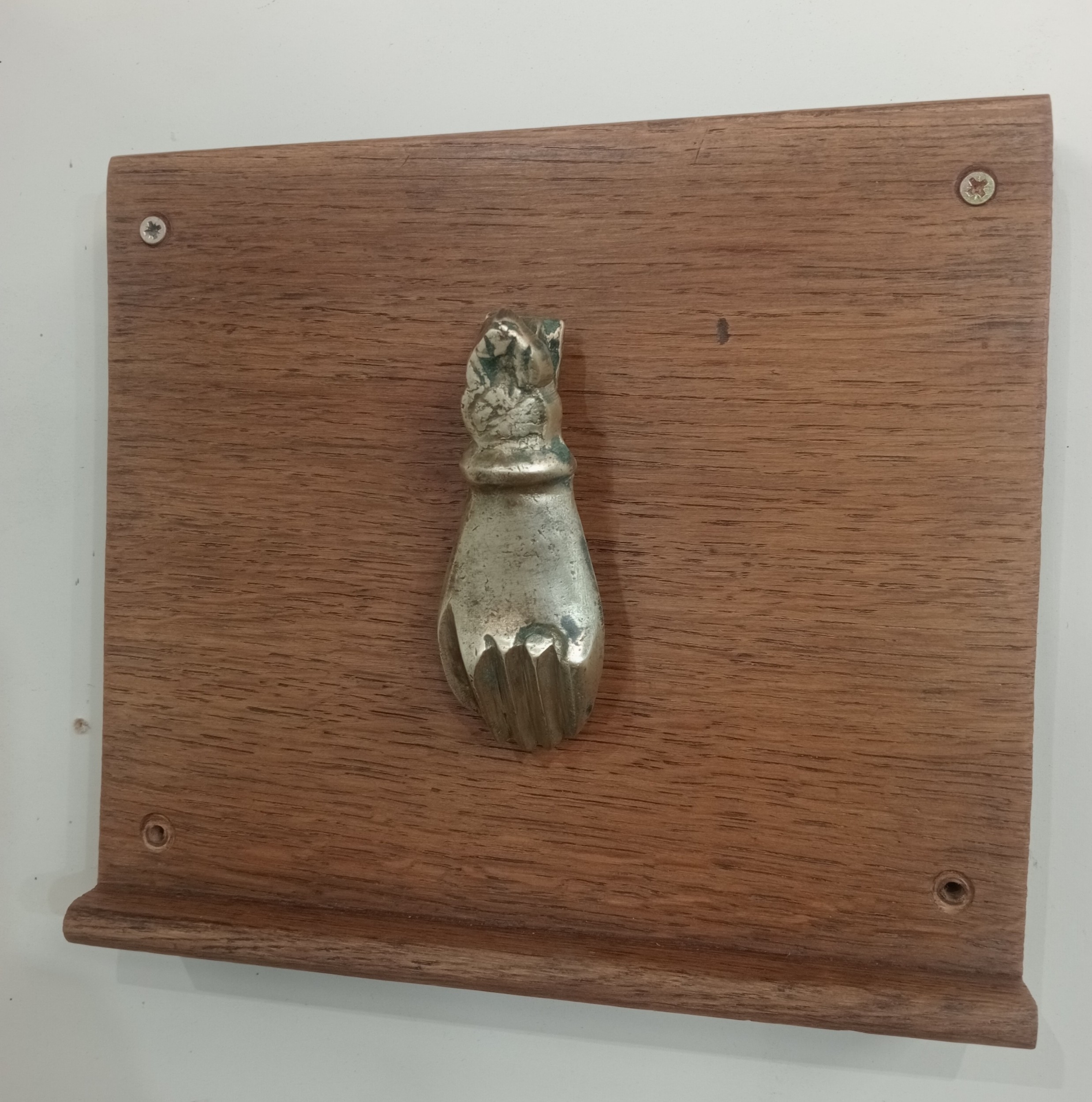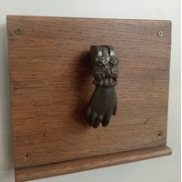 A GILT BRASS DOOR KNOCKER in the form of a hand mounted on a hardwood plaque 21cm (h) x 24cm (w)