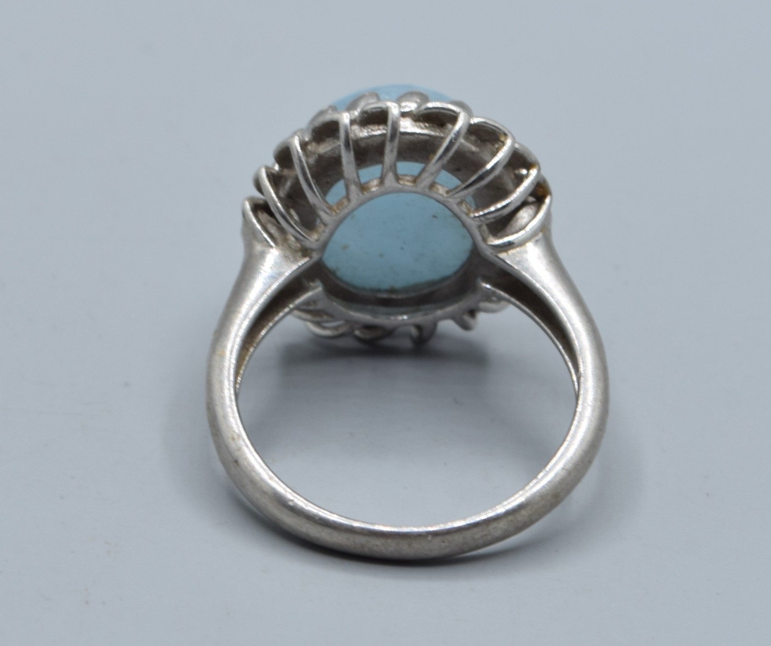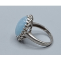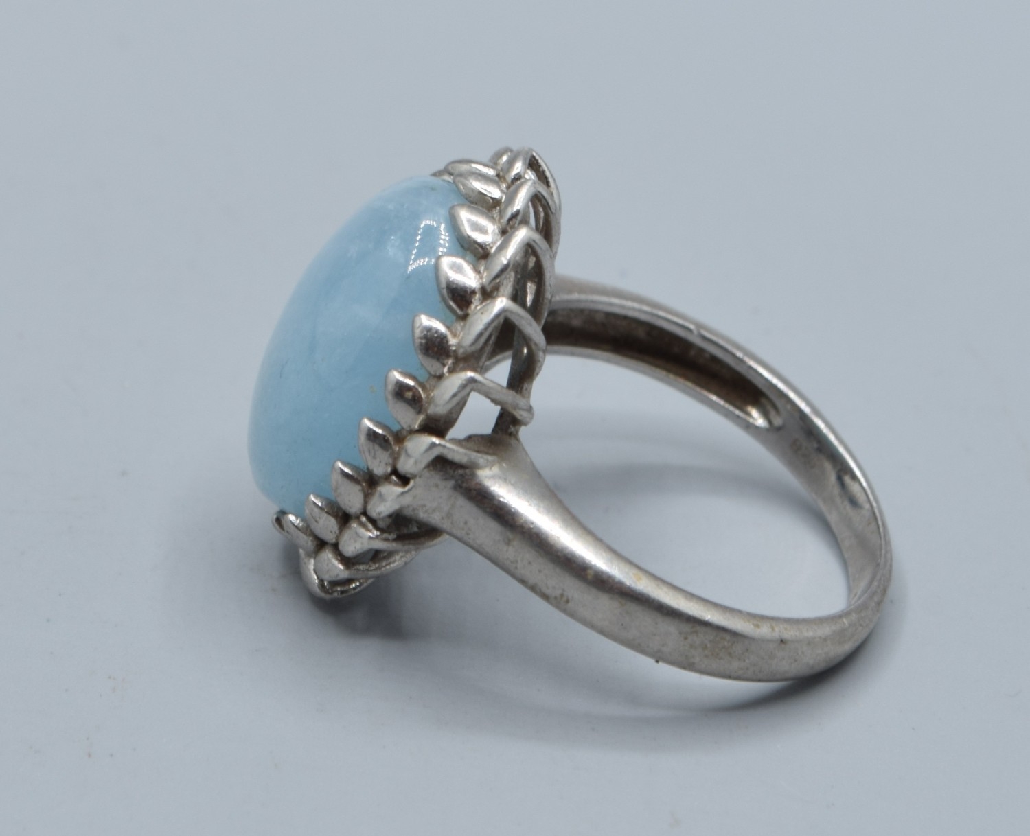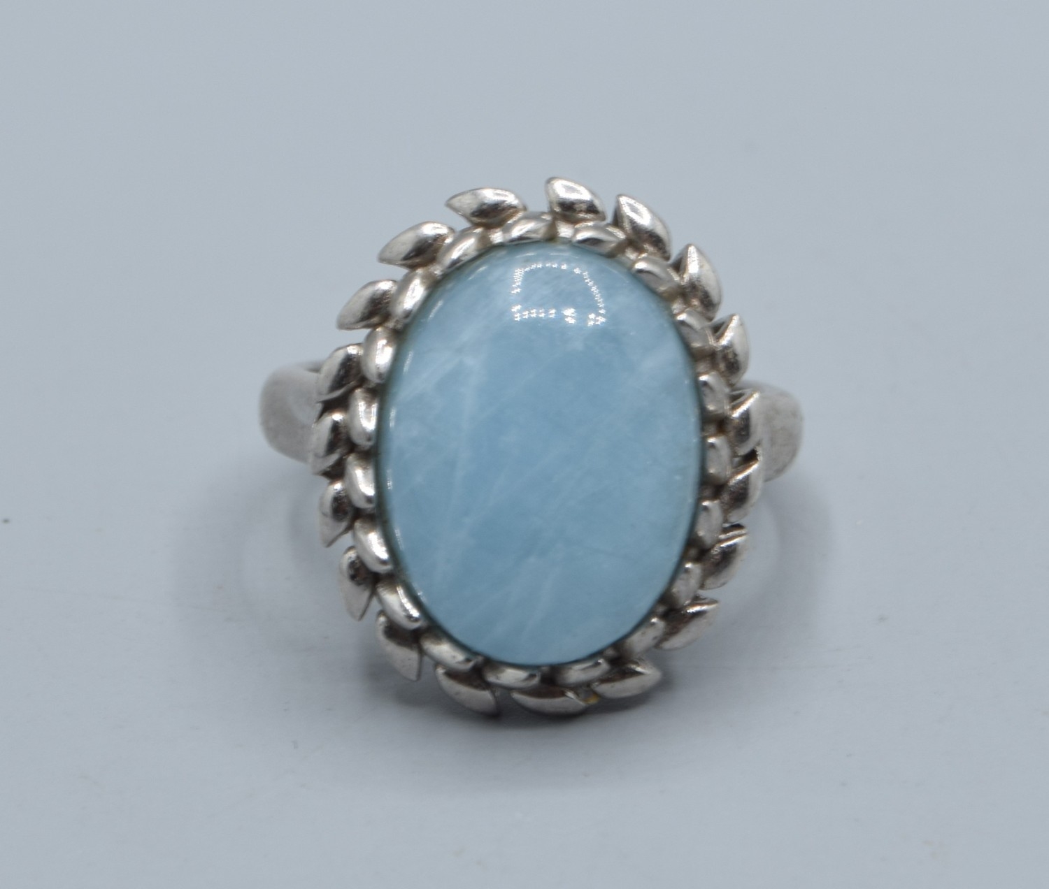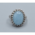 925 silver ladies cabochon polished Amazonite dress ring held in a lural leaf setting size P