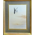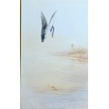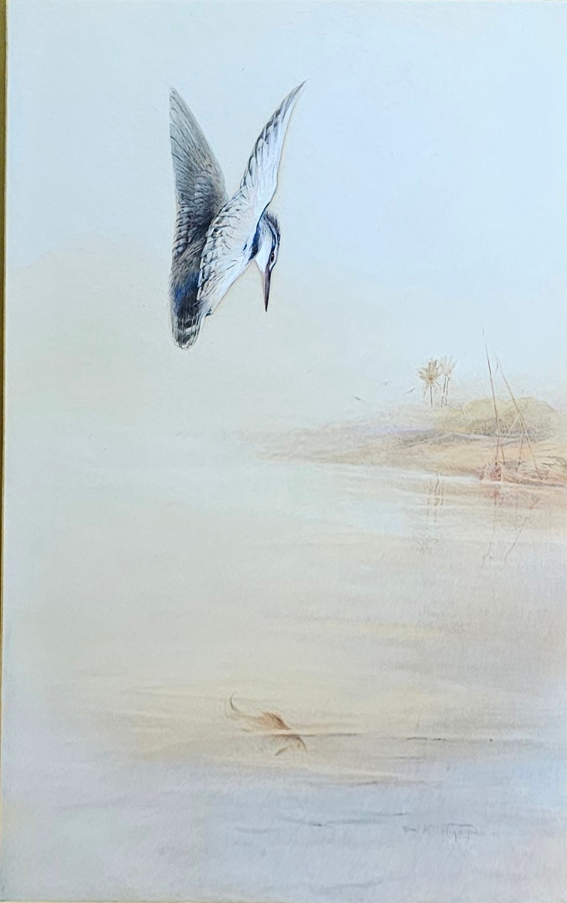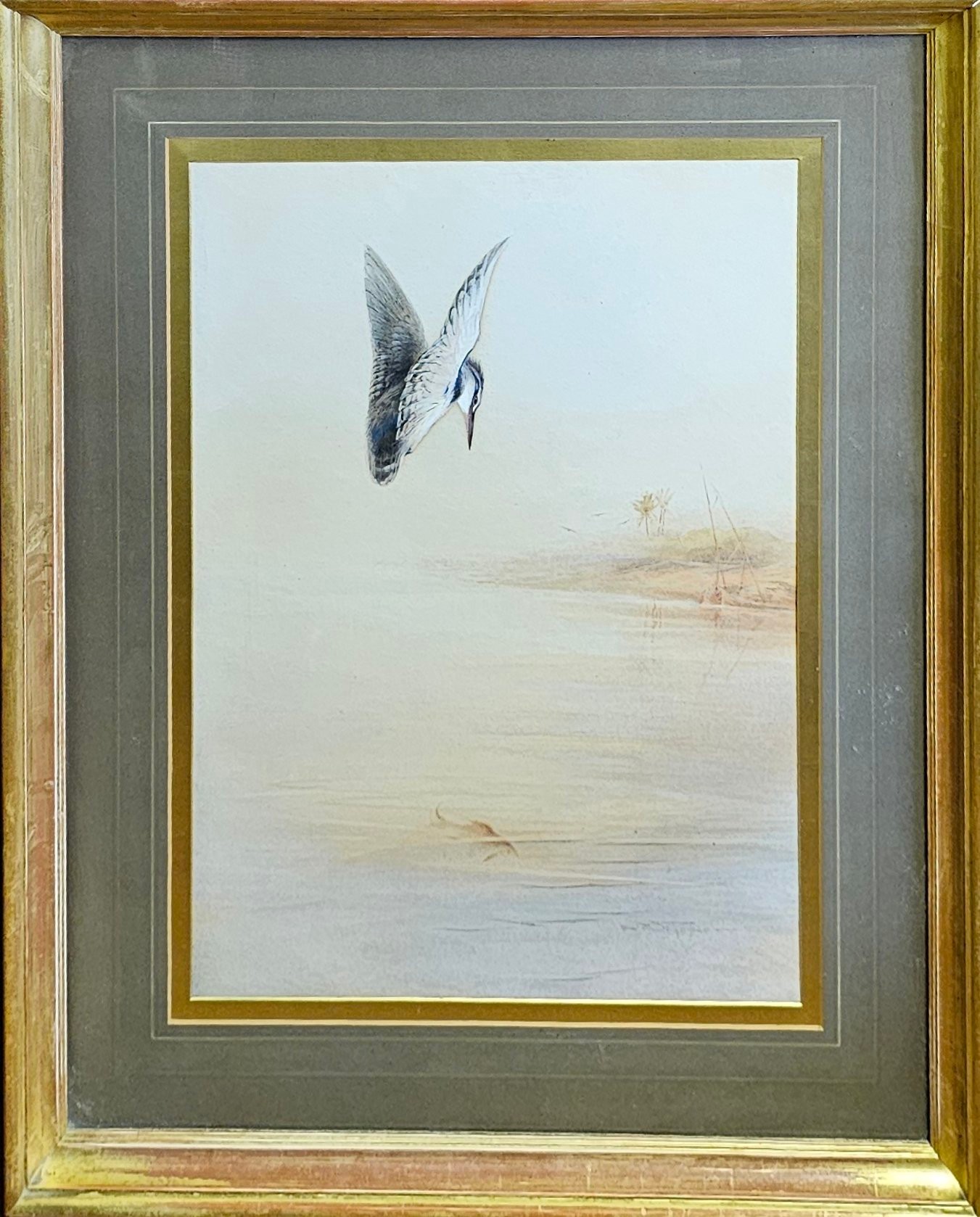 Landscape, study of a kingfisher on a riverbank with palm trees, signed lower right, framed and glazed.