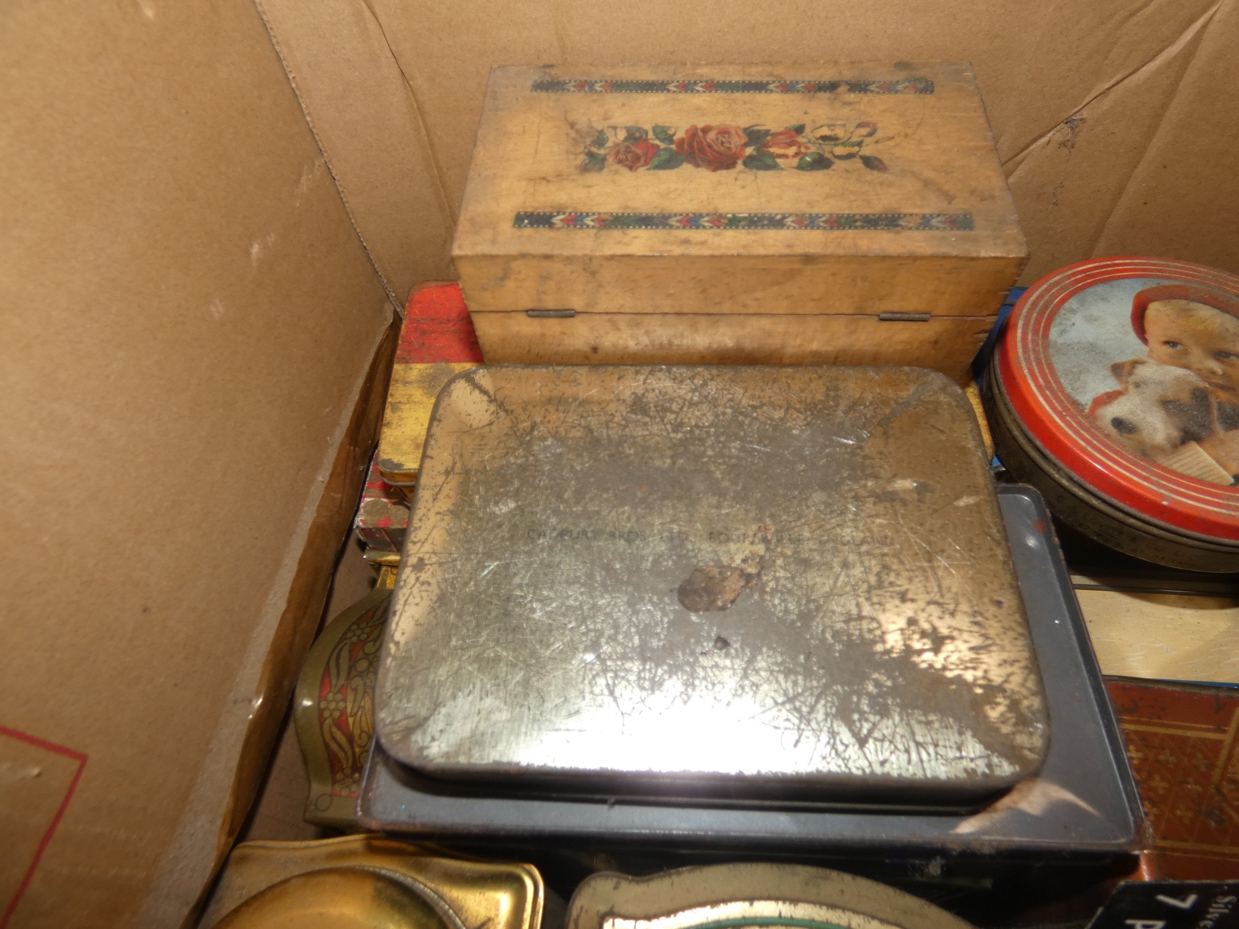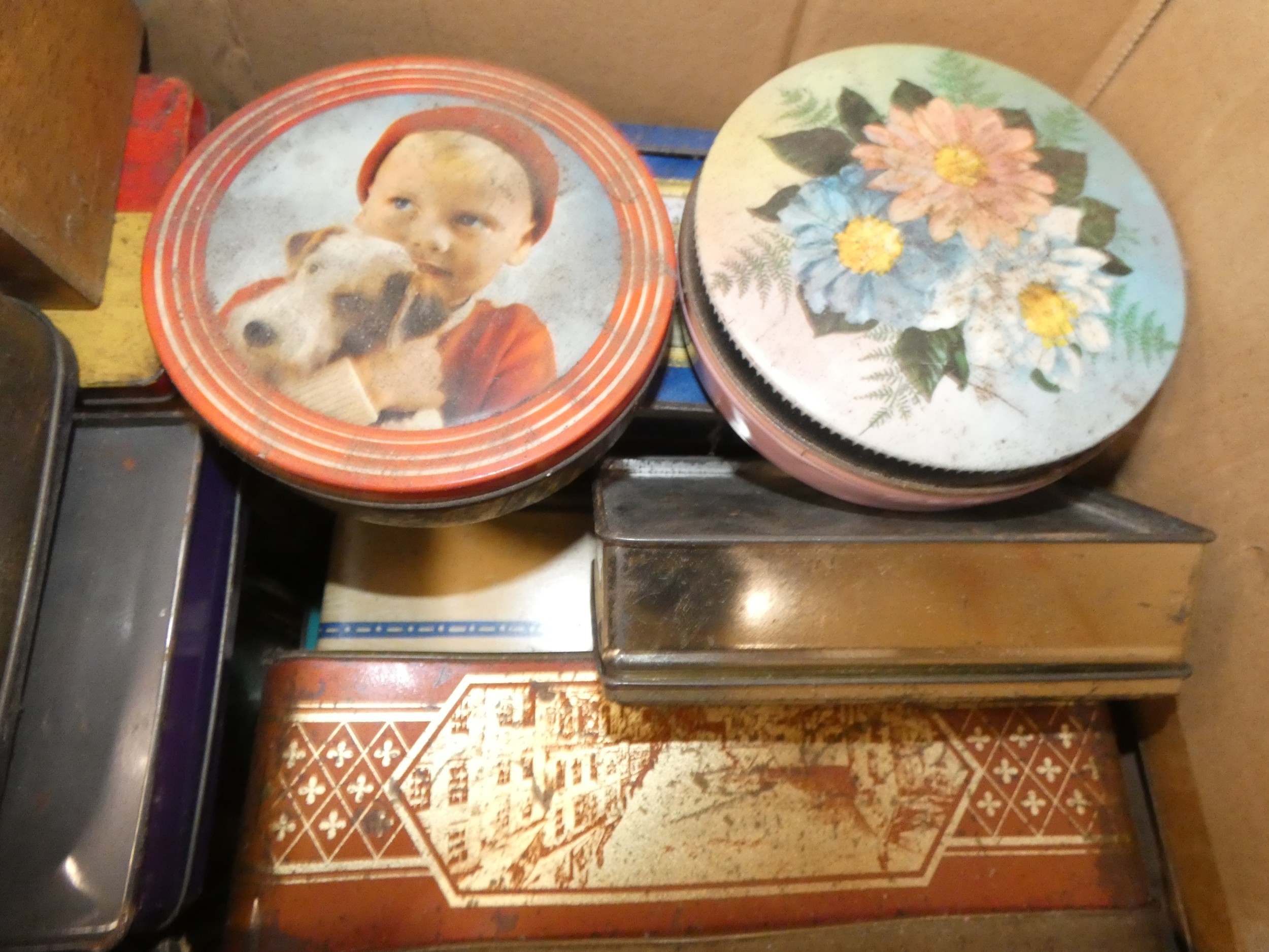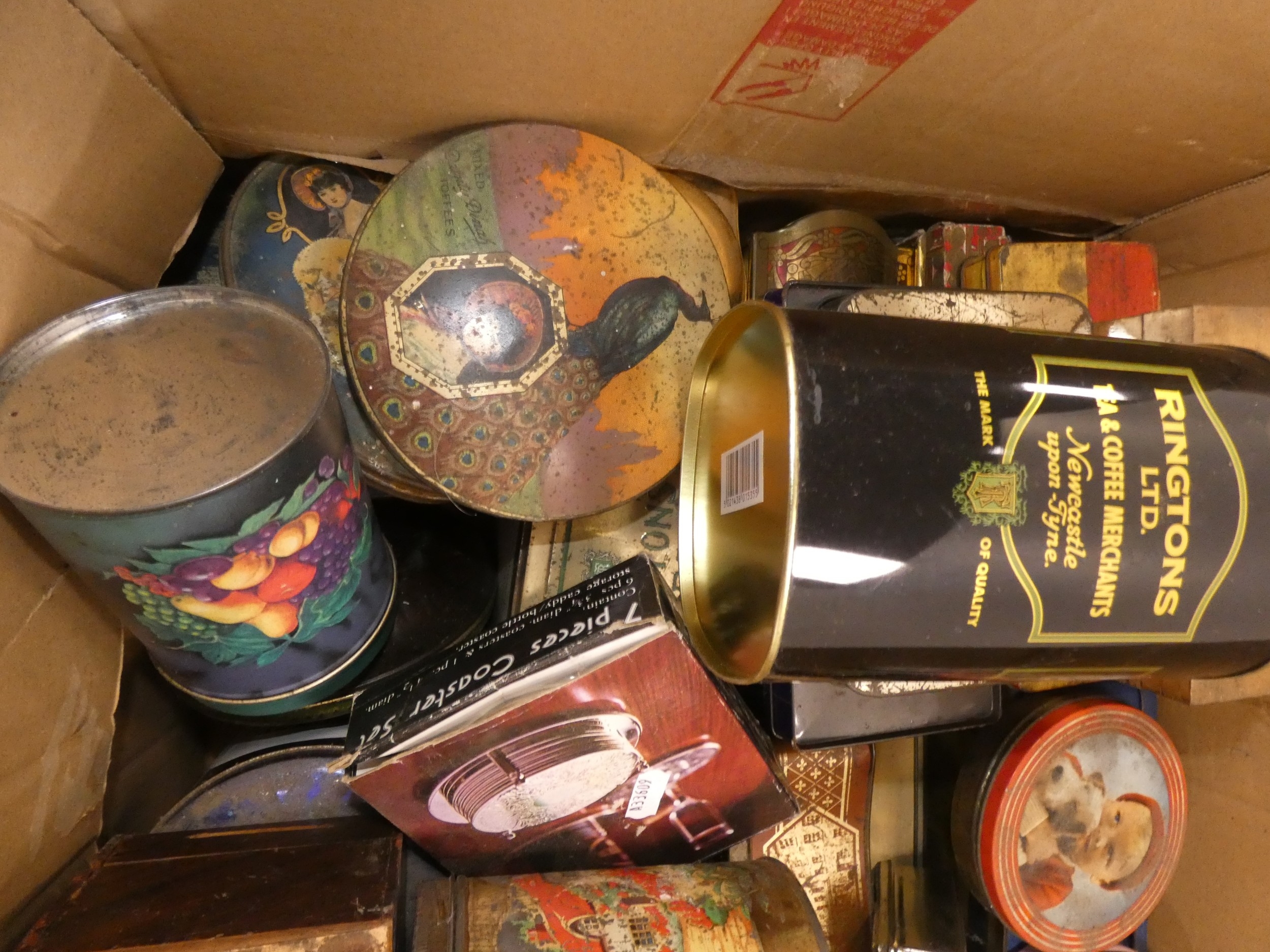 Large carton containing tins to include Rington's Tea, Danish toffee, also a set of coasters etc.