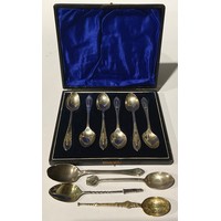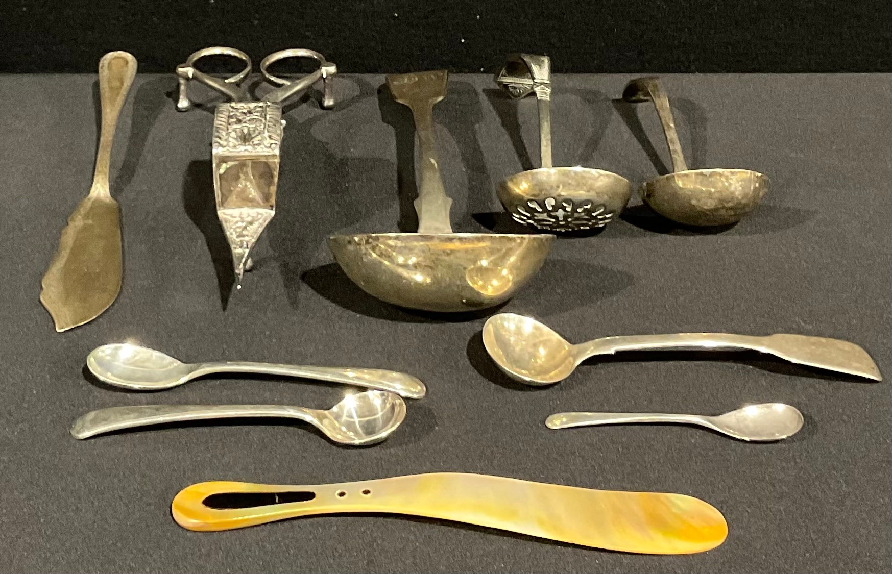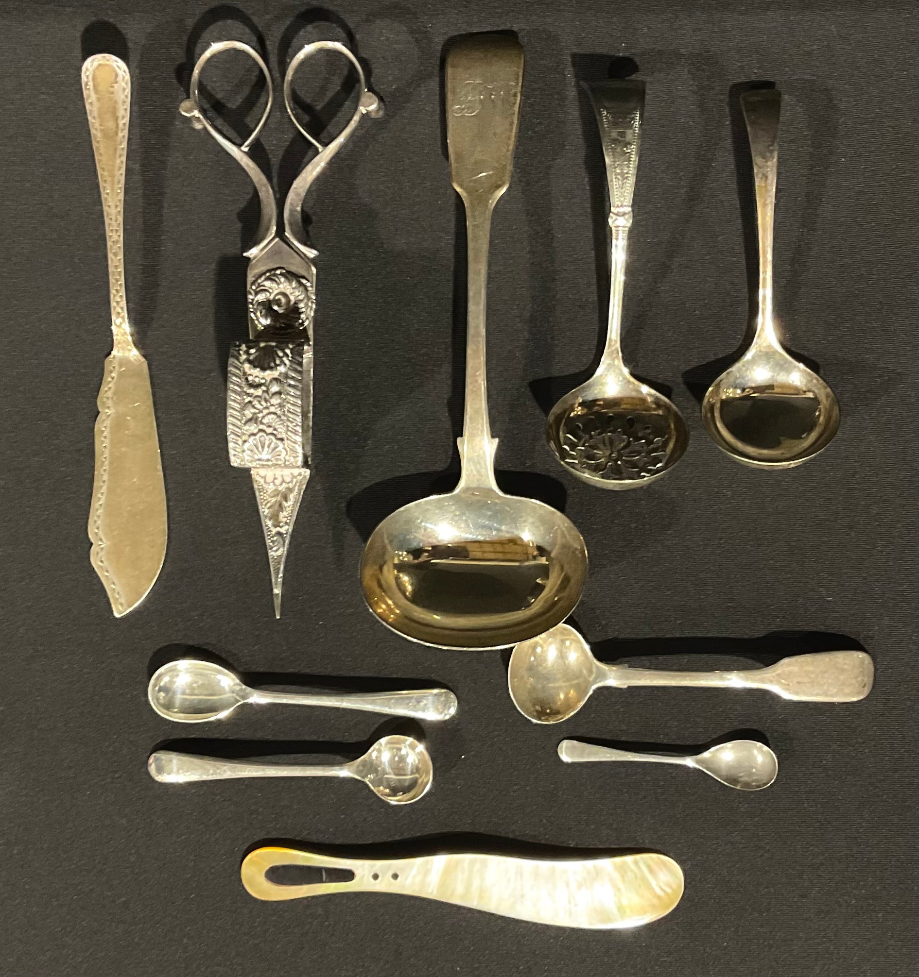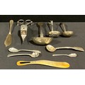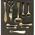 A Victorian silver sauce ladle, Elizabeth Eaton, London 1846; another smaller Sheffield 1966, fish knife, Sheffield 1917 etc 141g gross, silver plated wick trimmer etc
