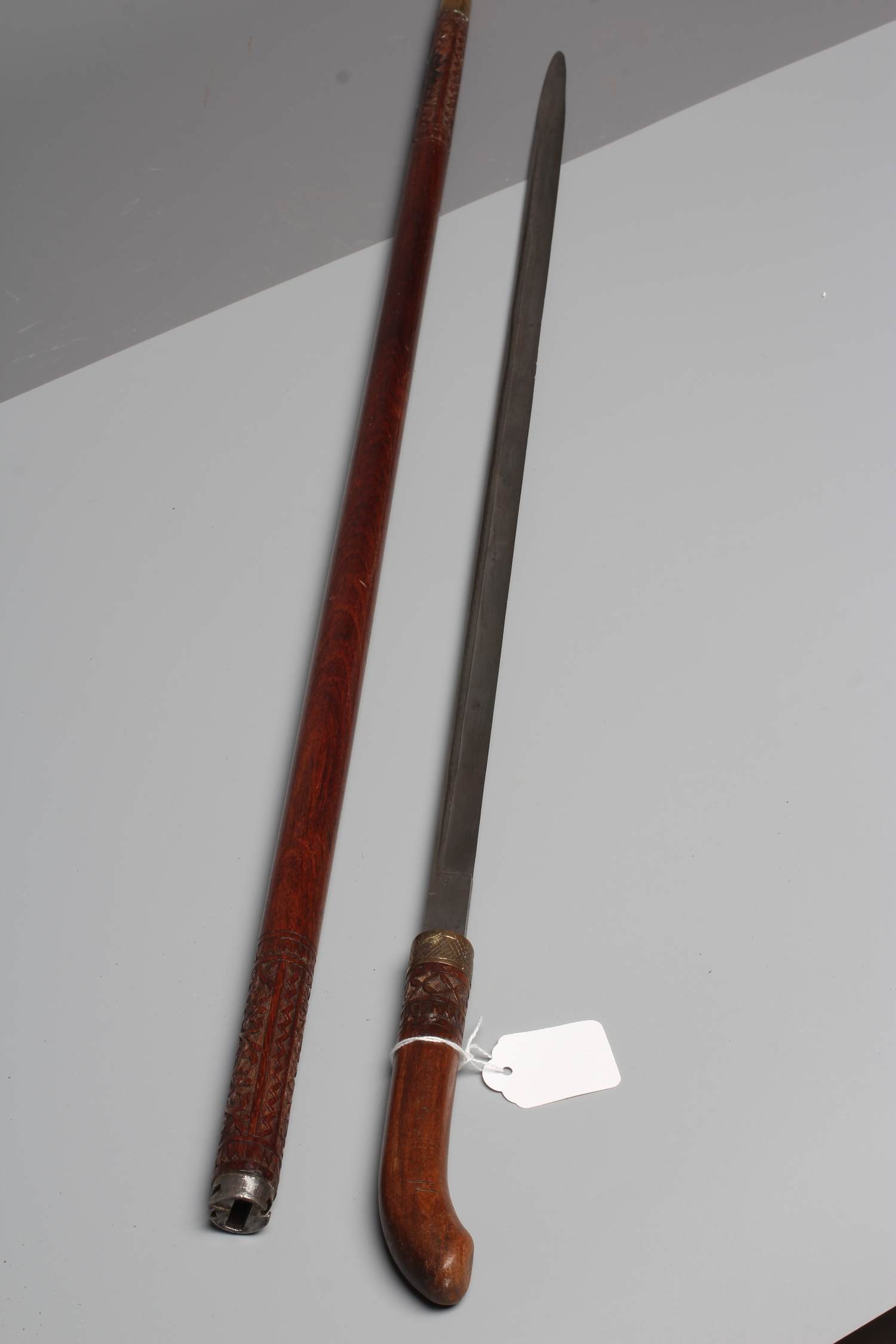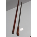 AN ANGLO INDIAN SWORD STICK, early 20th century, with 23 1/2" fullered blade, floral carved wood grip and scabbard, and twist release fuller, 36 1/2" long