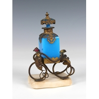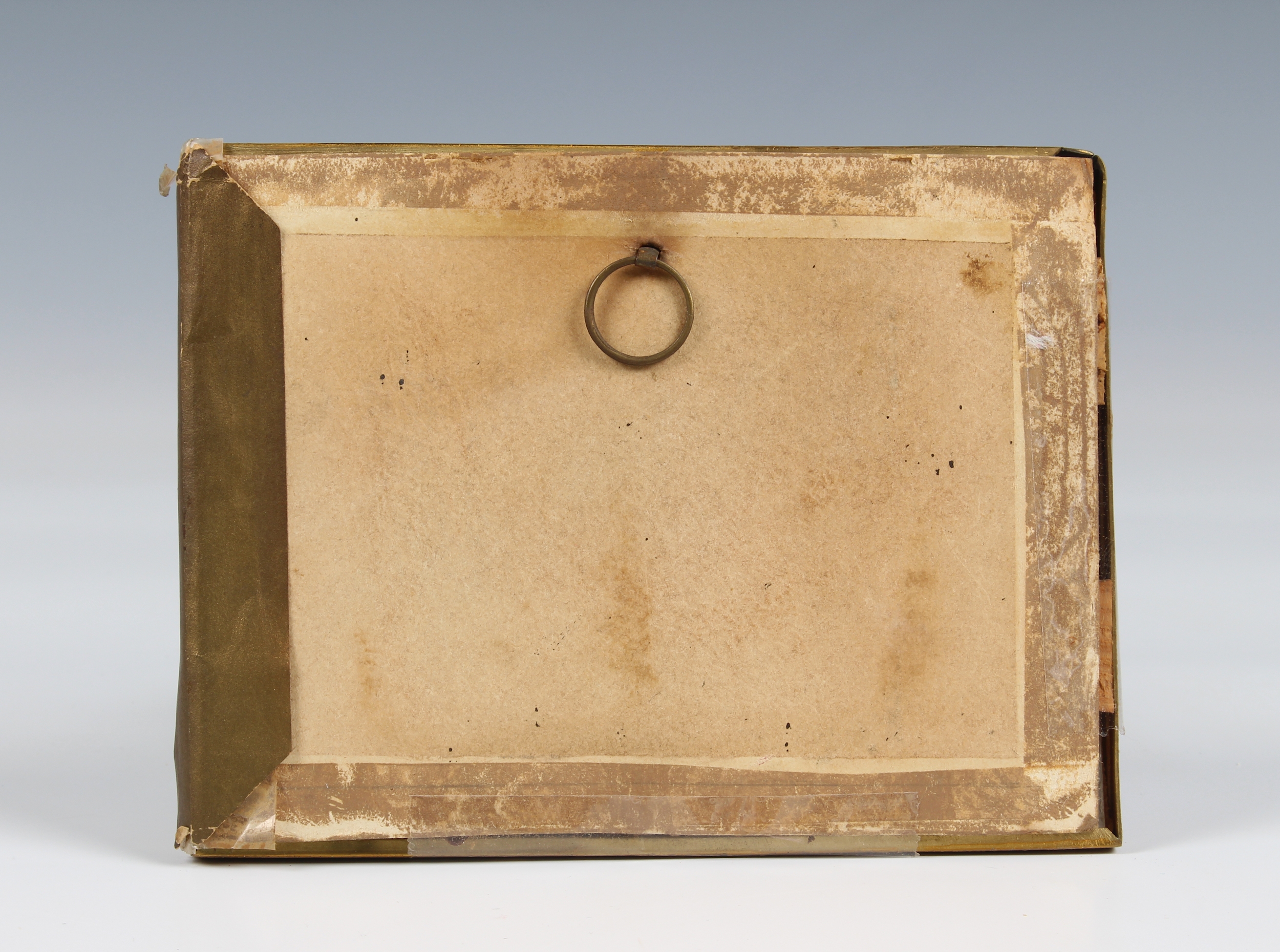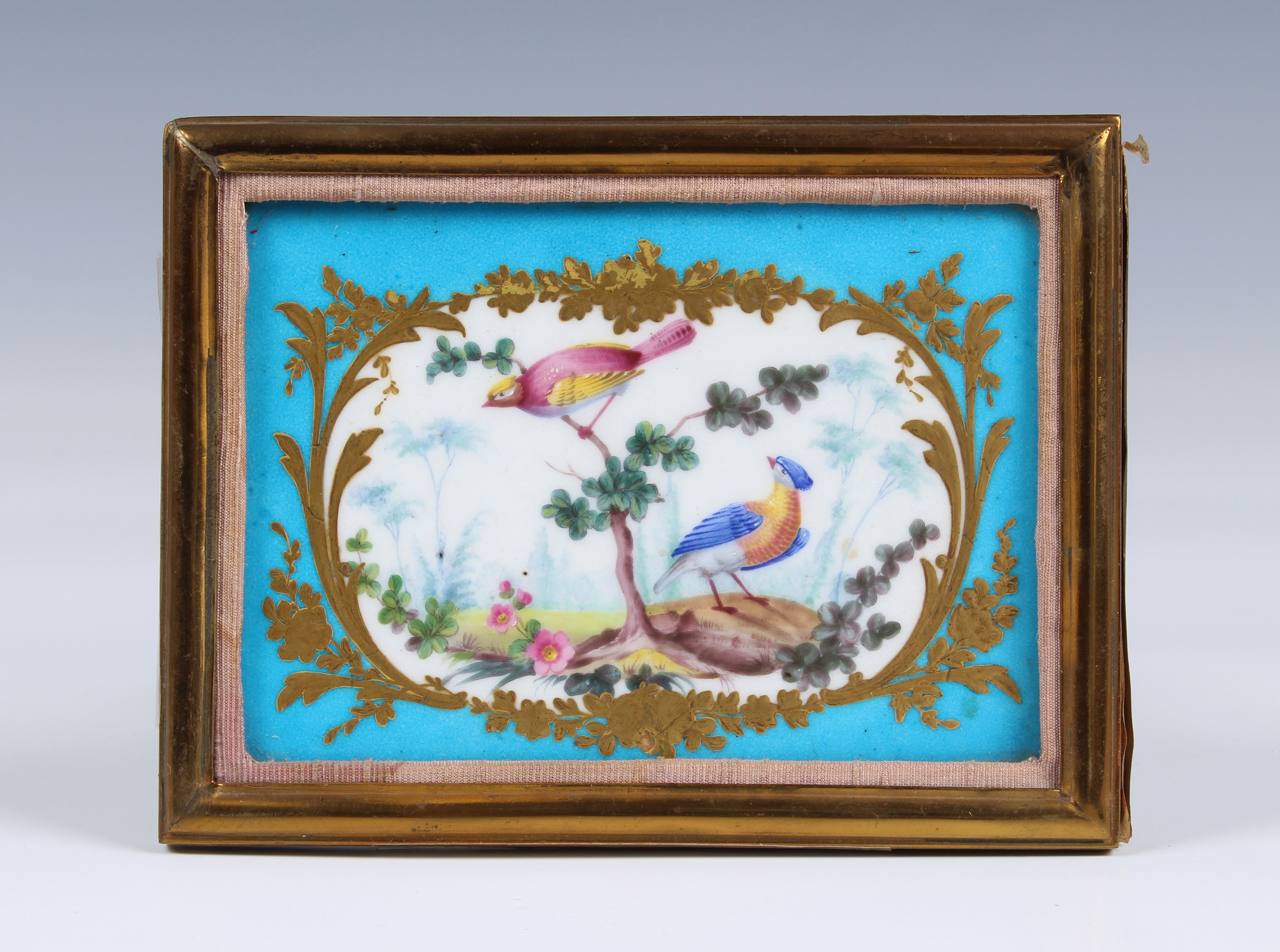 A small Sevres style porcelain plaque 19th century, painted with a mirror shaped reserve with birds in a wooded landscape, with gilt foliate borders, on a celeste blue ground, 3 1/8 x 4½in. (7.9 x 11.4cm.), gilt framed. *Some gilt wear. No other faults.