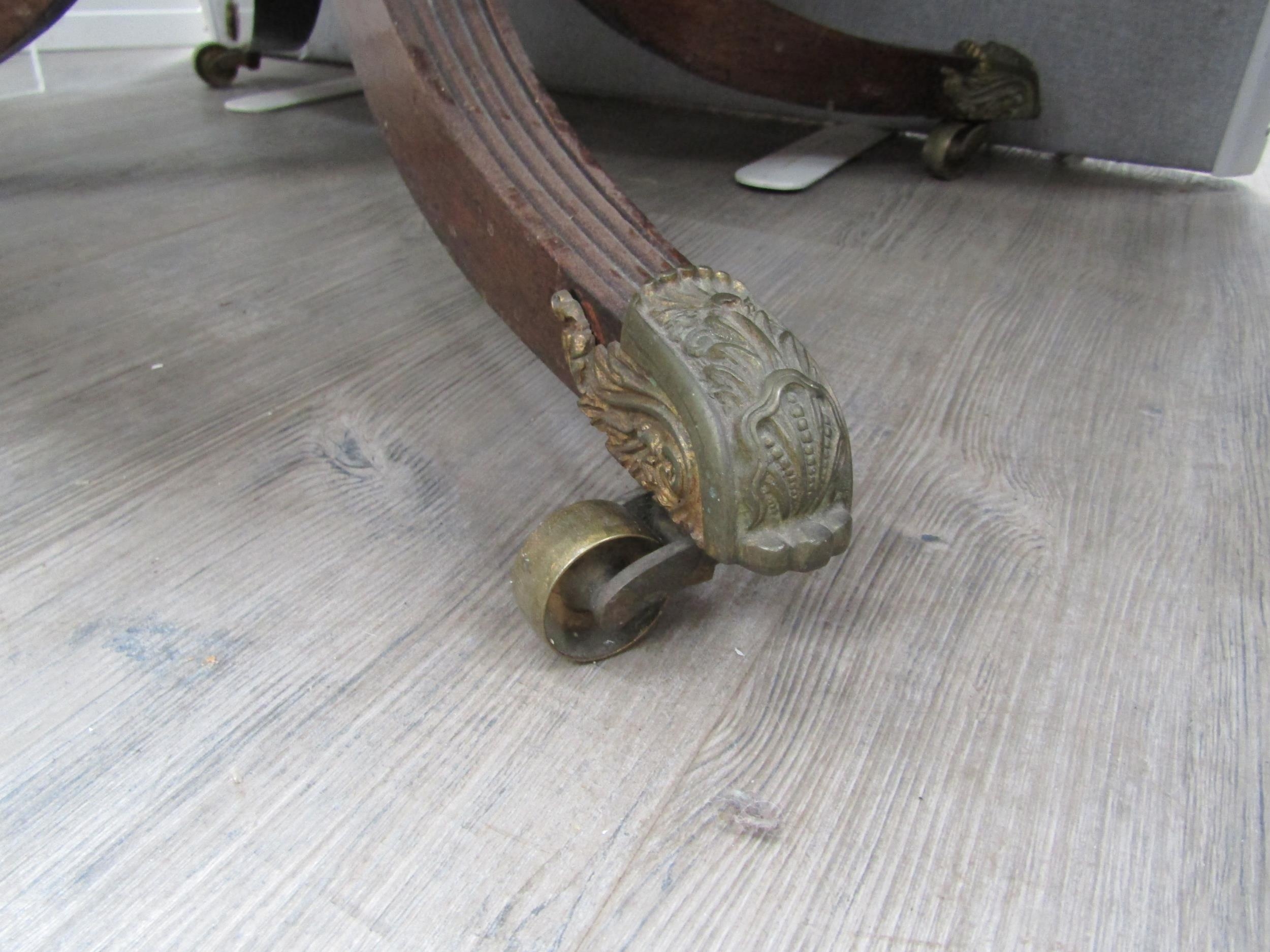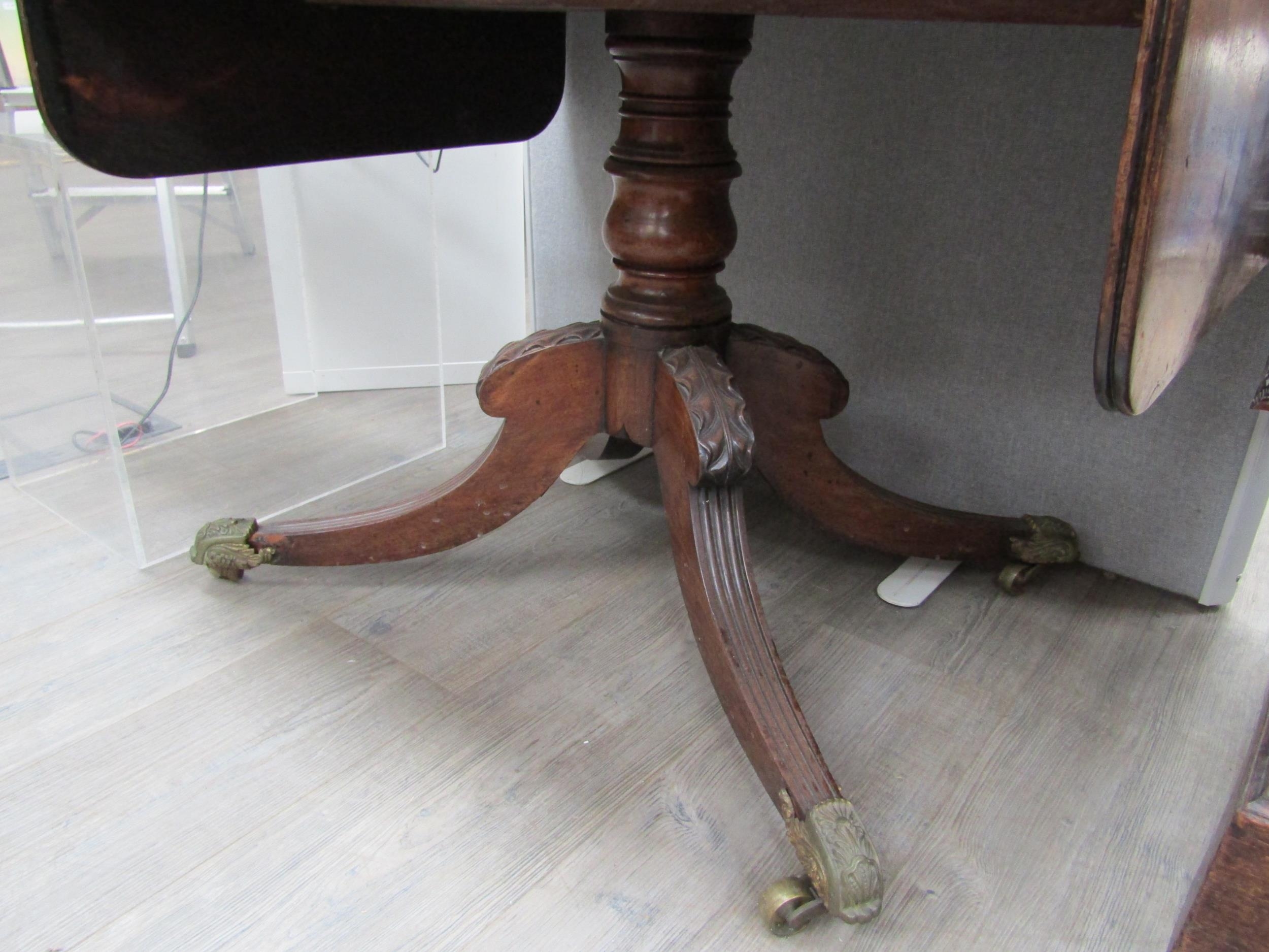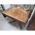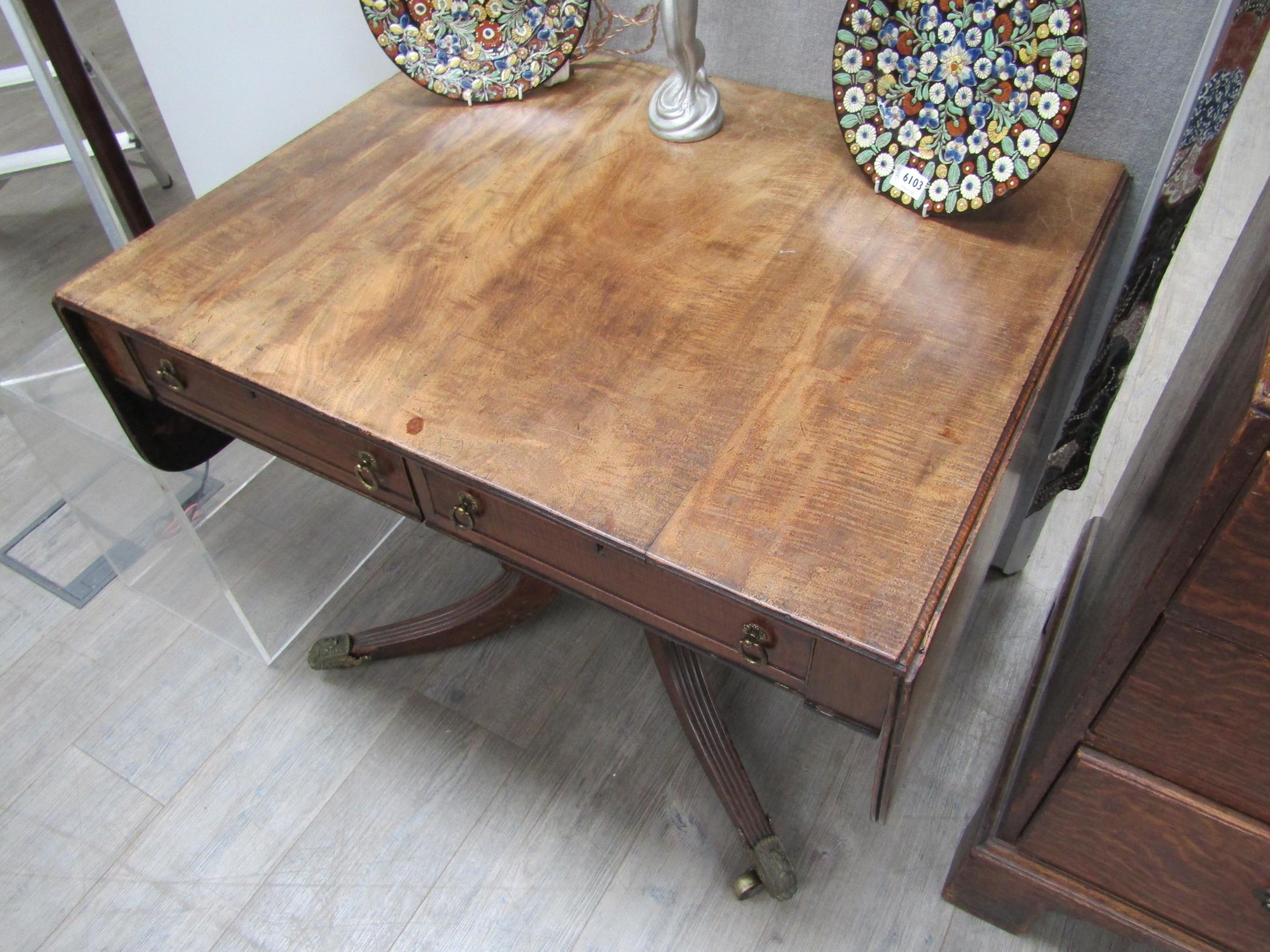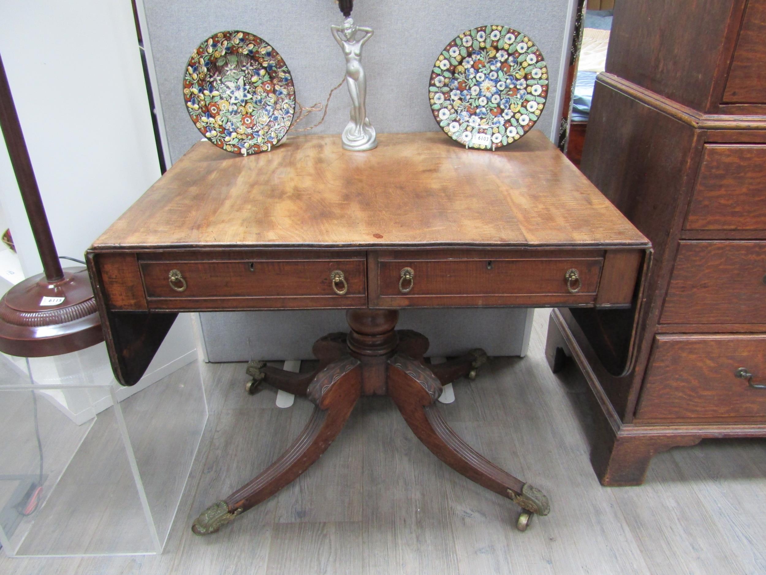 A Regency mahogany sofa table with two drawers turned stem to quatraform base, reeded legs to cup castors, 71cm x 88cm x 68cm
