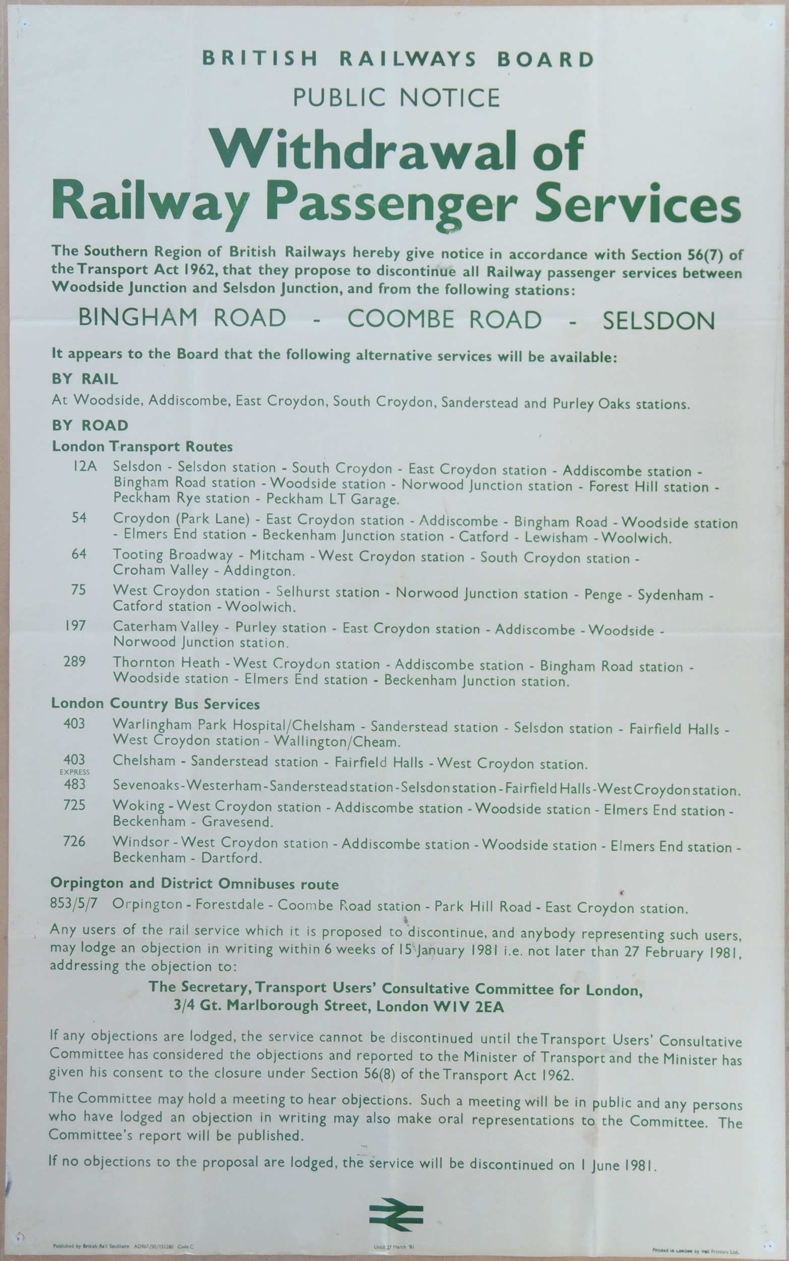 BR(S) Poster Bingham Road and Selsdon closure, folded. (D2) (Dispatch by Mailboxes/Collect from Banbury Depot)