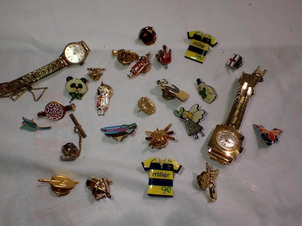Two ladies wristwatches and mixed enamel pin badges. UK P&P Group 1 (£16+VAT for the first lot and £2+VAT for subsequent lots)
