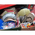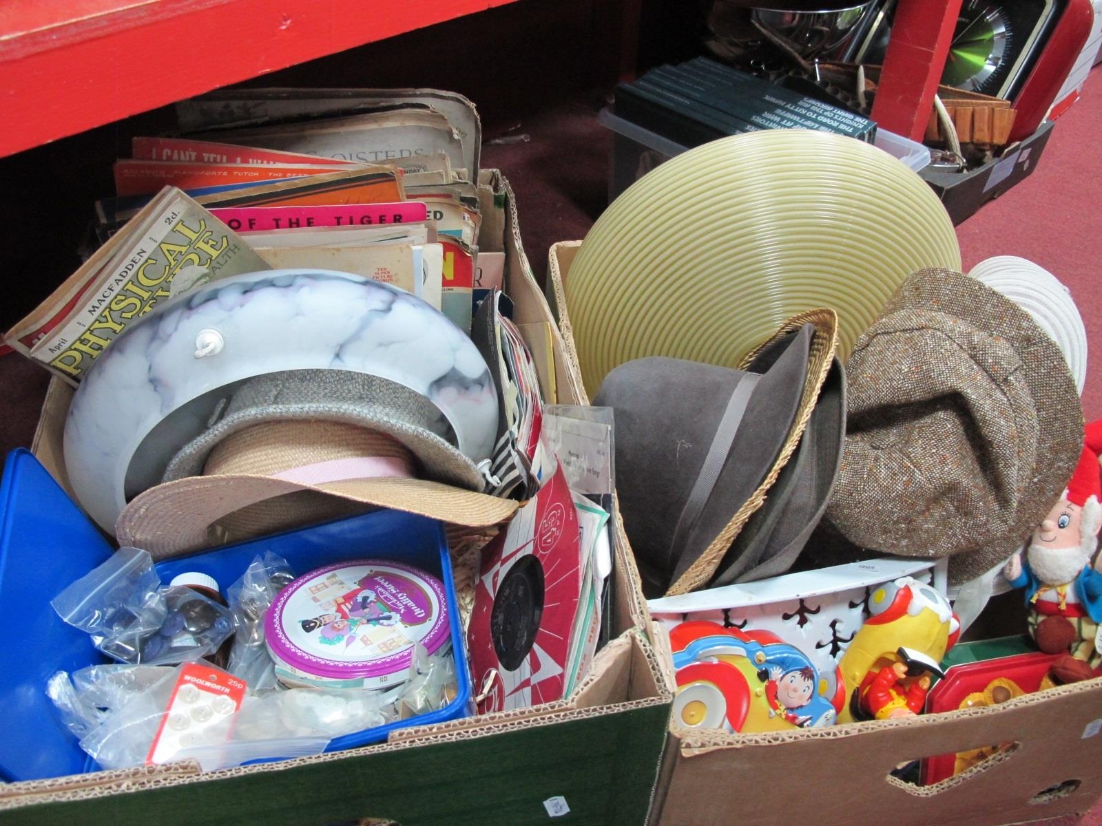 Hats, Noddy Car and tin, mottled glass and plastic ceiling lights, buttons, magazines, 45rpm records, etc:- Two Boxes.