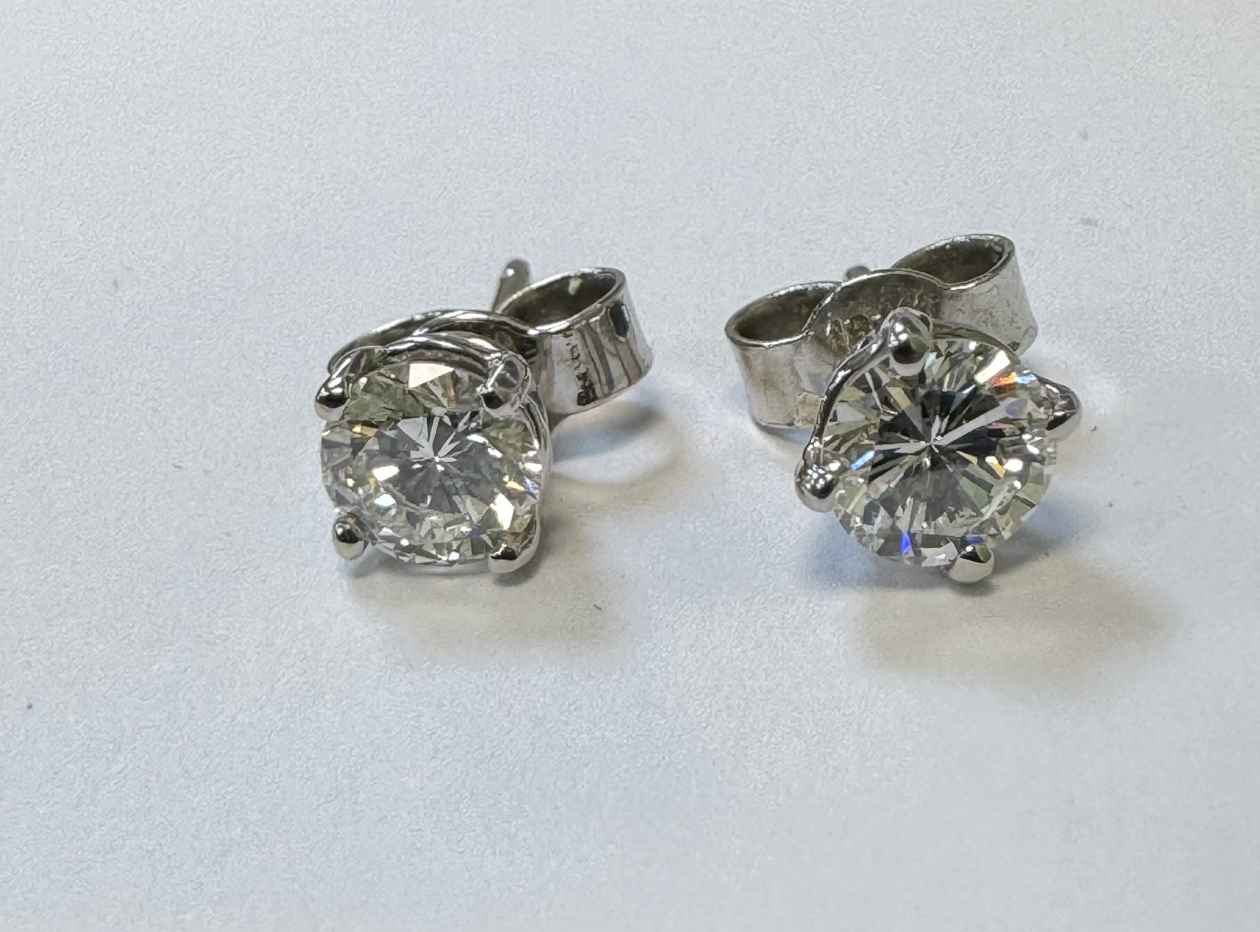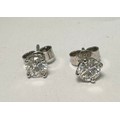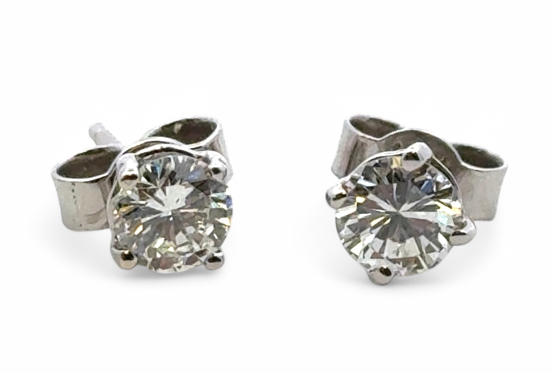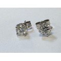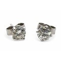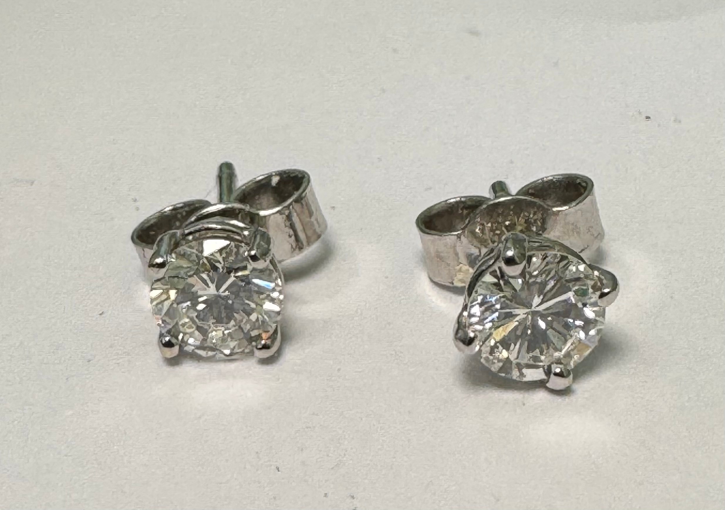 A pair of diamond stud earrings in a four claw setting stamped as 18ct white gold. Total diamond weight approx 1ct. Weight 1.44g. Diamonds estimated VS clarity, colour Unknown ff natural or lab grown. Viewing recommended.