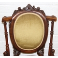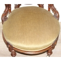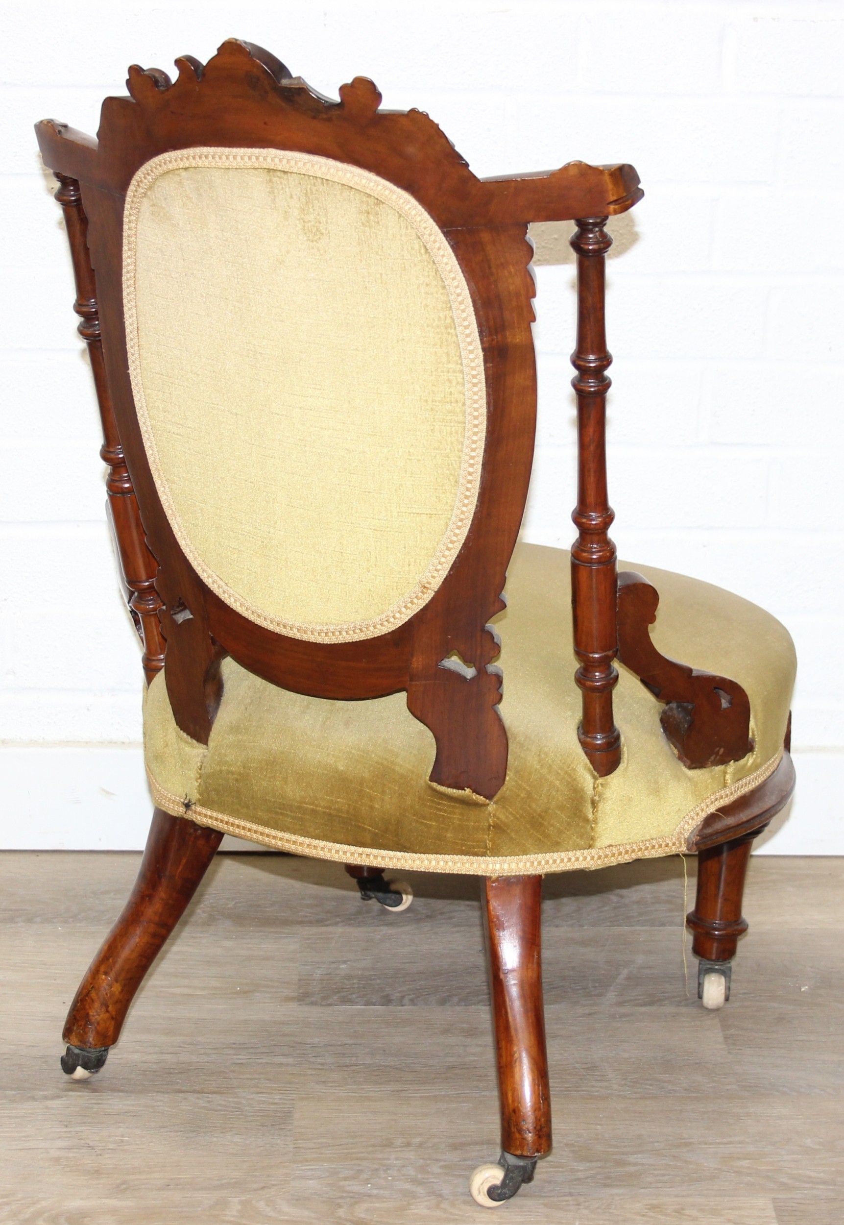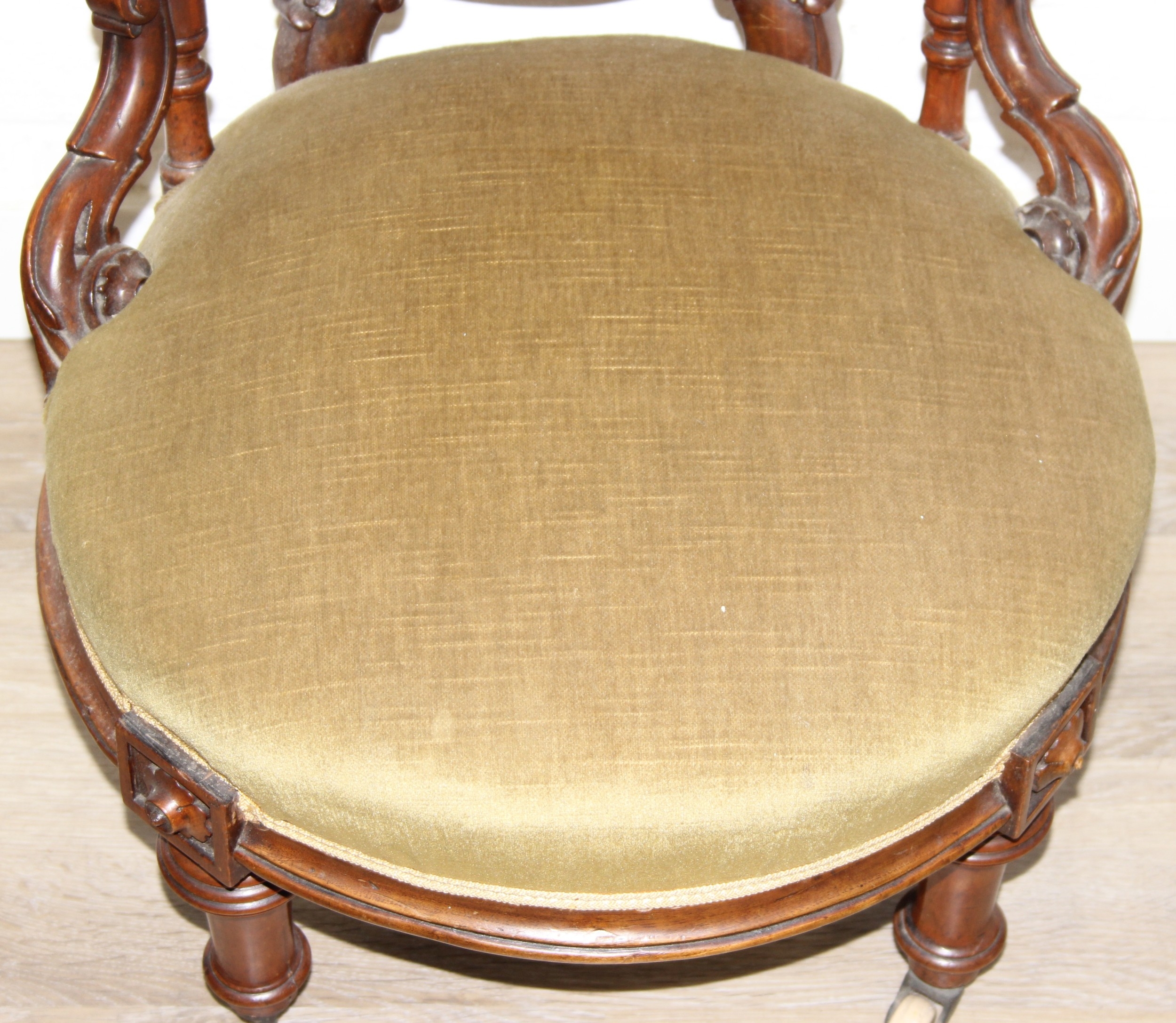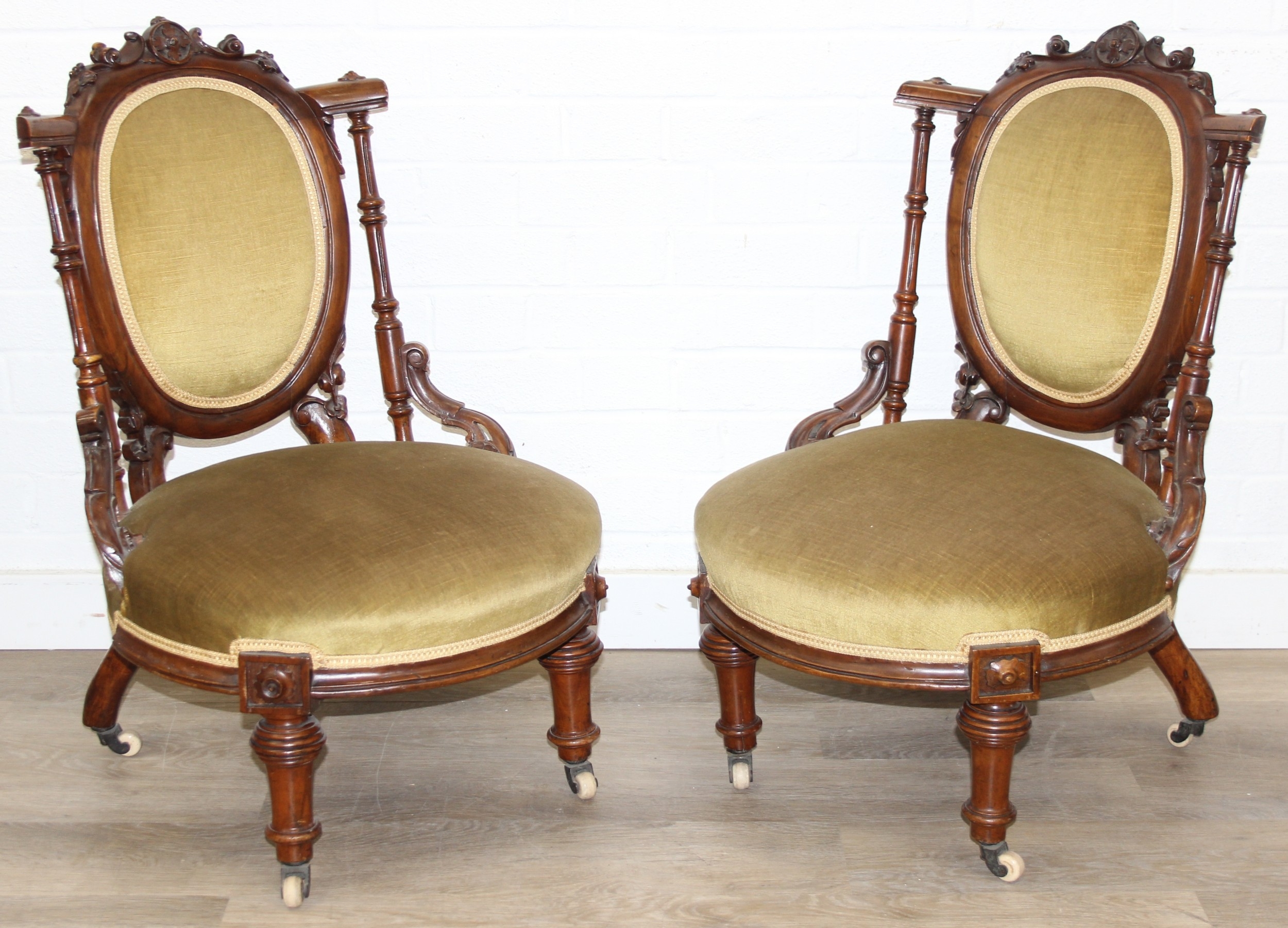 A pair of decorative shield back armchairs with exposed carved frames and ceramic castors, 19th century, with green upholstery, each 77cm tall