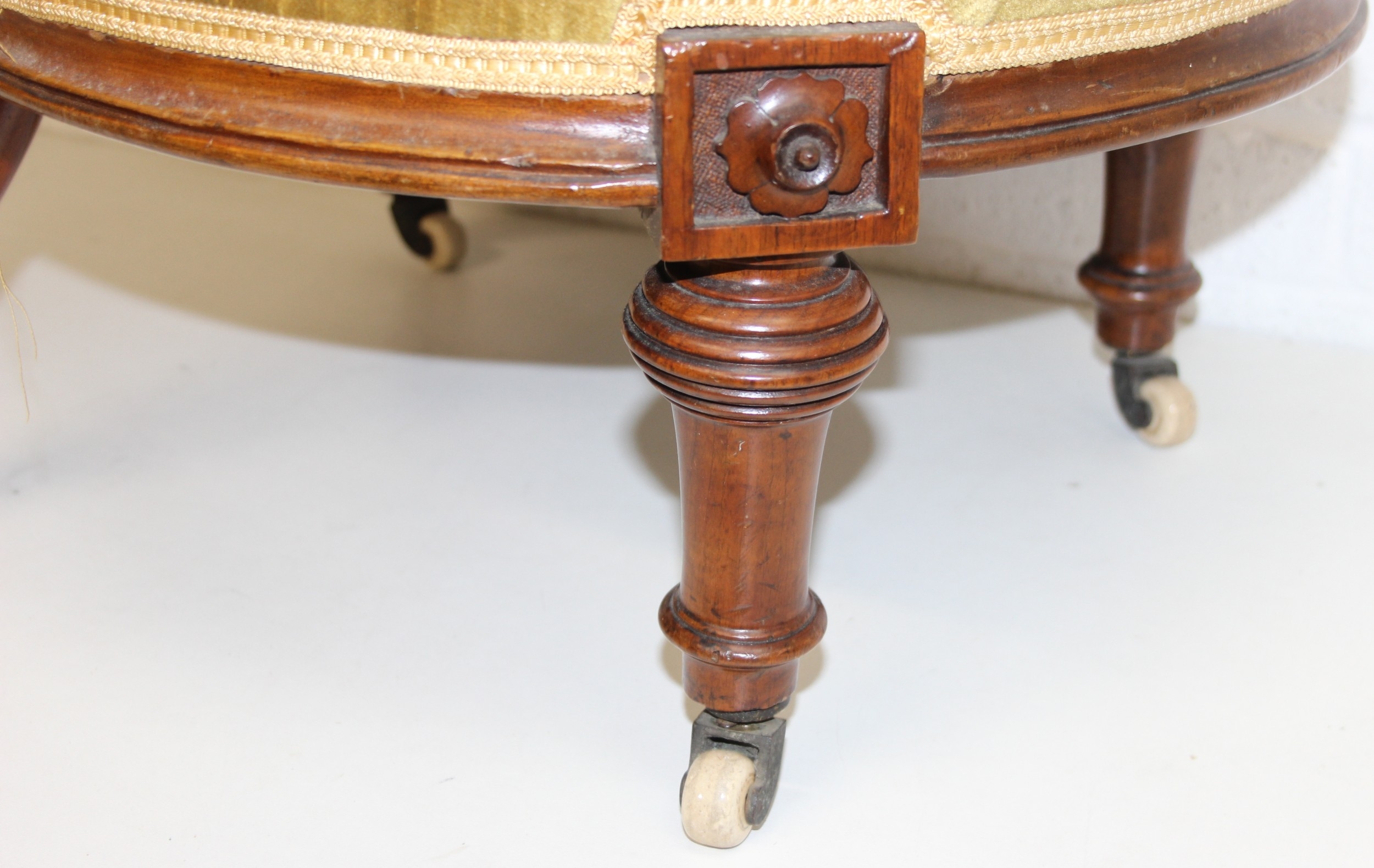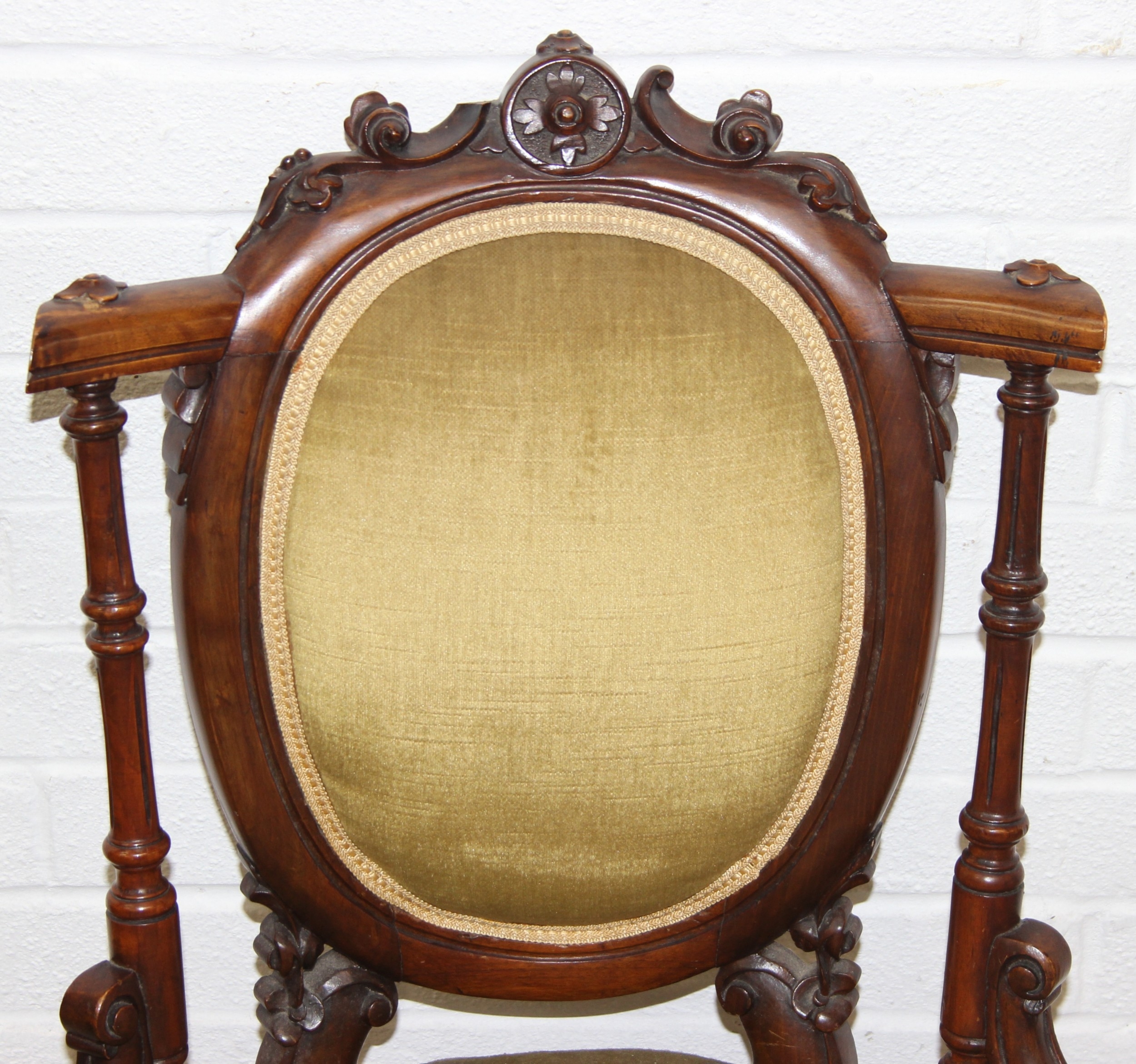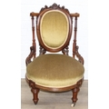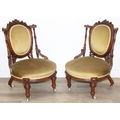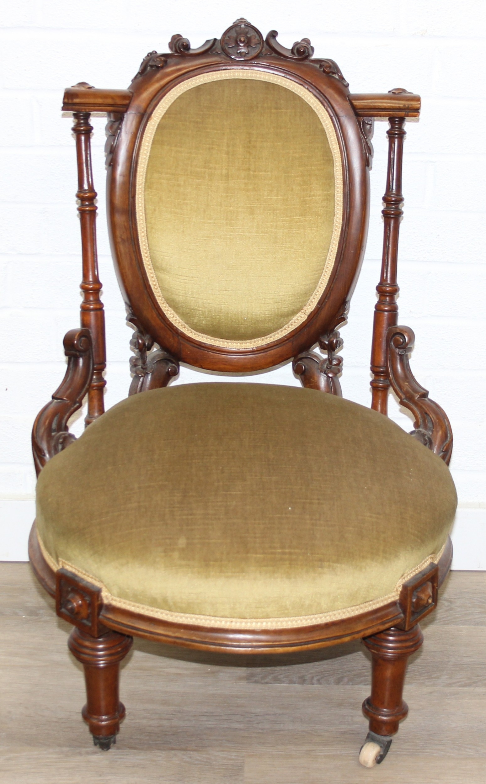 A pair of decorative shield back armchairs with exposed carved frames and ceramic castors, 19th century, with green upholstery, each 77cm tall