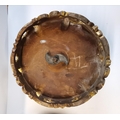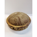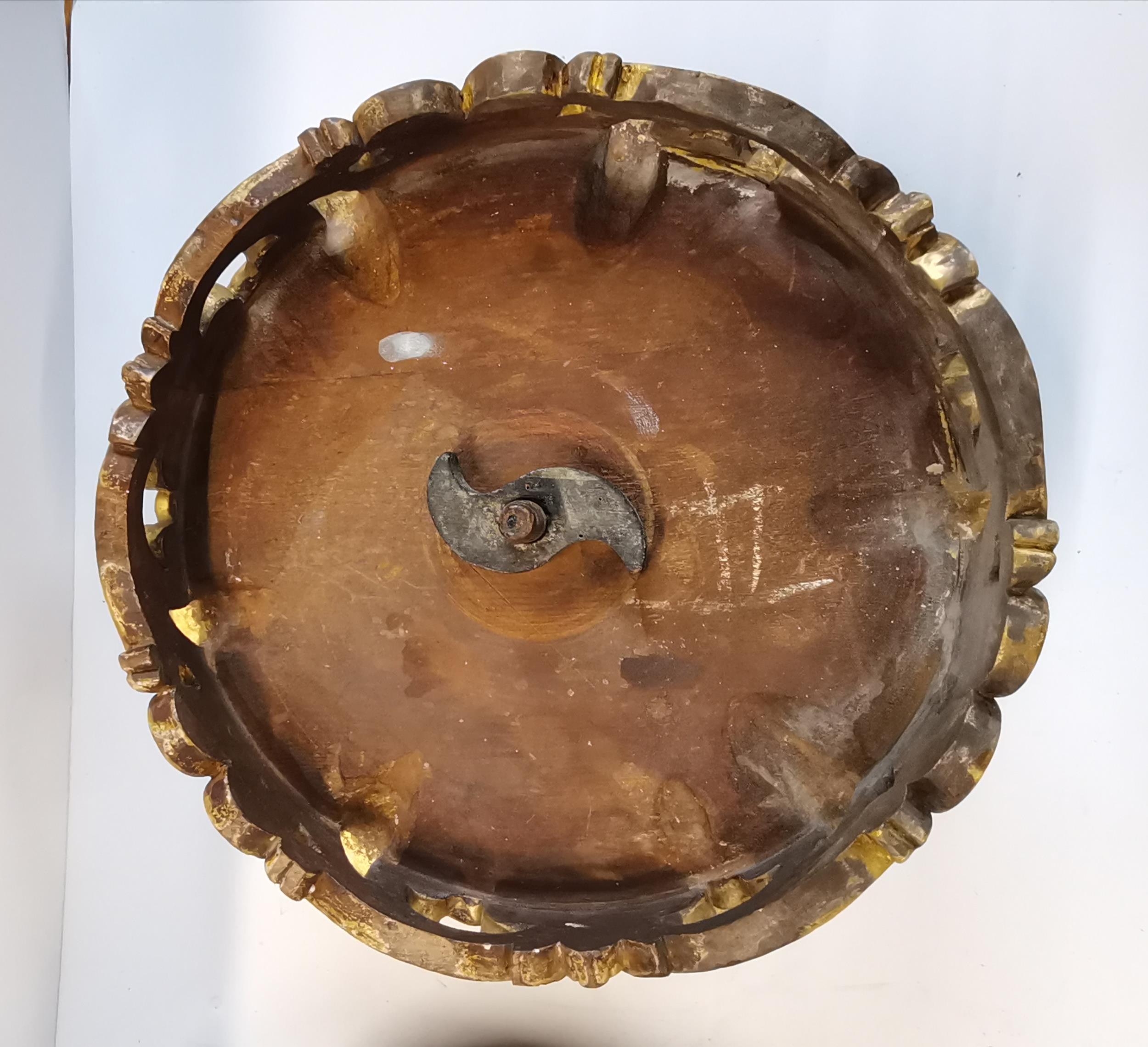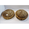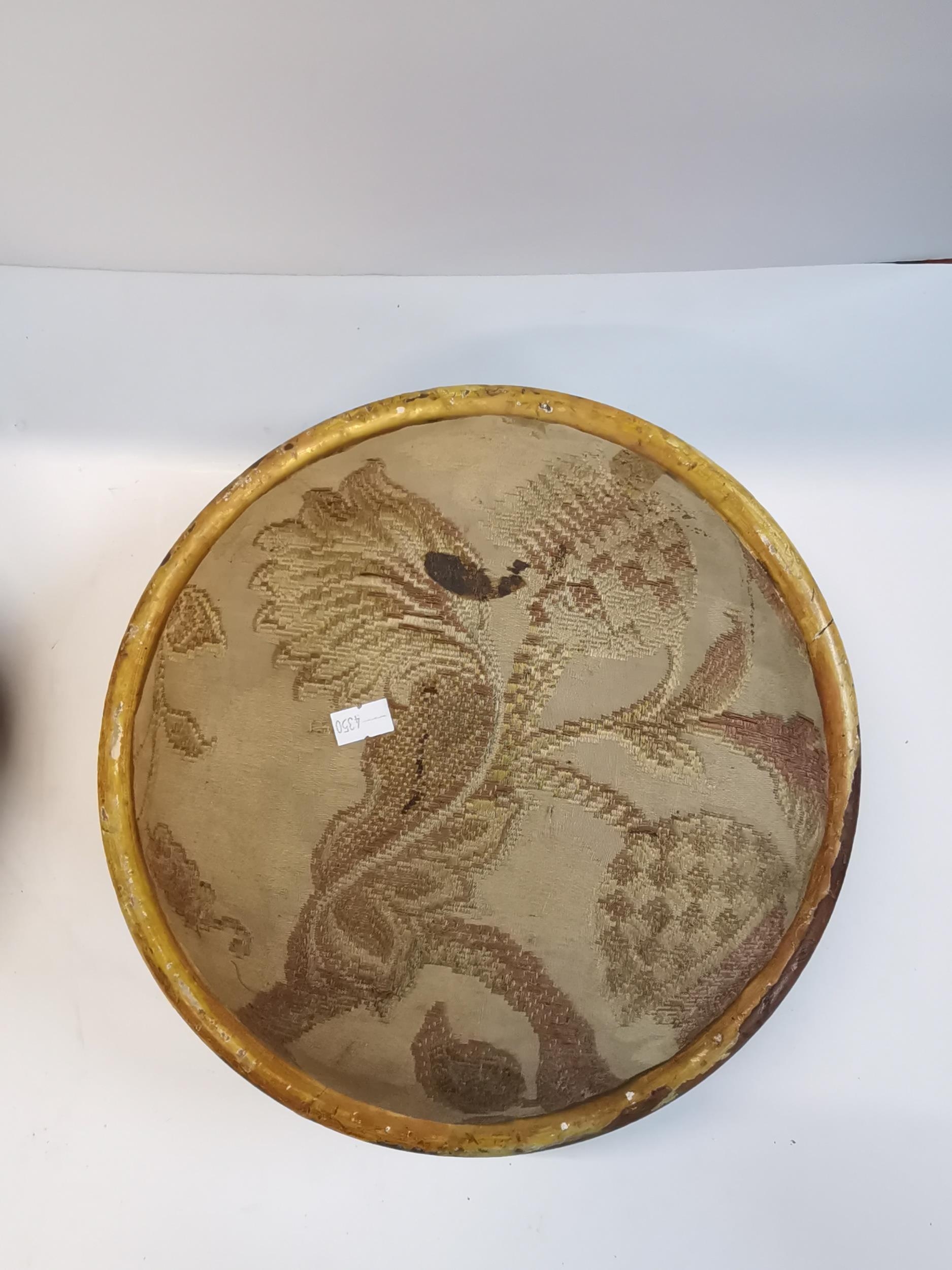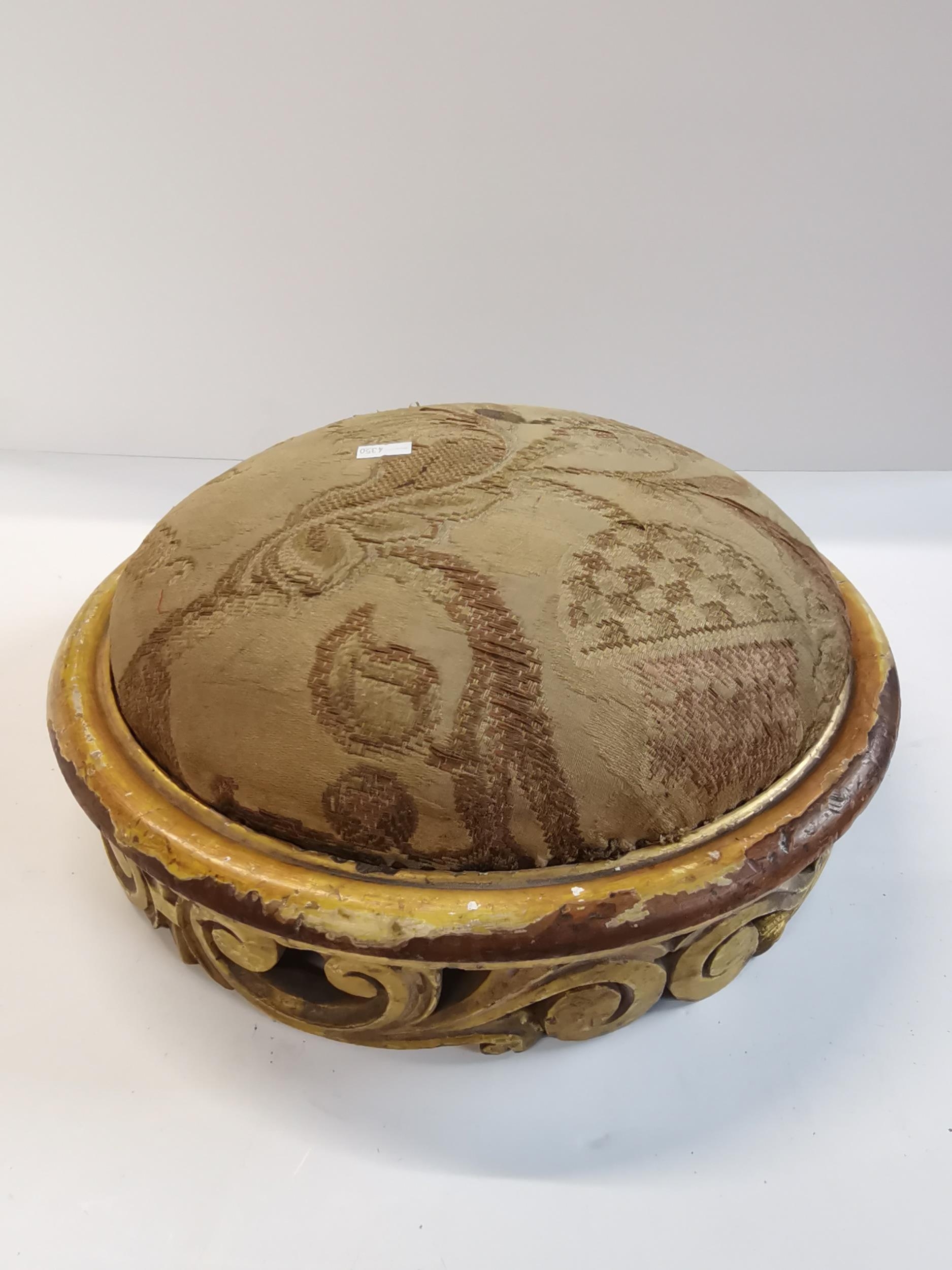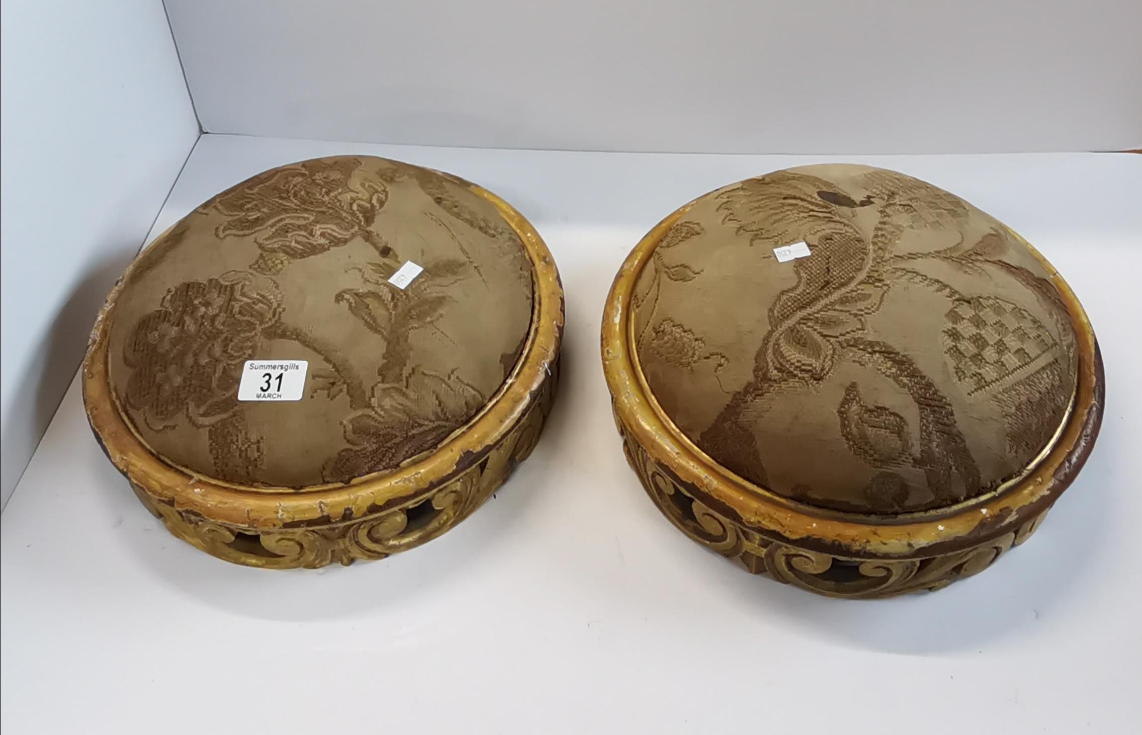 Pair of antique ornate carved wooden footstools with upholstered tops in French style 32cm diamteter