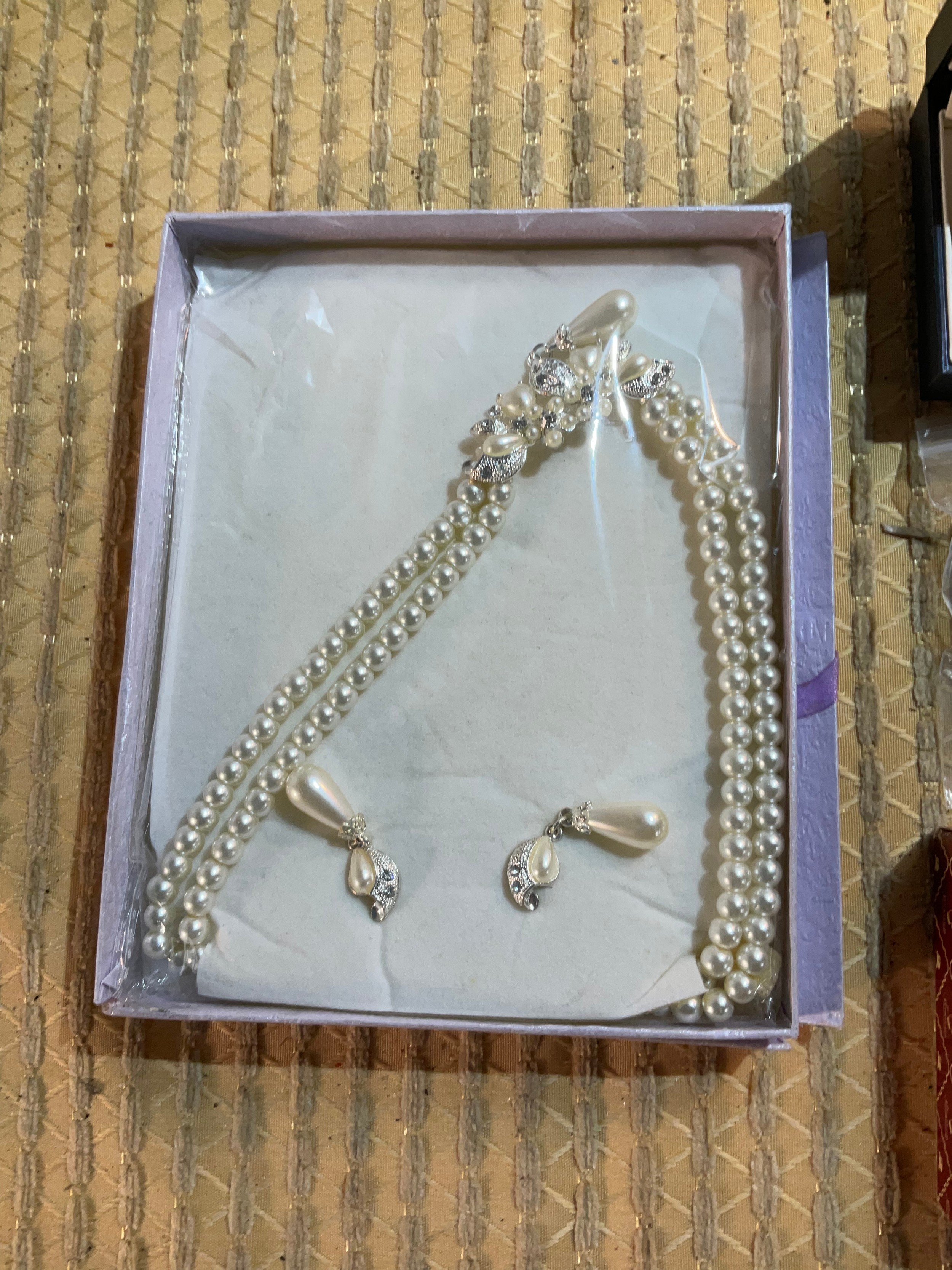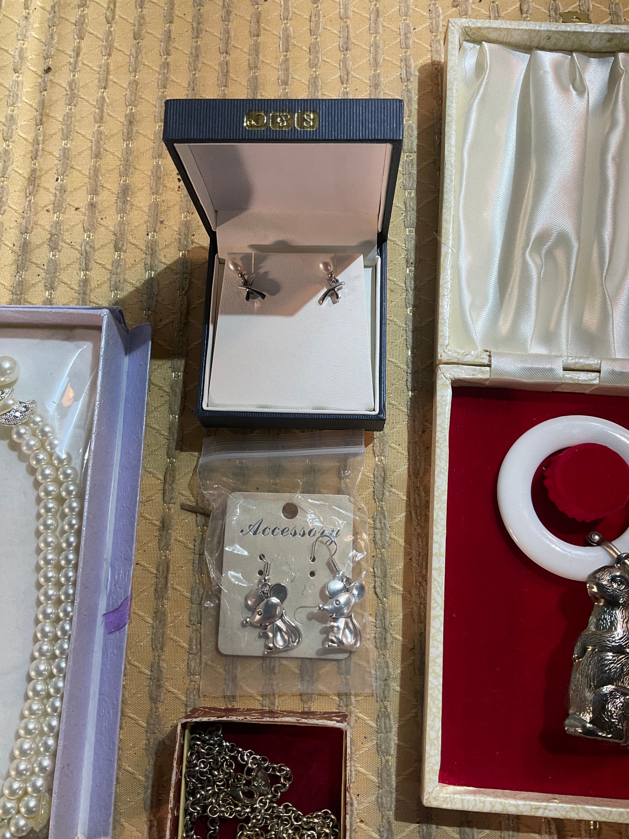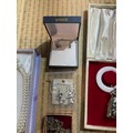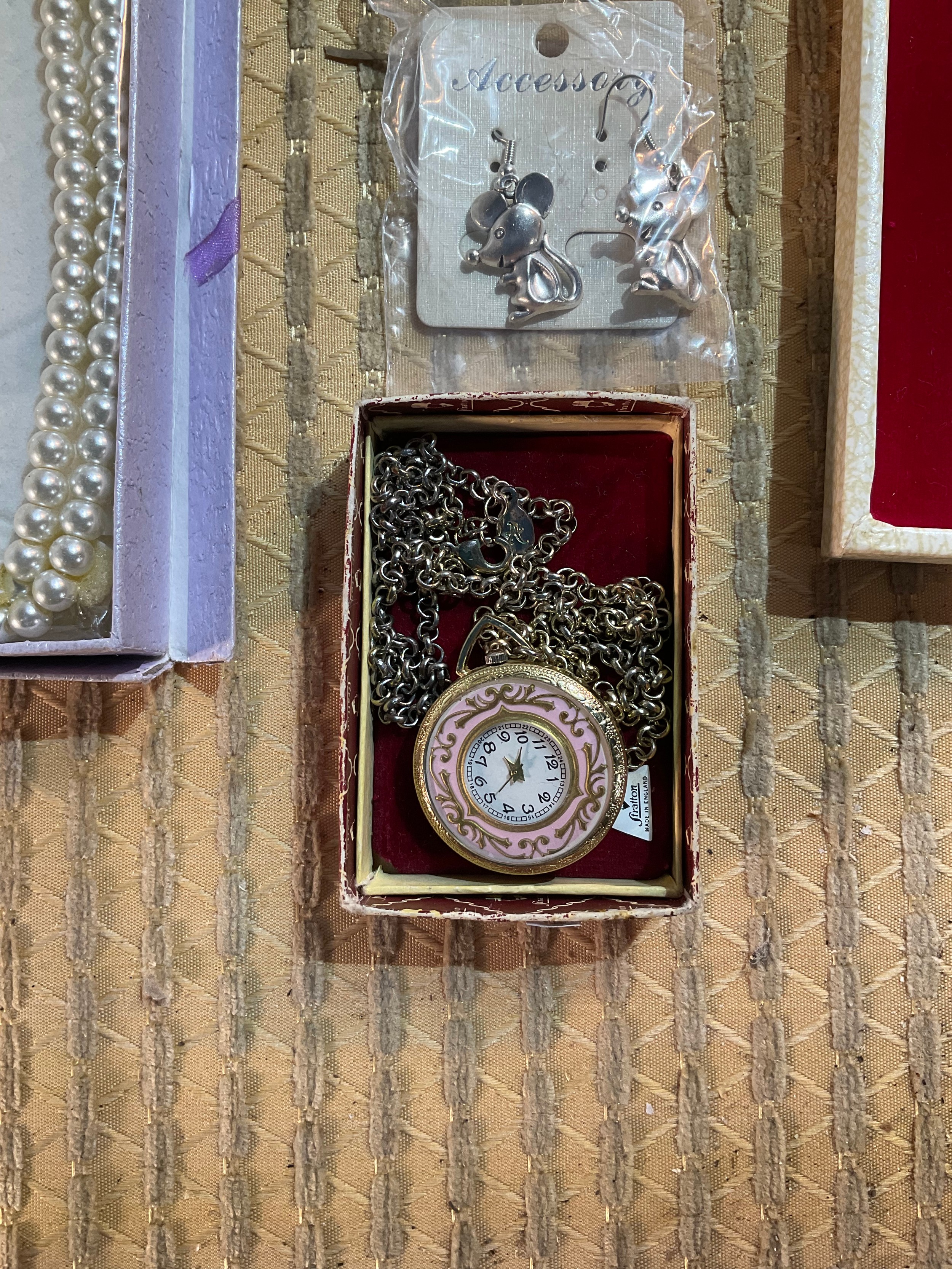 Quantity of costume jewellery inc ear rings, pearl necklace, Stratton pocket watch & more